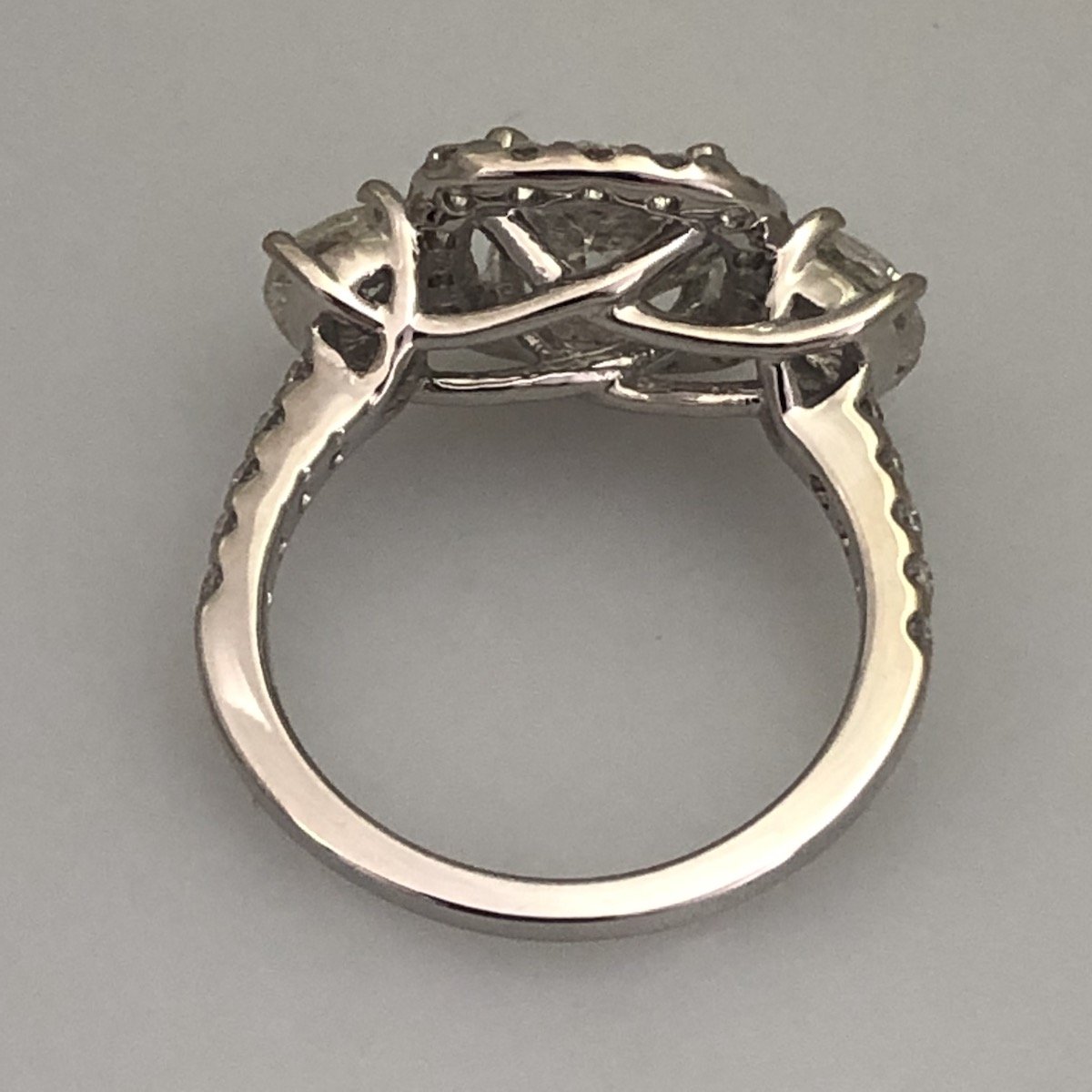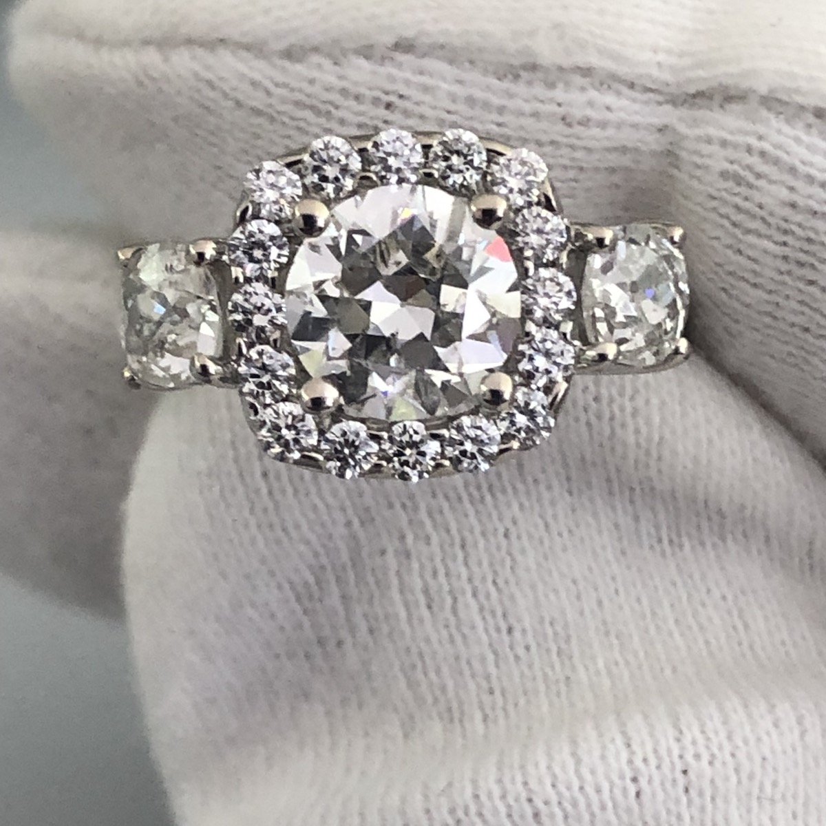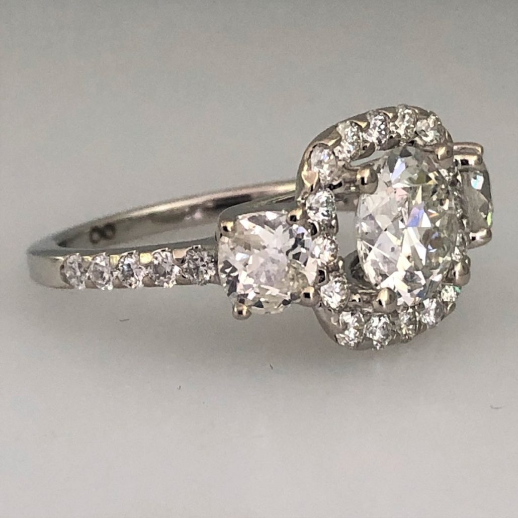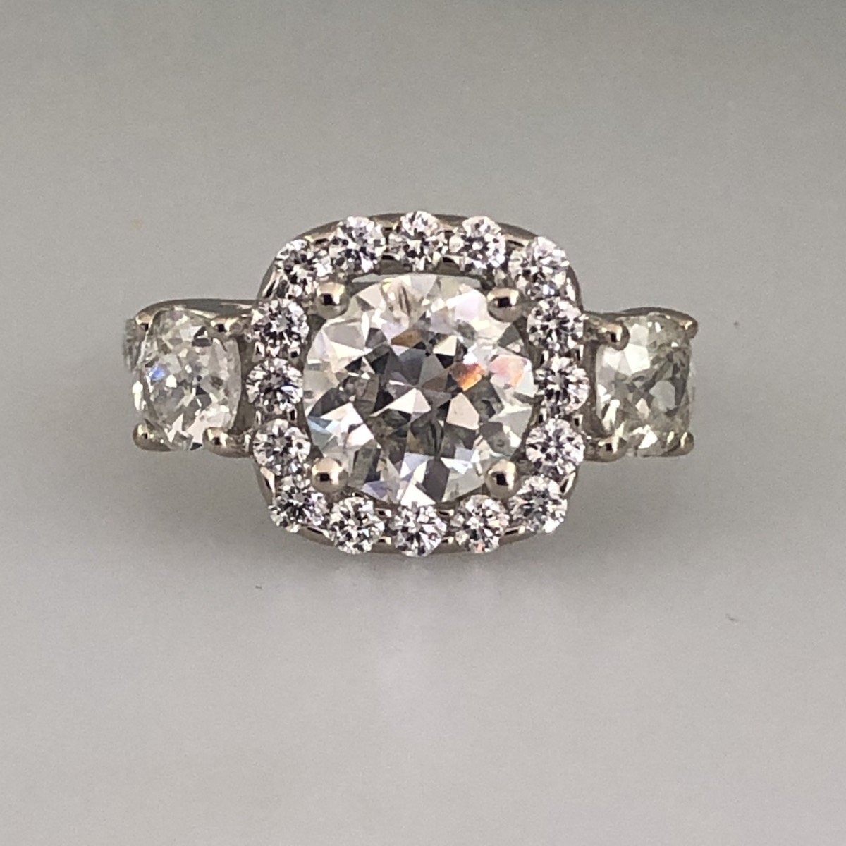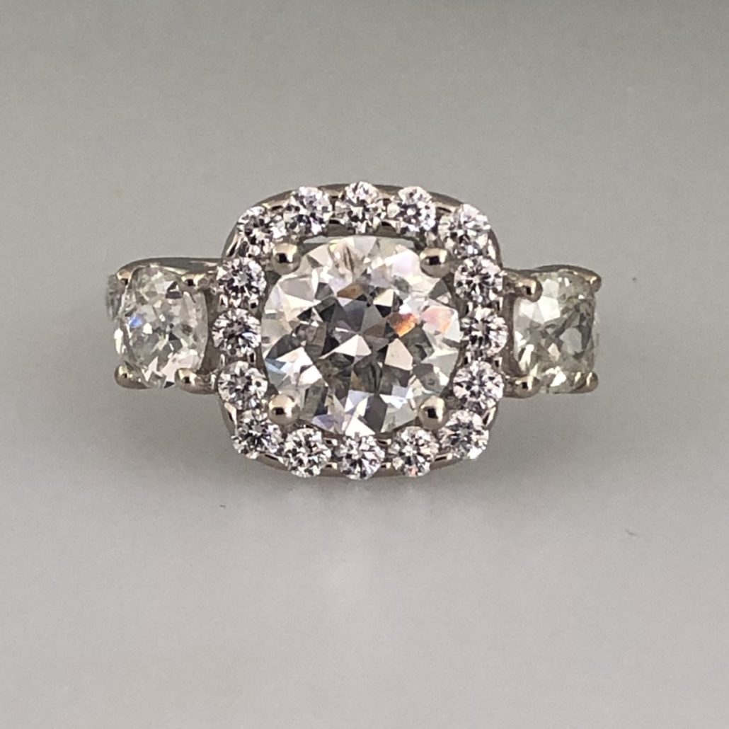 One of a kind, custom engagement ring with a center stone surrounded by a halo of smaller diamonds. Two side stones flank the halo and diamonds run down either side of the shank. These family diamonds decorate an 18K white gold open crossover gallery.