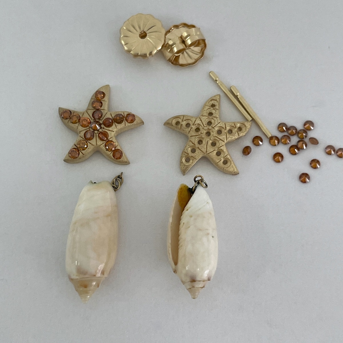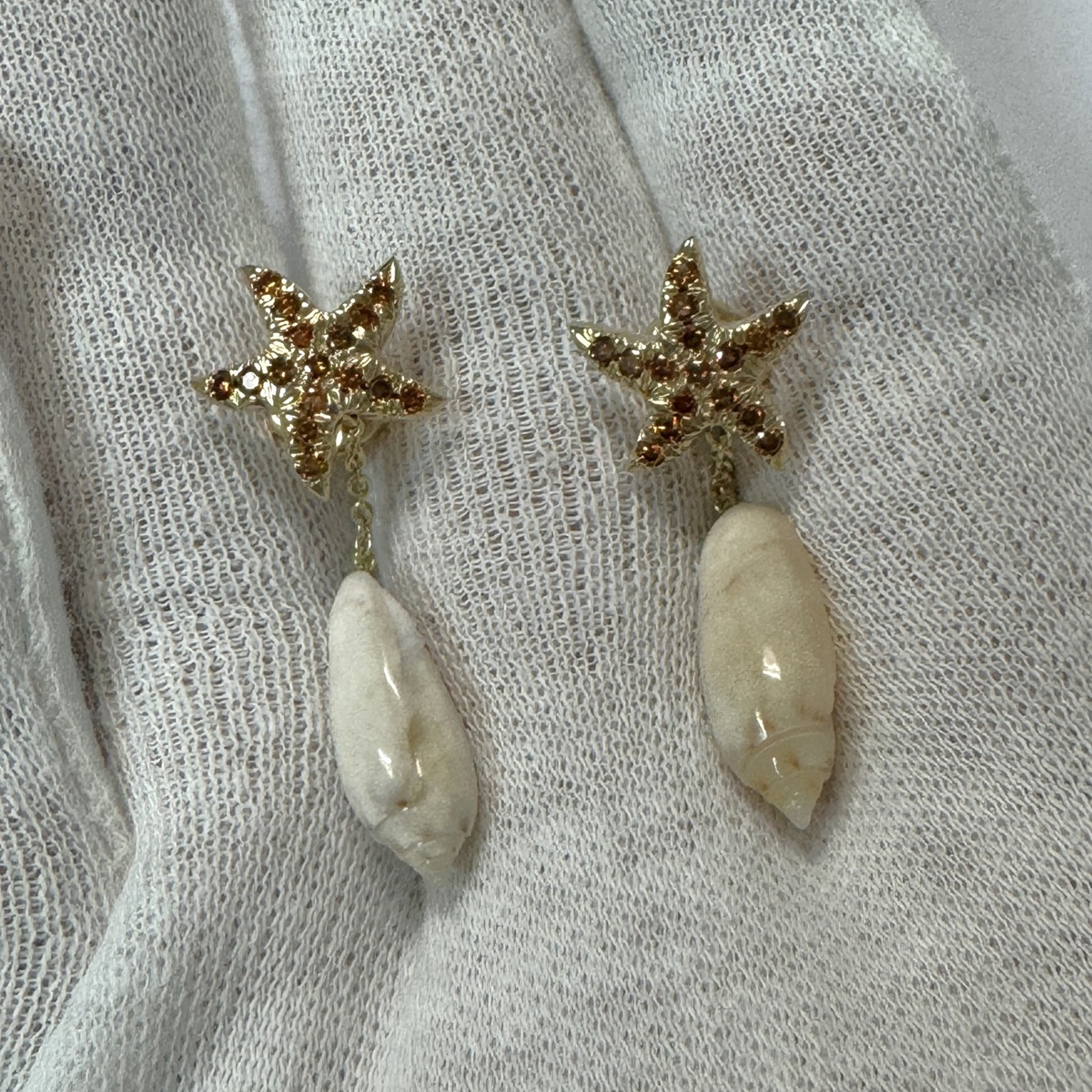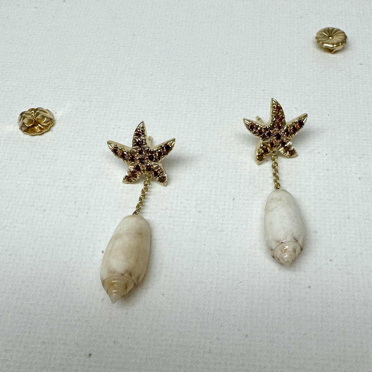 Each starfish anchors a delicate chain that suspends a natural seashell, creating a perfect balance of elegance and earthy beauty.