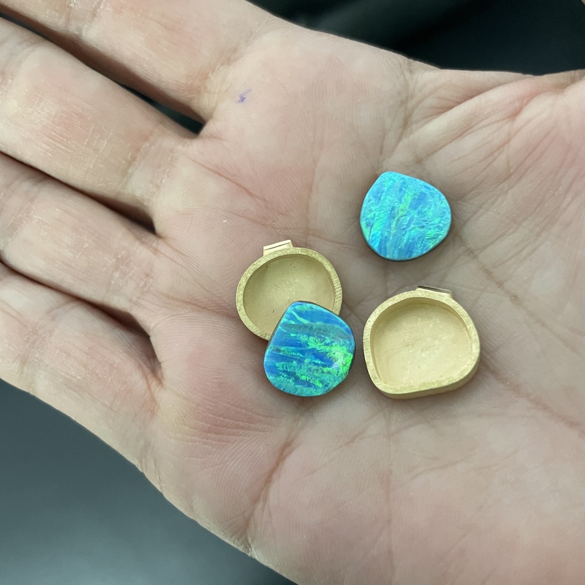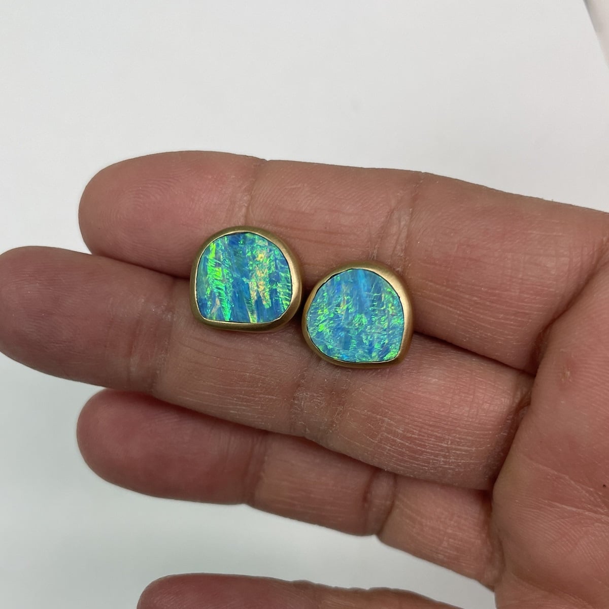 This pair of earrings of earrings are made with 18k yellow gold and custom bezel set with natural opals.