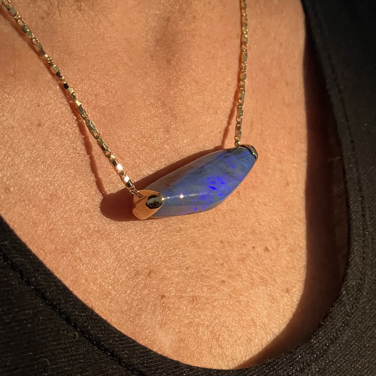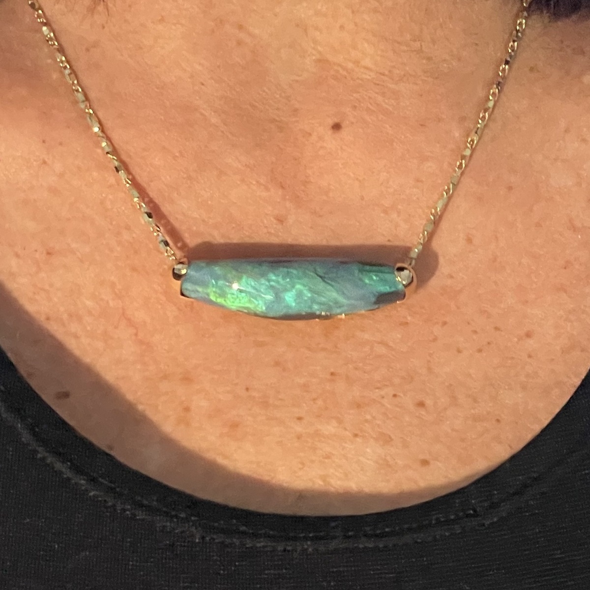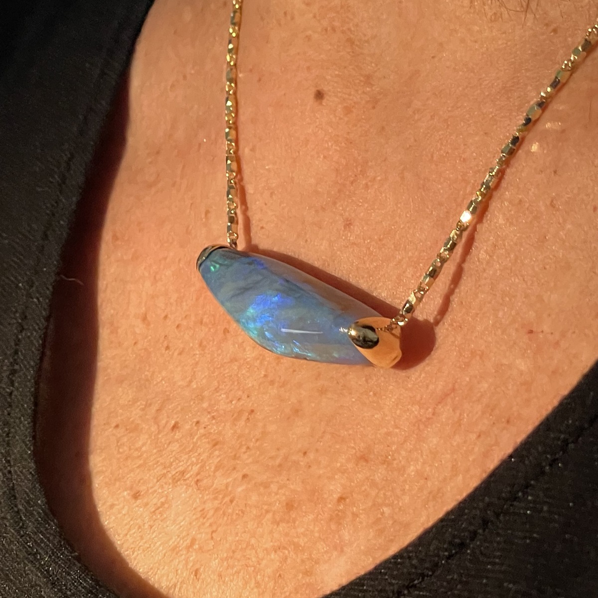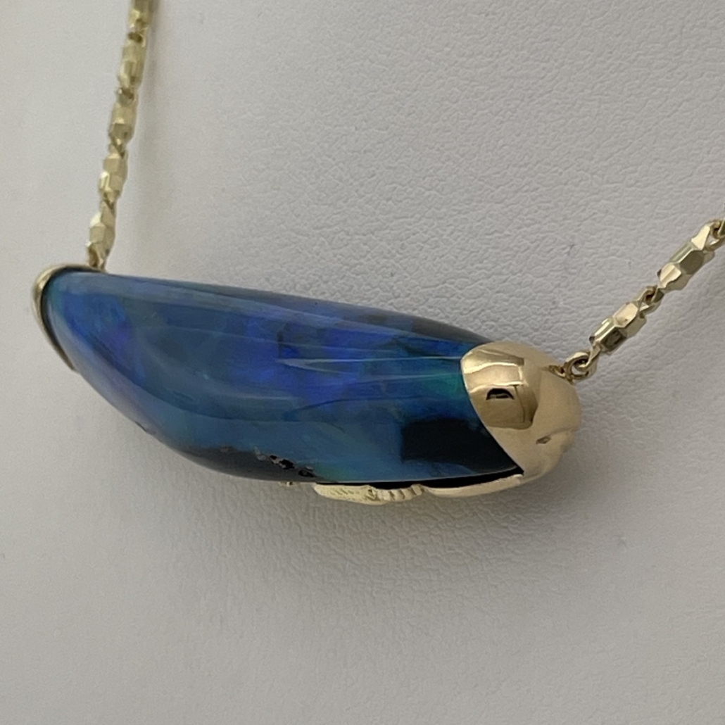 This striking necklace features a freeform black opal that glows with deep ocean blues and verdant greens—each angle revealing a new play of natural color. A true two-in-one heirloom—organic, expressive, and entirely original.