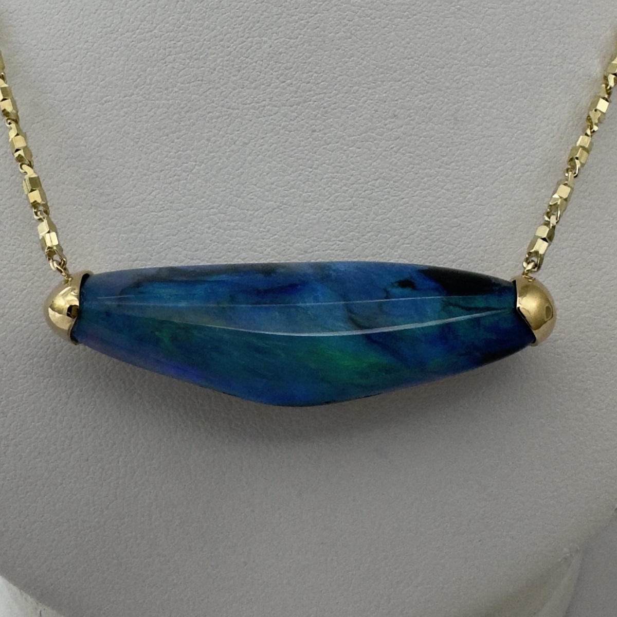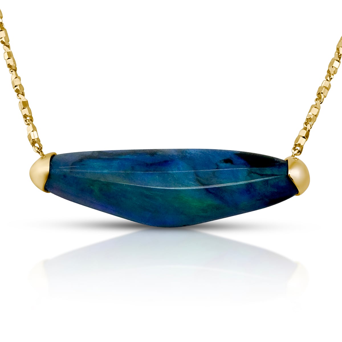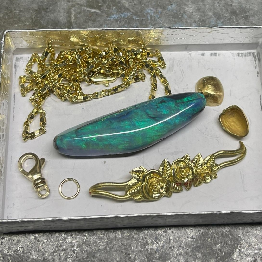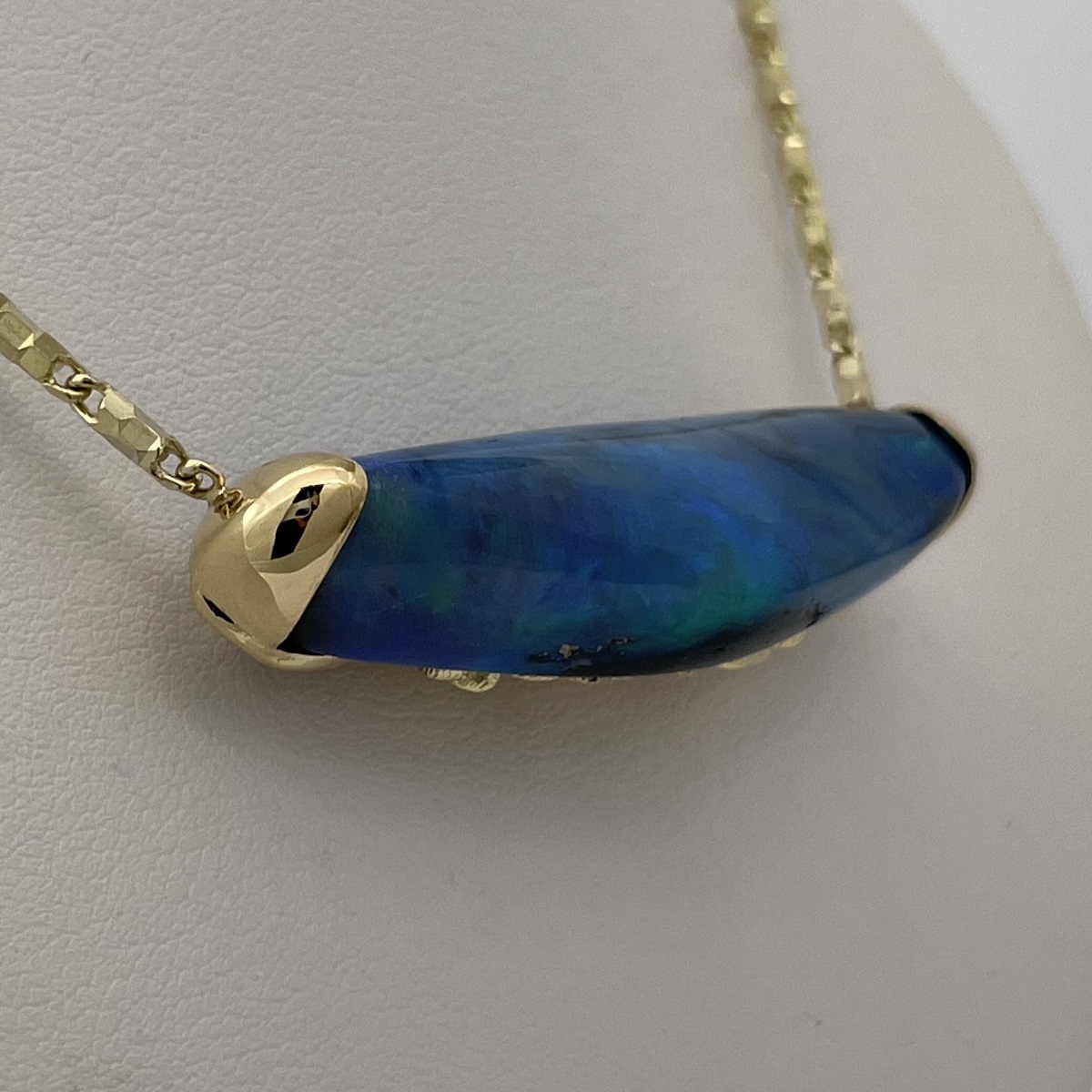 This striking necklace features a freeform black opal that glows with deep ocean blues and verdant greens—each angle revealing a new play of natural color. A true two-in-one heirloom—organic, expressive, and entirely original.
