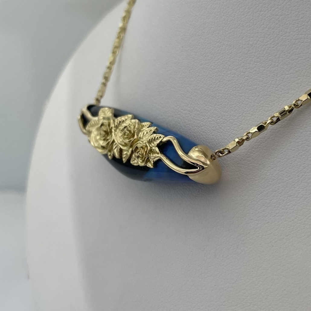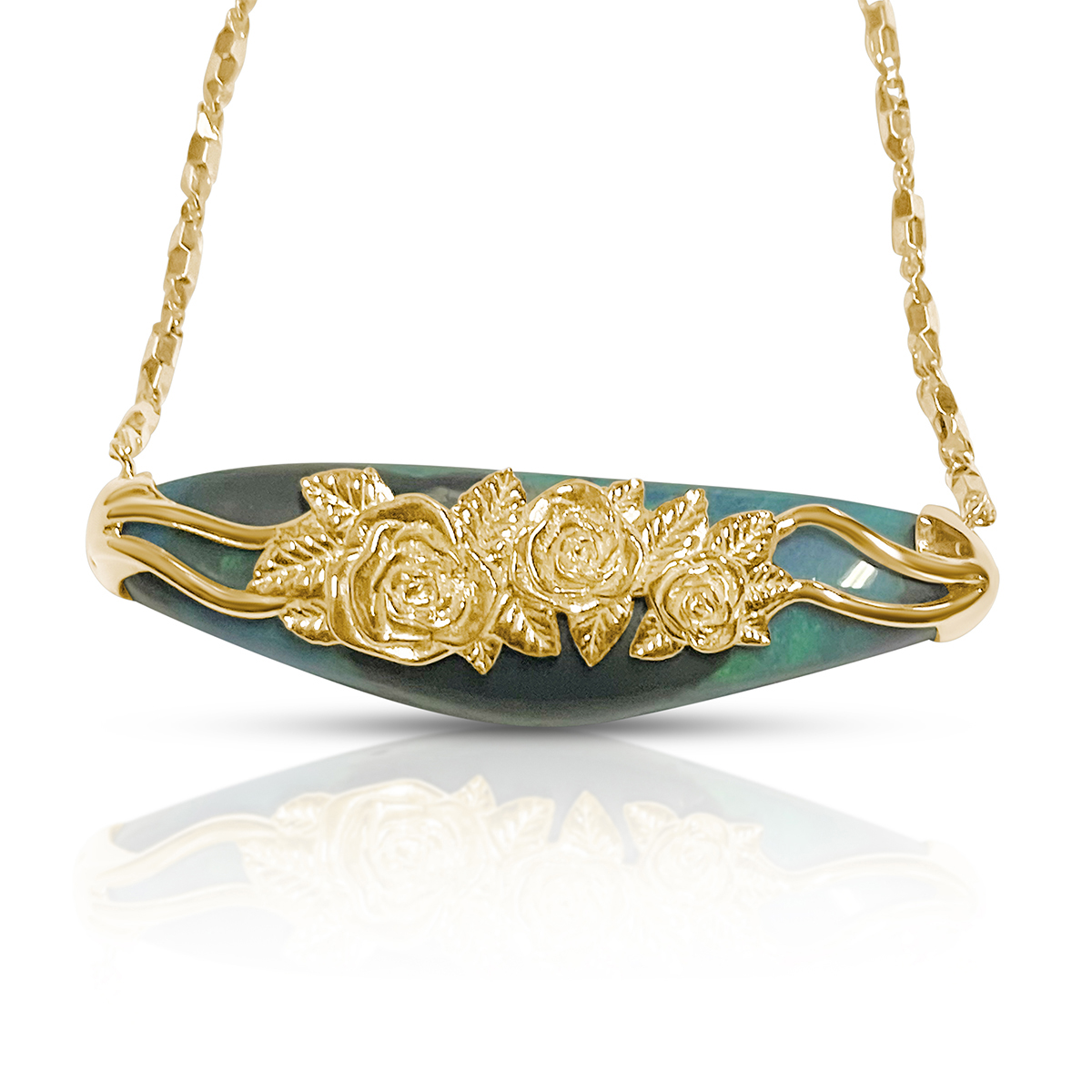 Hand-carved and set in a custom 18k gold mounting, one side is elegantly minimalist, while the reverse bursts into full bloom with golden roses and leaves lovingly crafted by hand.
