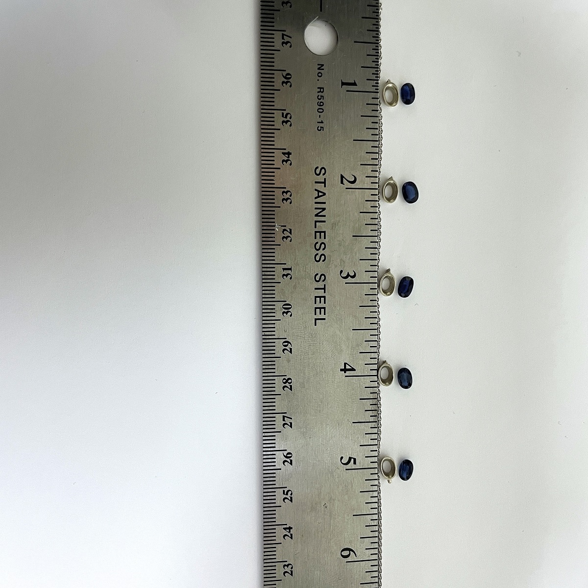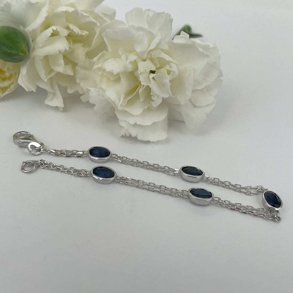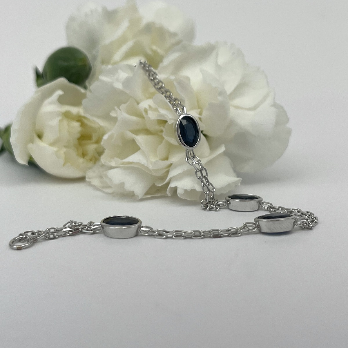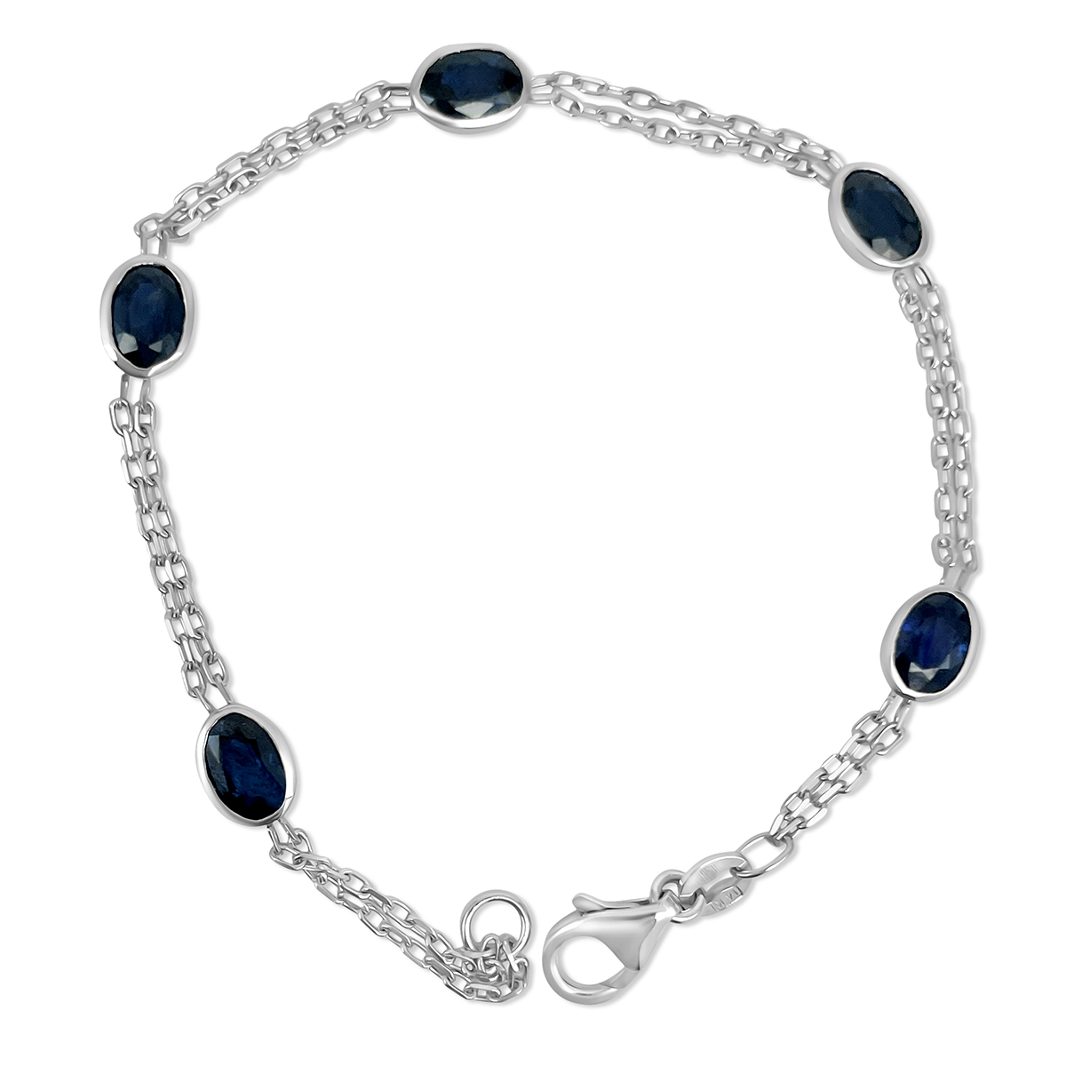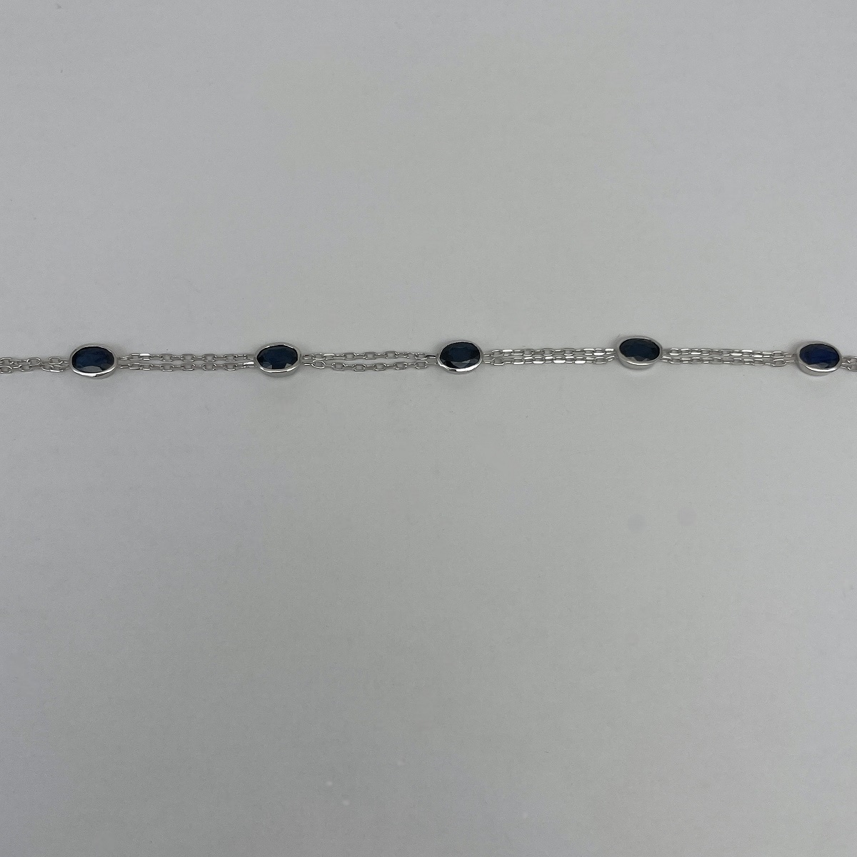 Five oval deep blue sapphires set in polished white gold, linked with a double chain for a look that’s elegant and versatile.