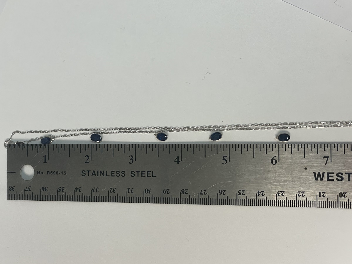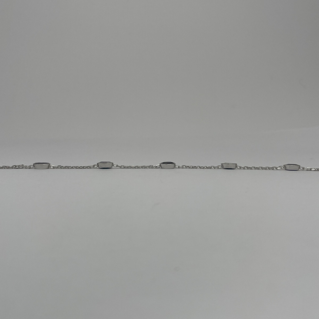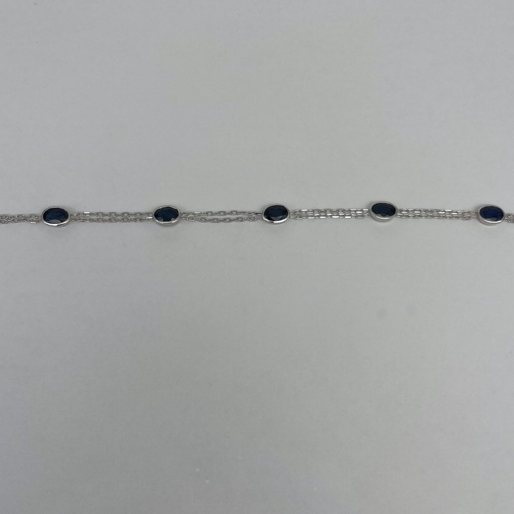 This chain bracelet features natural mined oval sapphires set in 14k white gold.