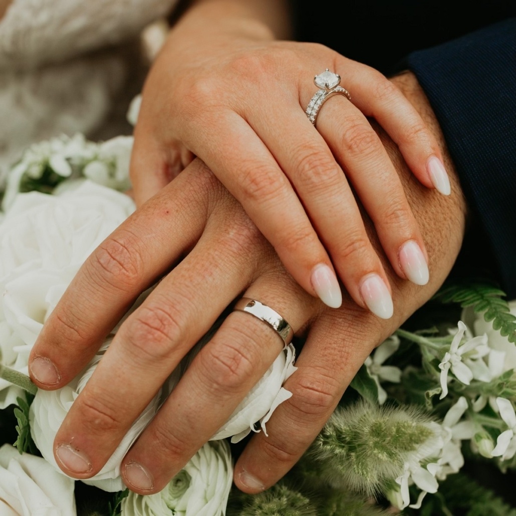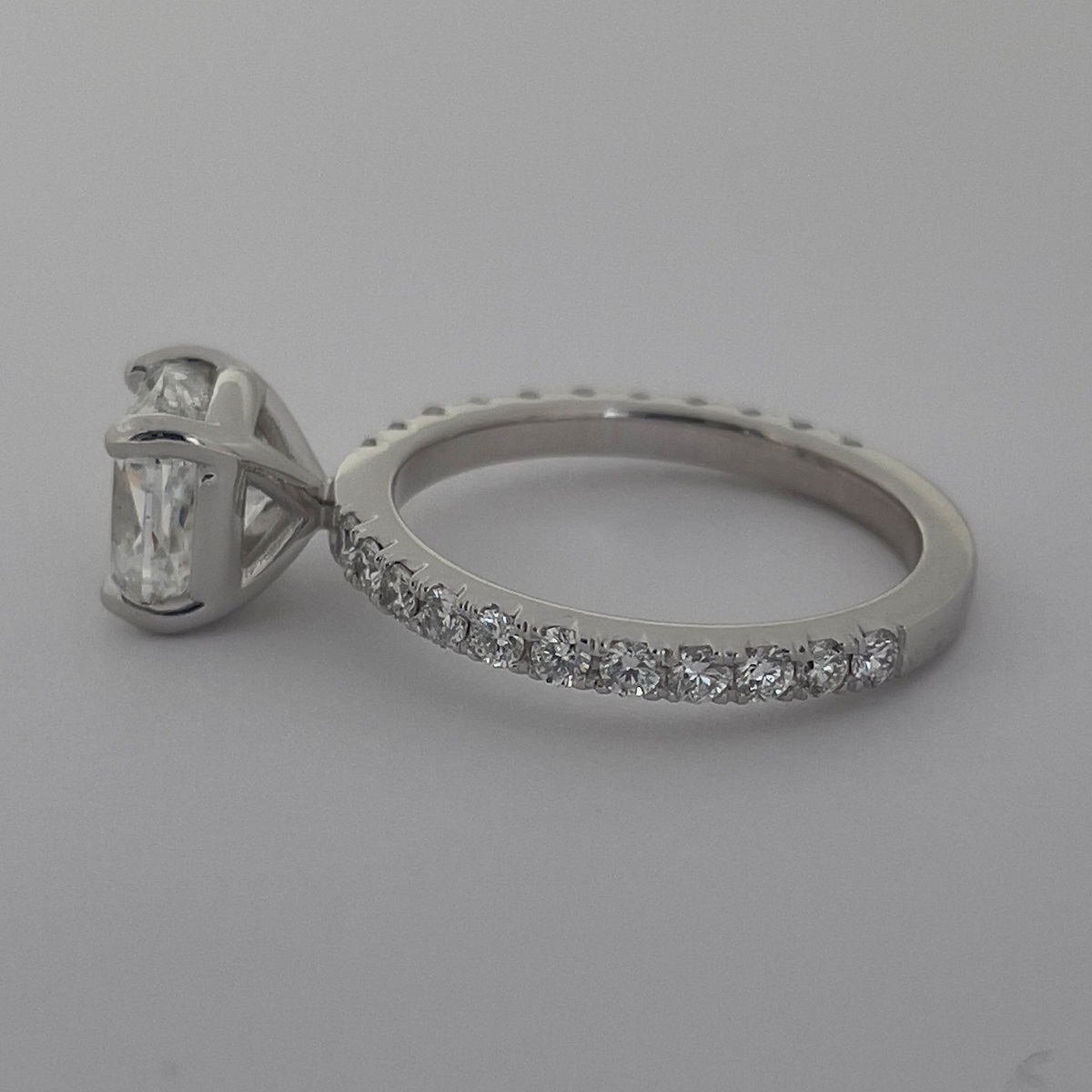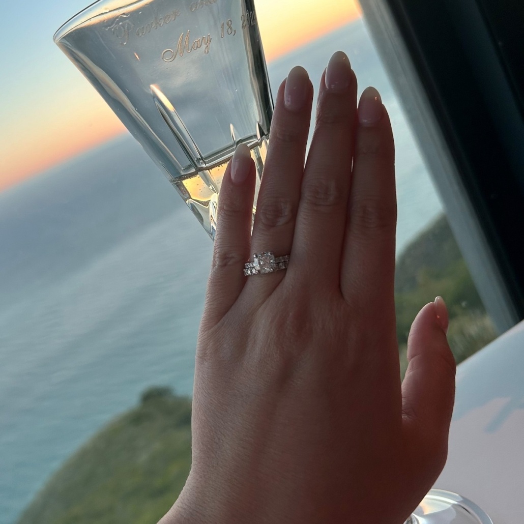 An elegant platinum and diamond engagement ring with an eternity band, inspired by Parker’s love for Madison.