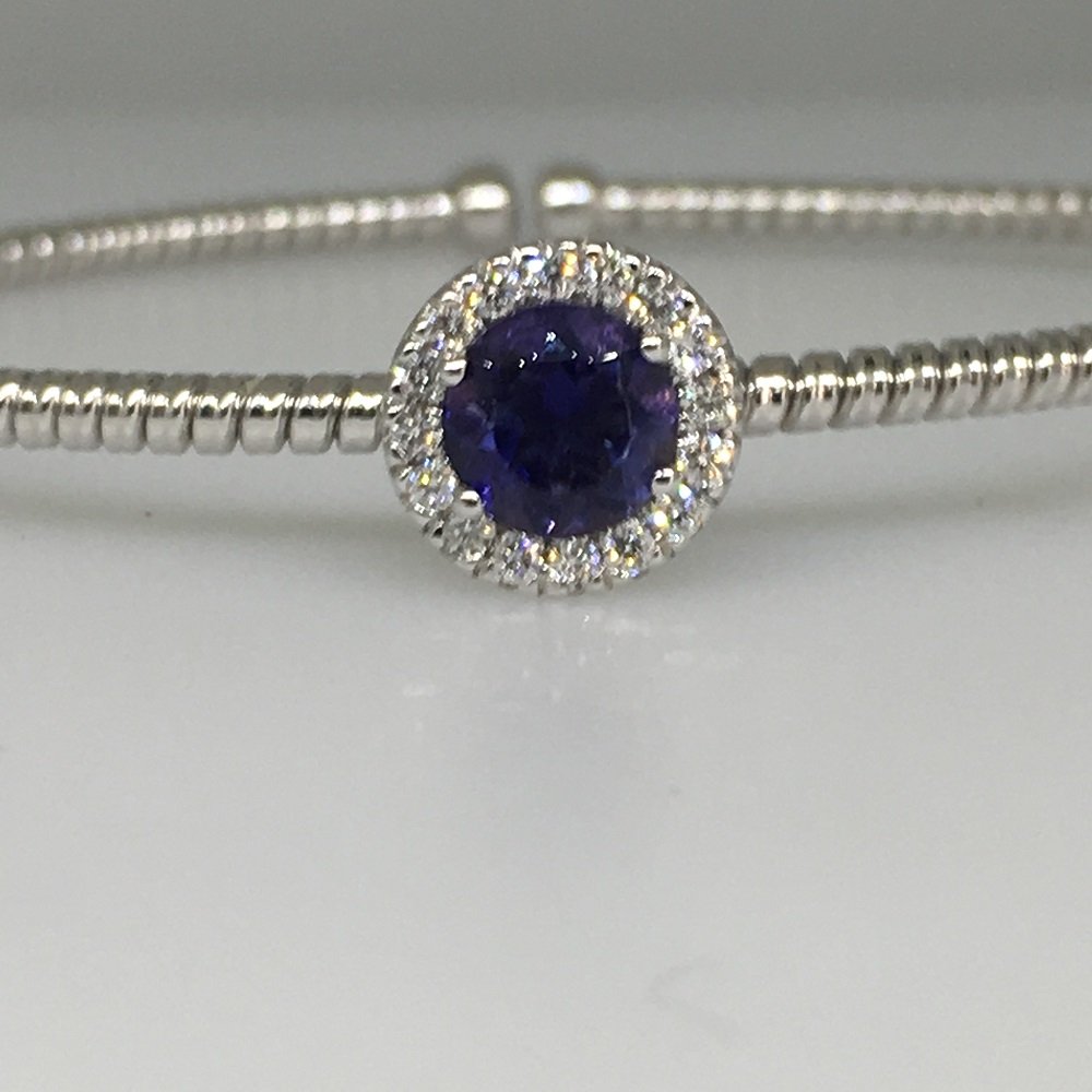 This flexible cuff bracelet is made with 18k white gold and set with heat treated purple sapphire surrounded by a halo of shared prongs diamonds. The bracelet is a coil link design. It stretches open and closes automatically.