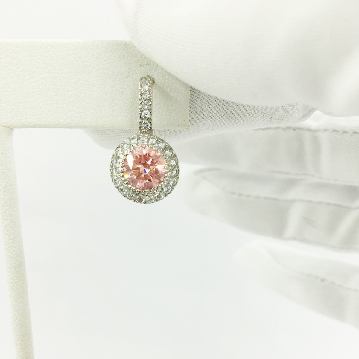 Tags 14k White, Desire, Diamond, drop, Earring, Halo, Lever Back, Pink