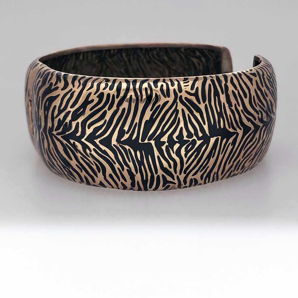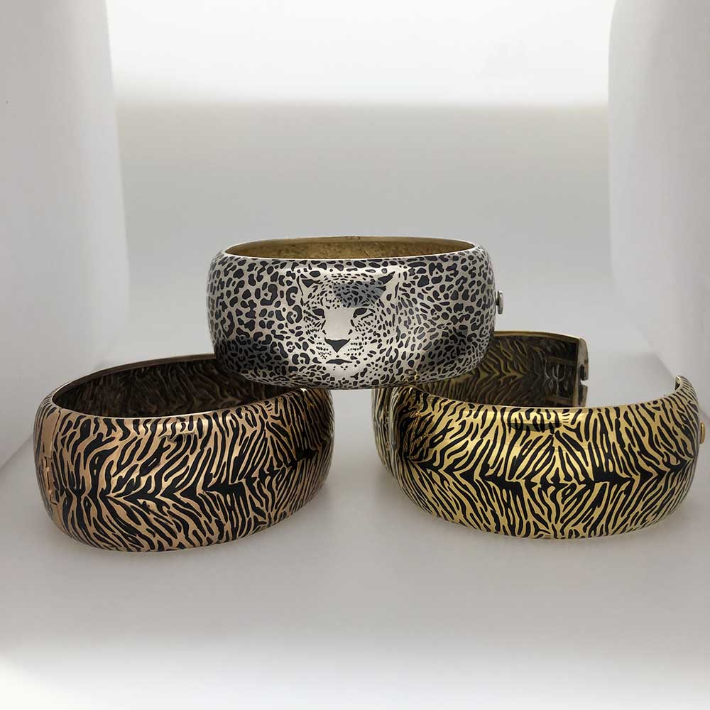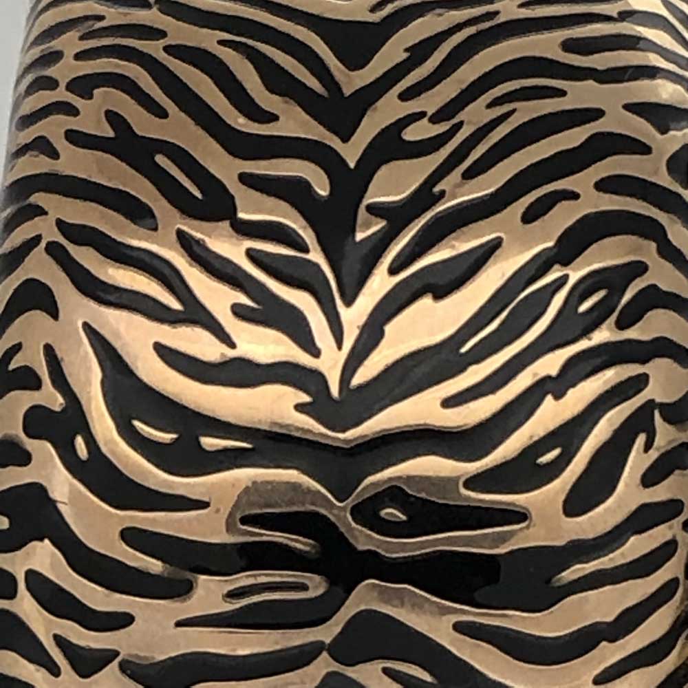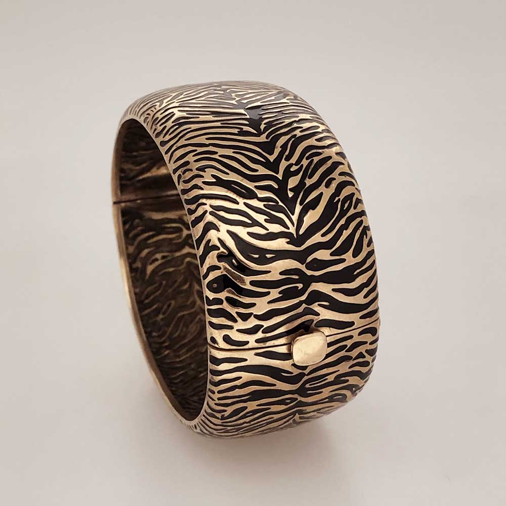 Tags Contemporary Cuff Bracelet, One of A Kind Enamel, One-Of-A-Kind, Pink Gold Over Silver, Tiger Print Enamel Cuff