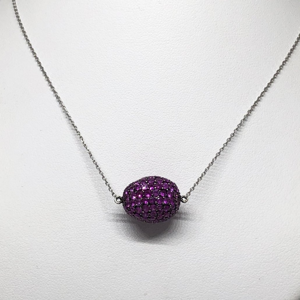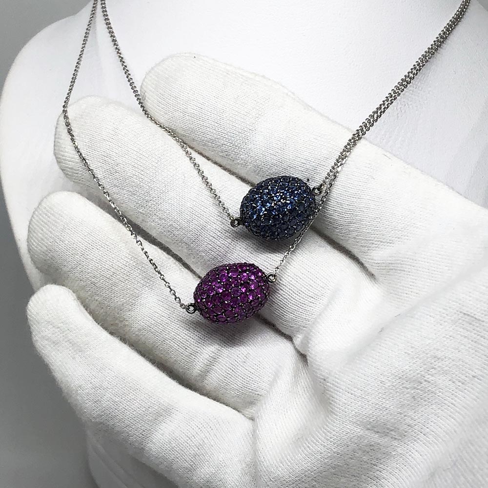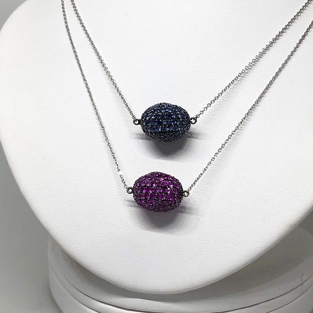 The Sapphire Egg Collection – Necklaces and Earrings in a rainbow of sapphire colors! Wear them on their own or layer, mix and match for a stunning look! Abstract with Black Rhodium details set in 14K White Gold. Inspired by Imperial Russian Jewelry, you have to see the whole collection!