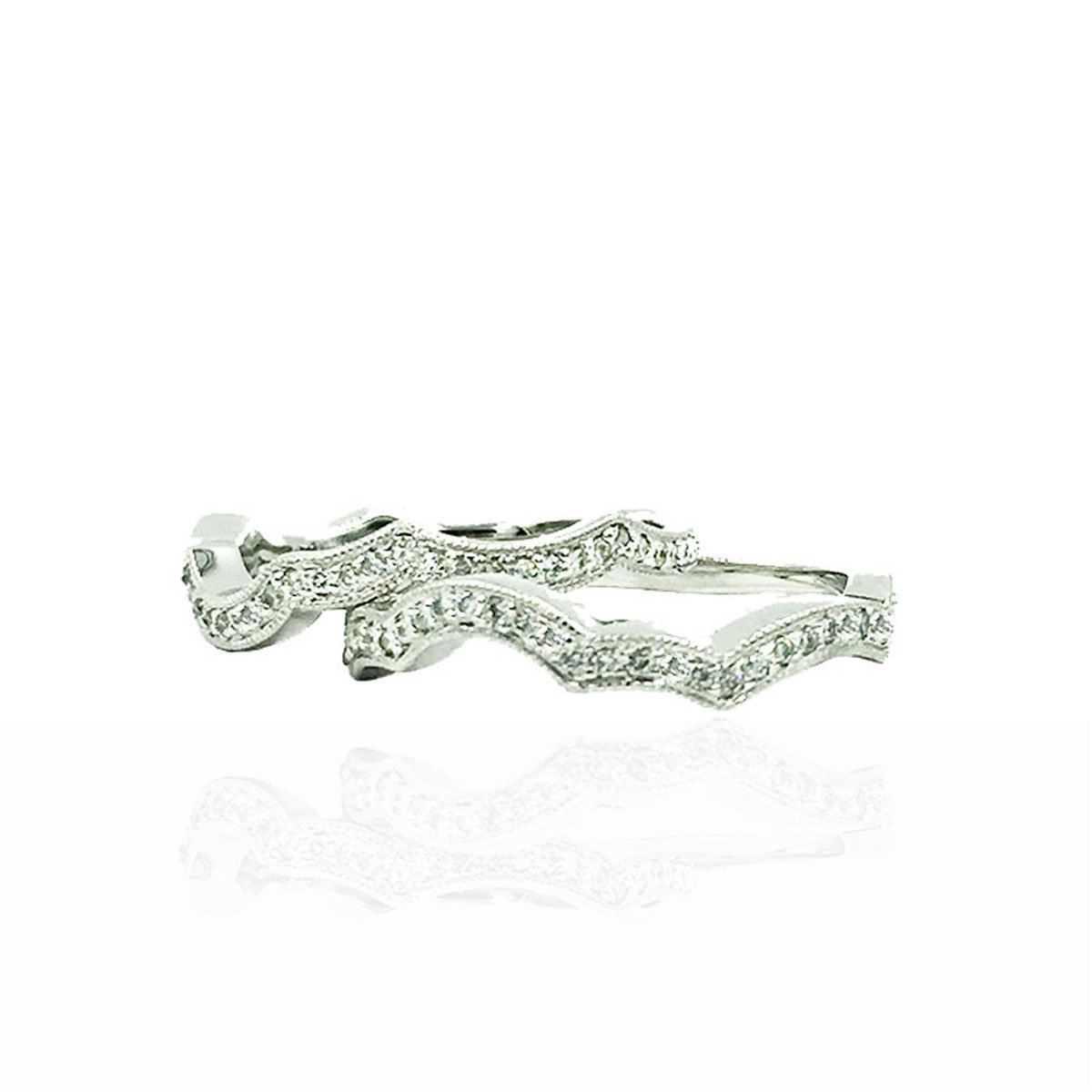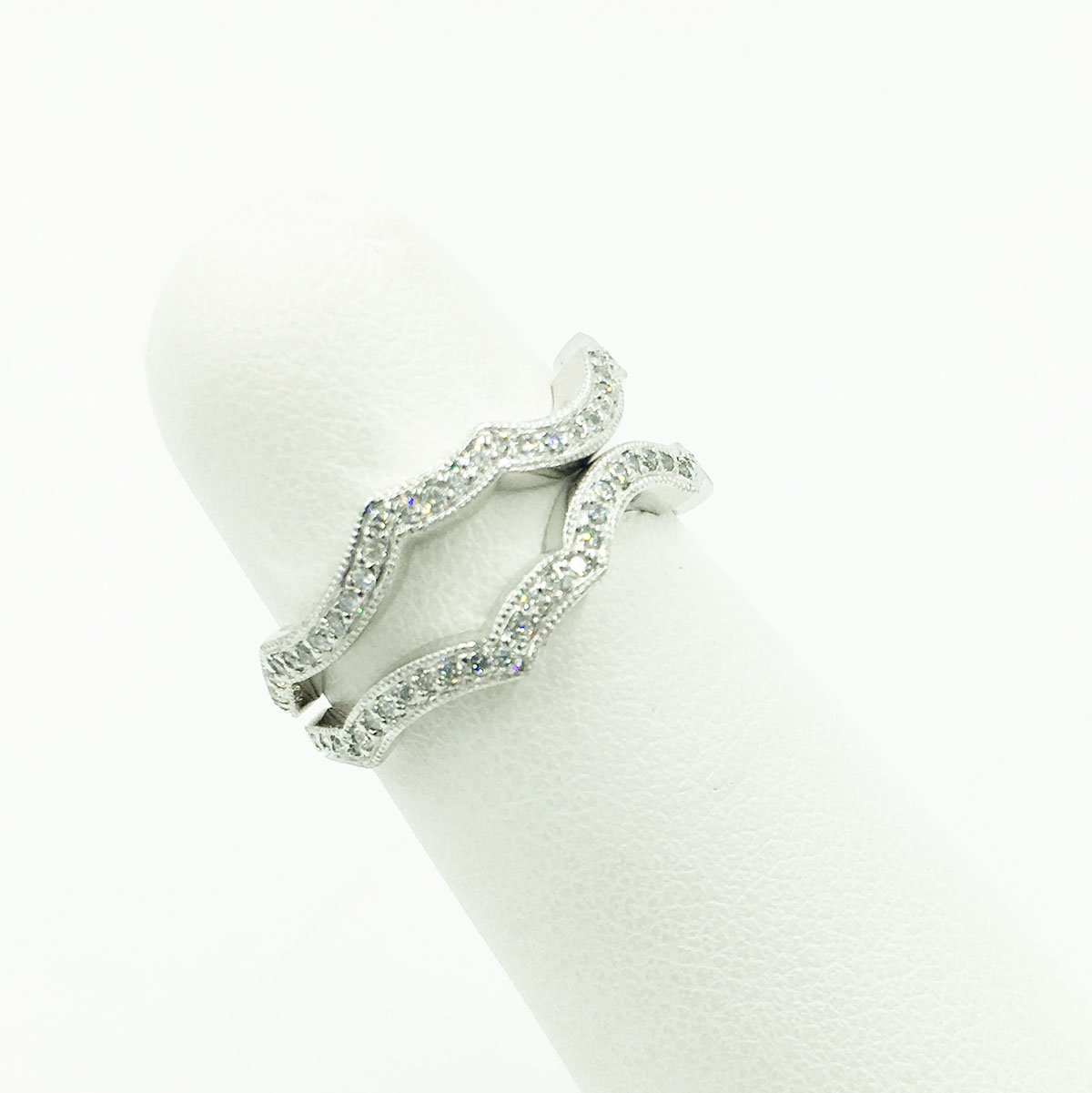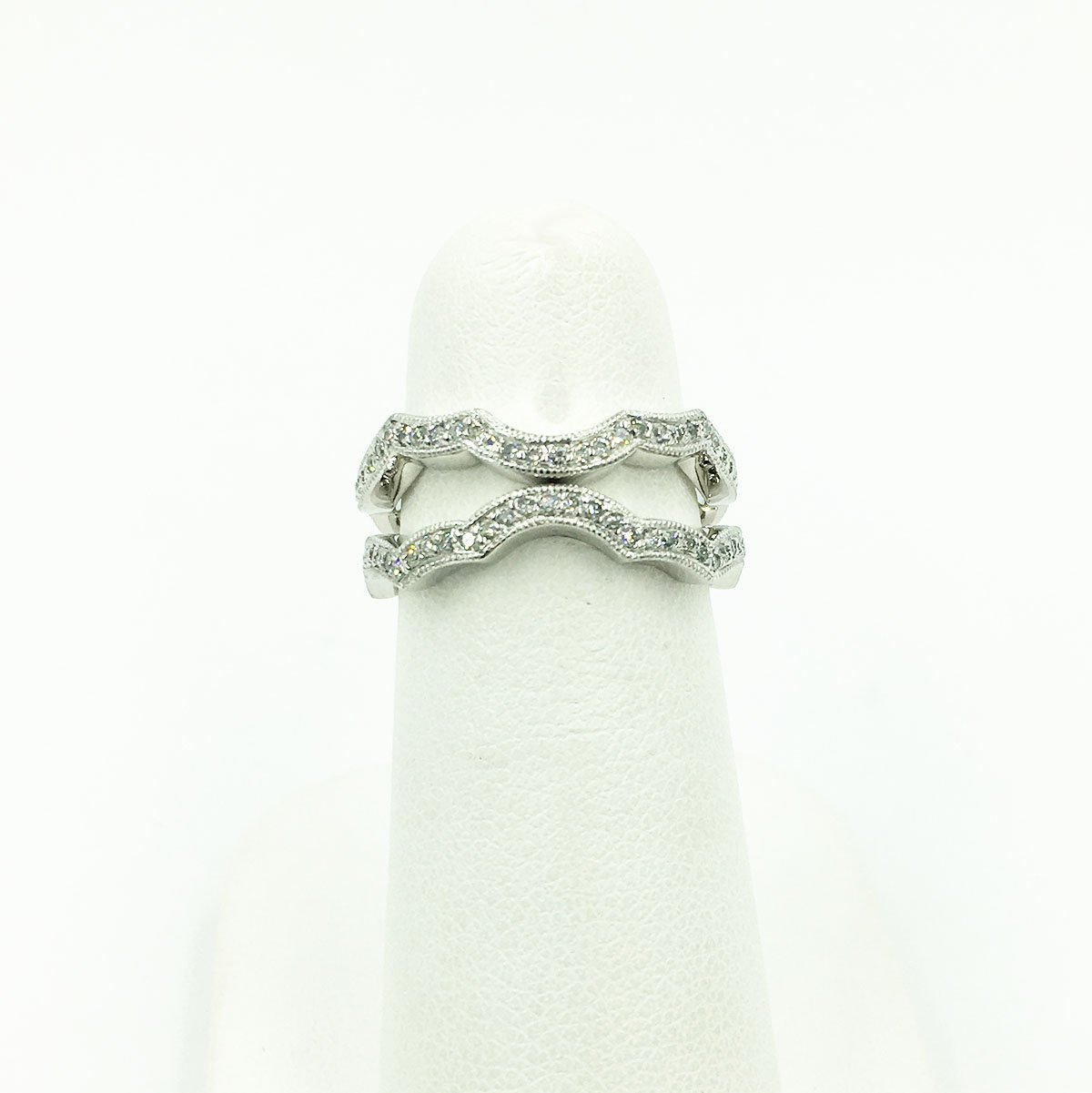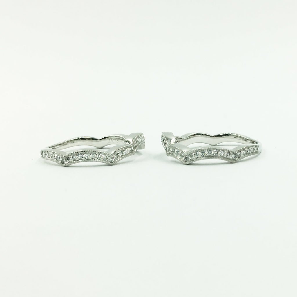 These platinum wedding bands were custom-made to fit around the bride’s engagement ring.  The bands feature a scalloped design to match the engagement ring, and have milgrain details. Natural round brilliant diamonds are prong set all the way around.