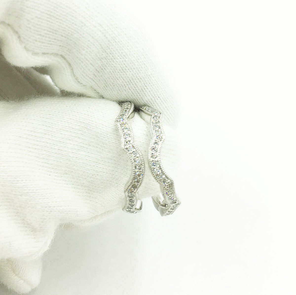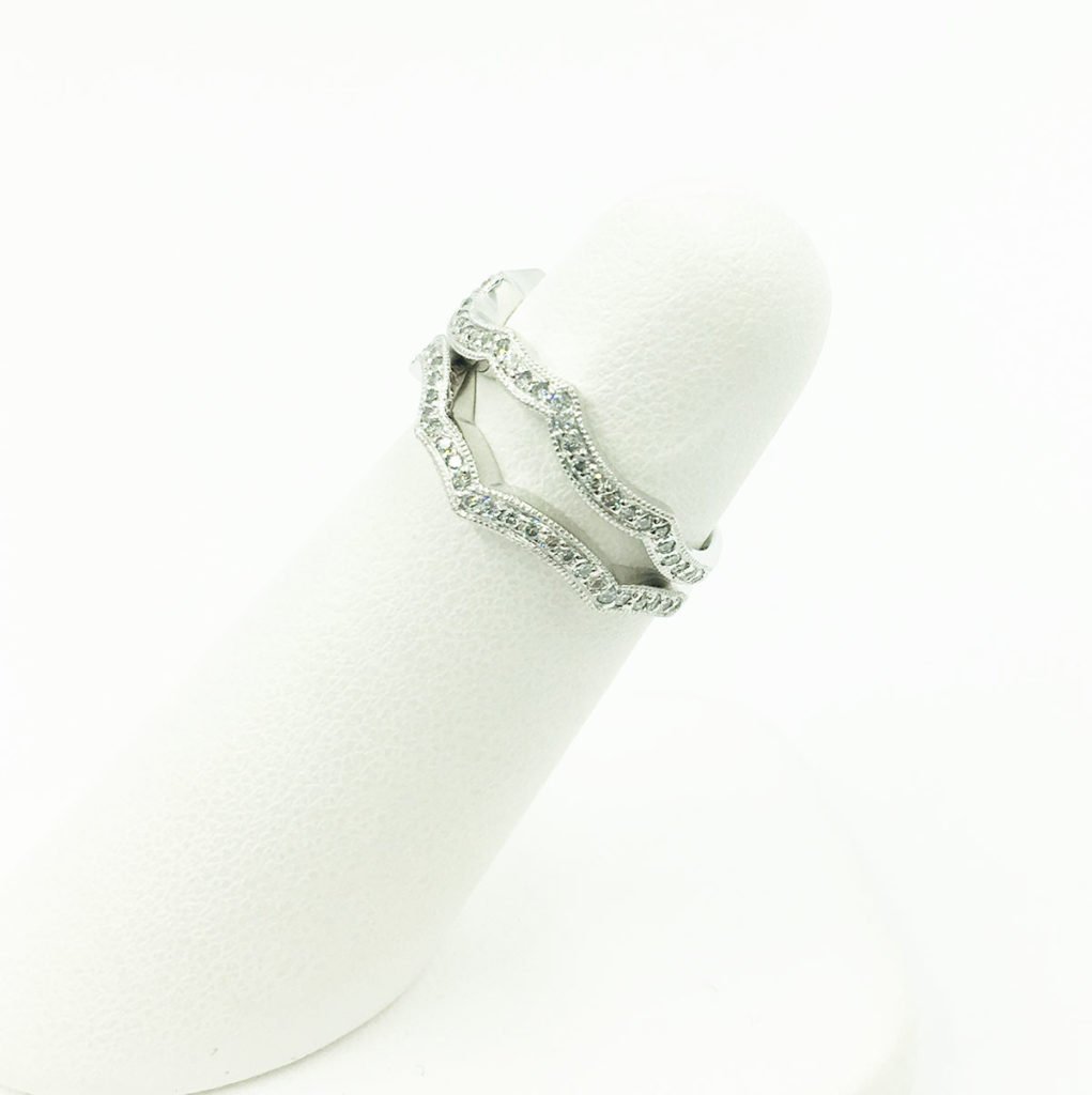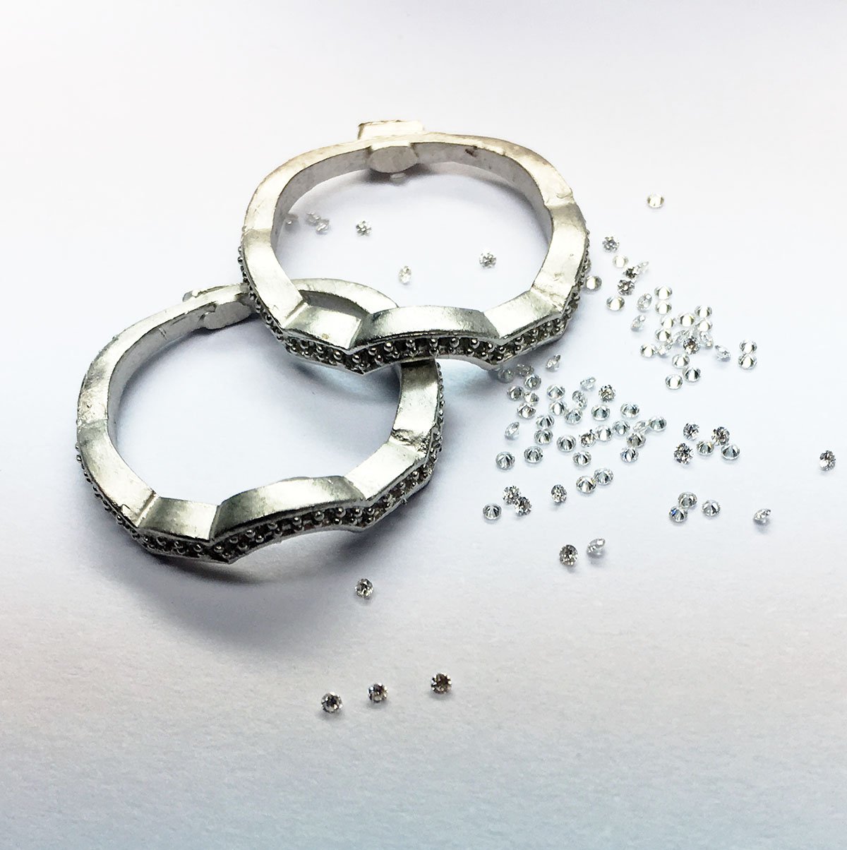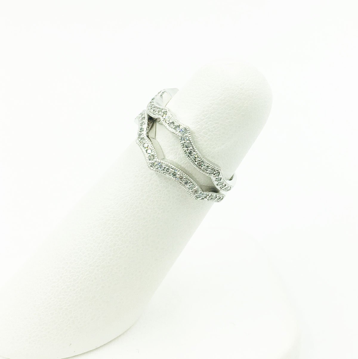 These platinum wedding bands were custom-made to fit around the bride’s engagement ring.  The bands feature a scalloped design to match the engagement ring, and have milgrain details. Natural round brilliant diamonds are prong set all the way around.