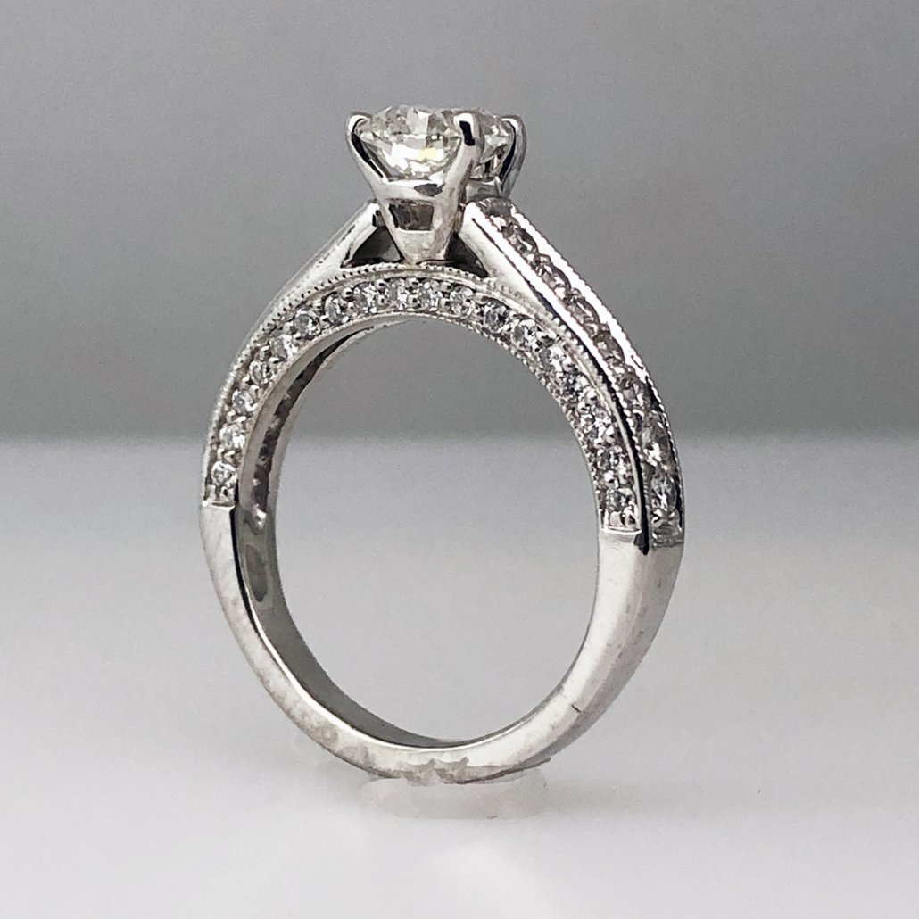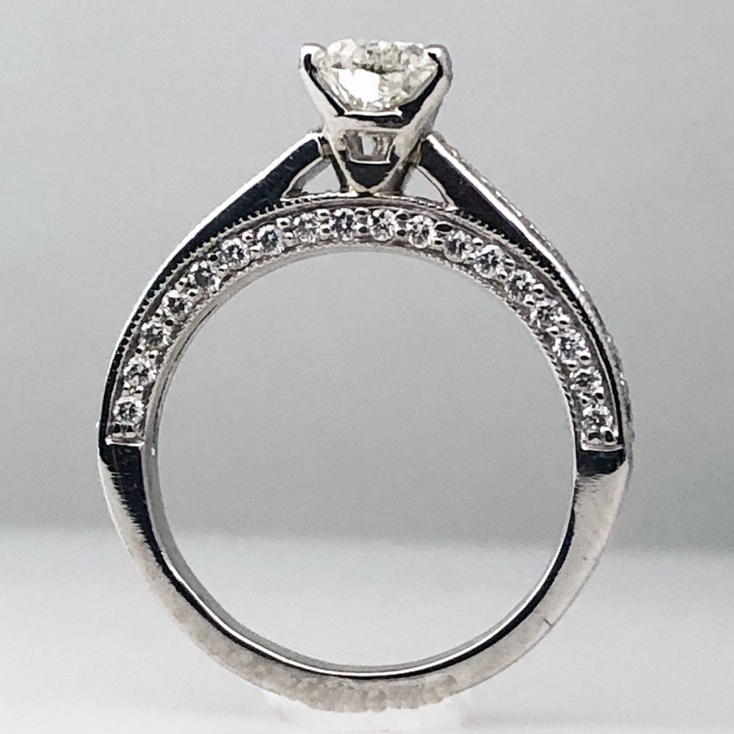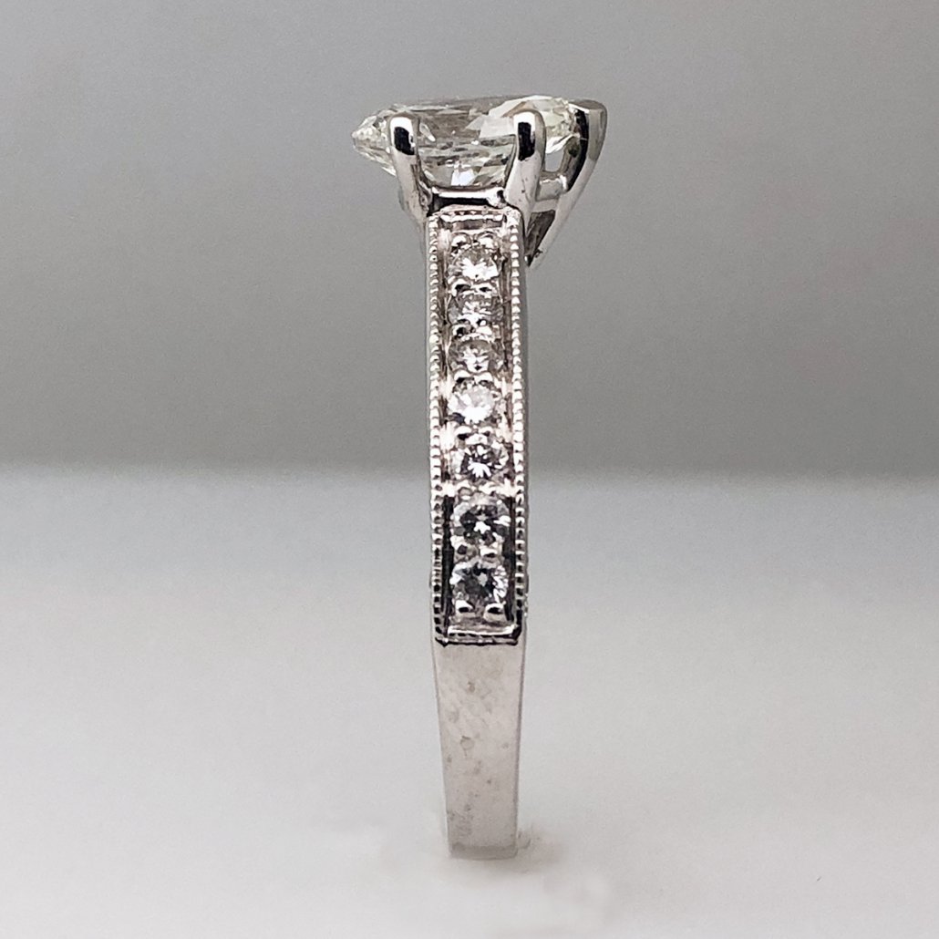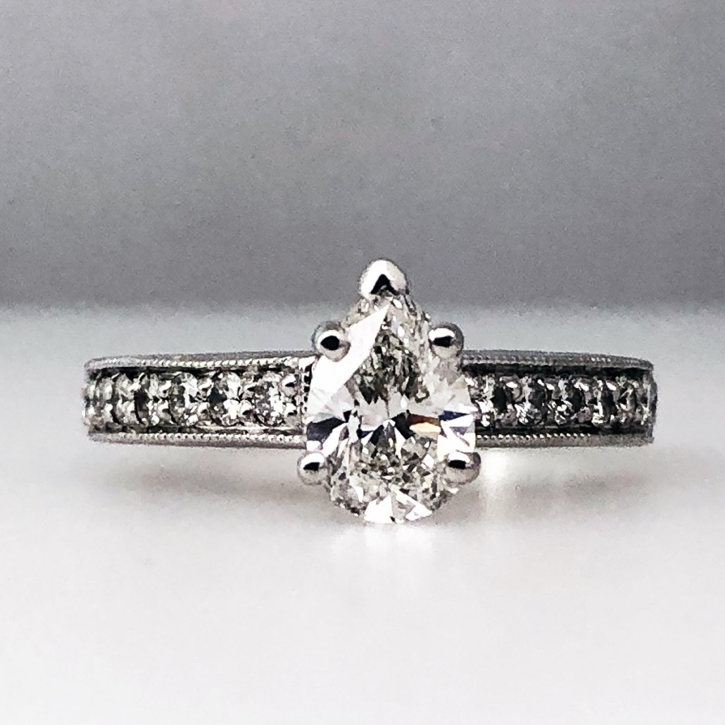This platinum one of a kind ring is a Vintage Style. Featuring a Pear Shaped diamond mounted on a shank covered in pave set diamonds with milgrain detail.