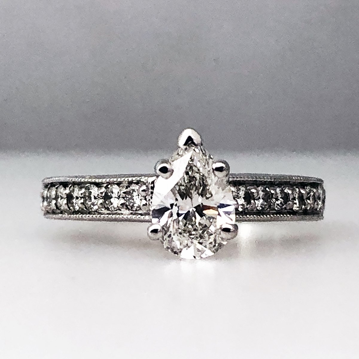 Tags Custom Engagement Rings, Fancy, gia certified, NYC Custom Engagement Rings, One-Of-A-Kind, Pave Set Shank, Pear Shaped, personal jeweler, Platinum, Platinum Custom Engagement Ring, Vintage Style