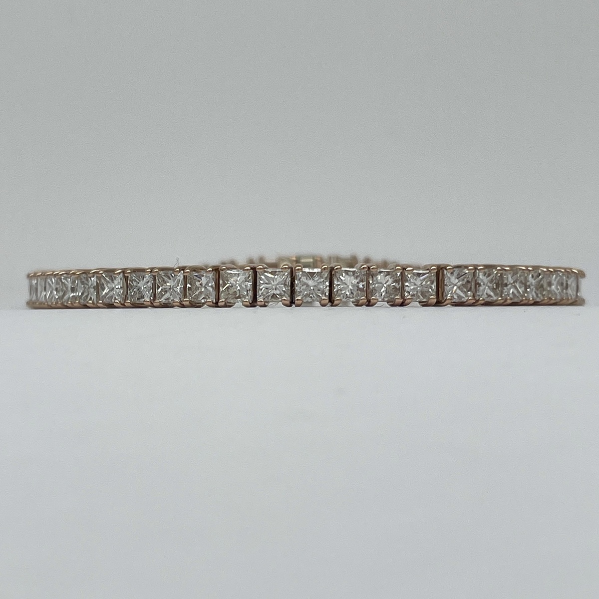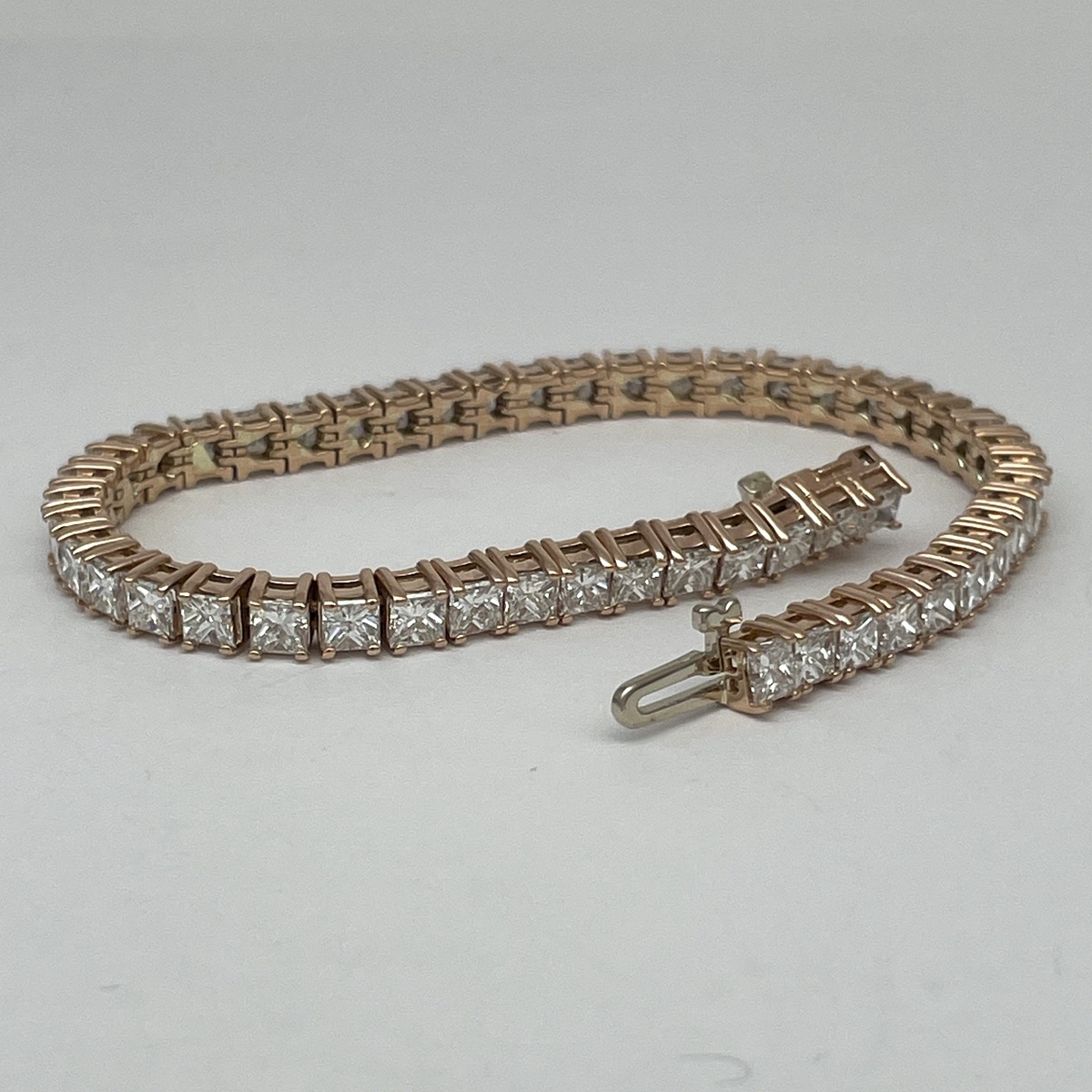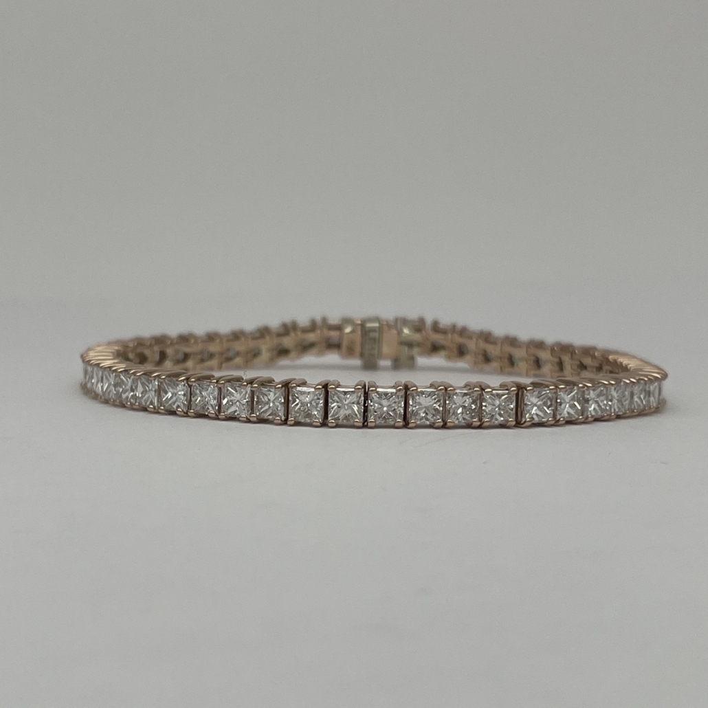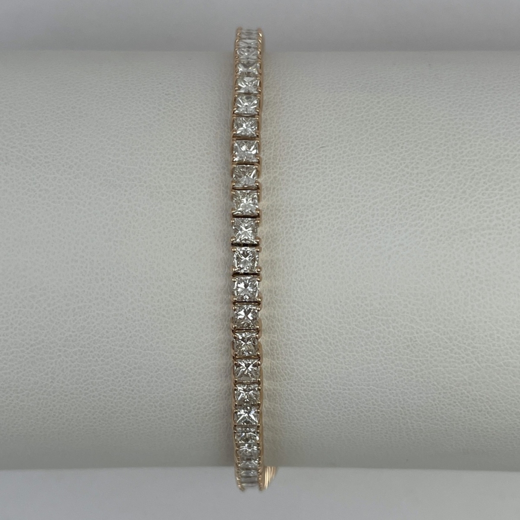 This 14k rose gold tennis bracelet is set with natural princess cut diamonds in four prongs setting.