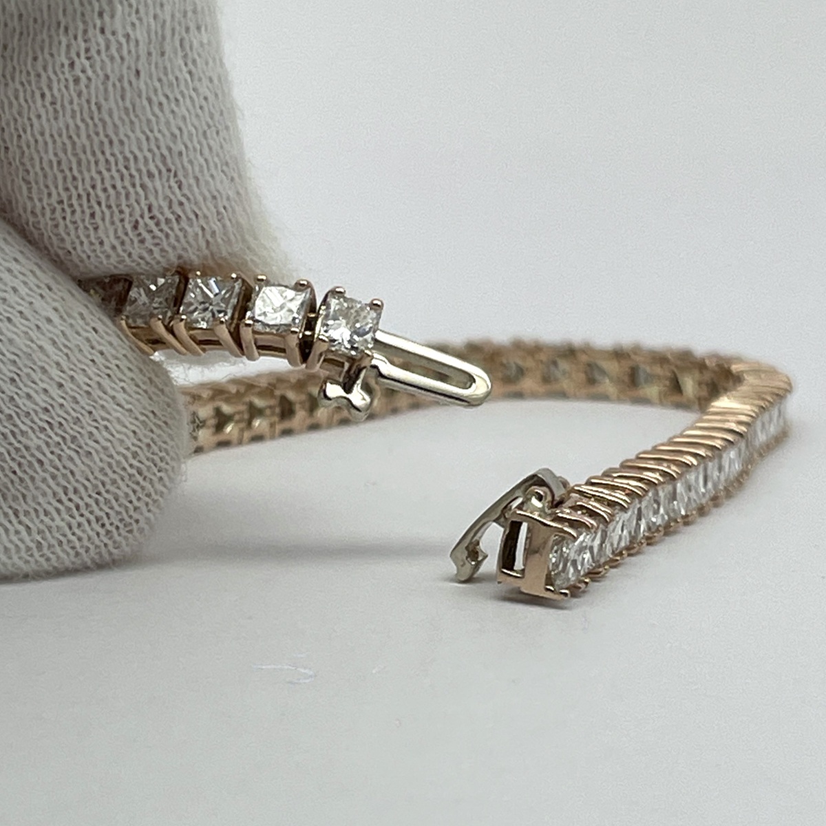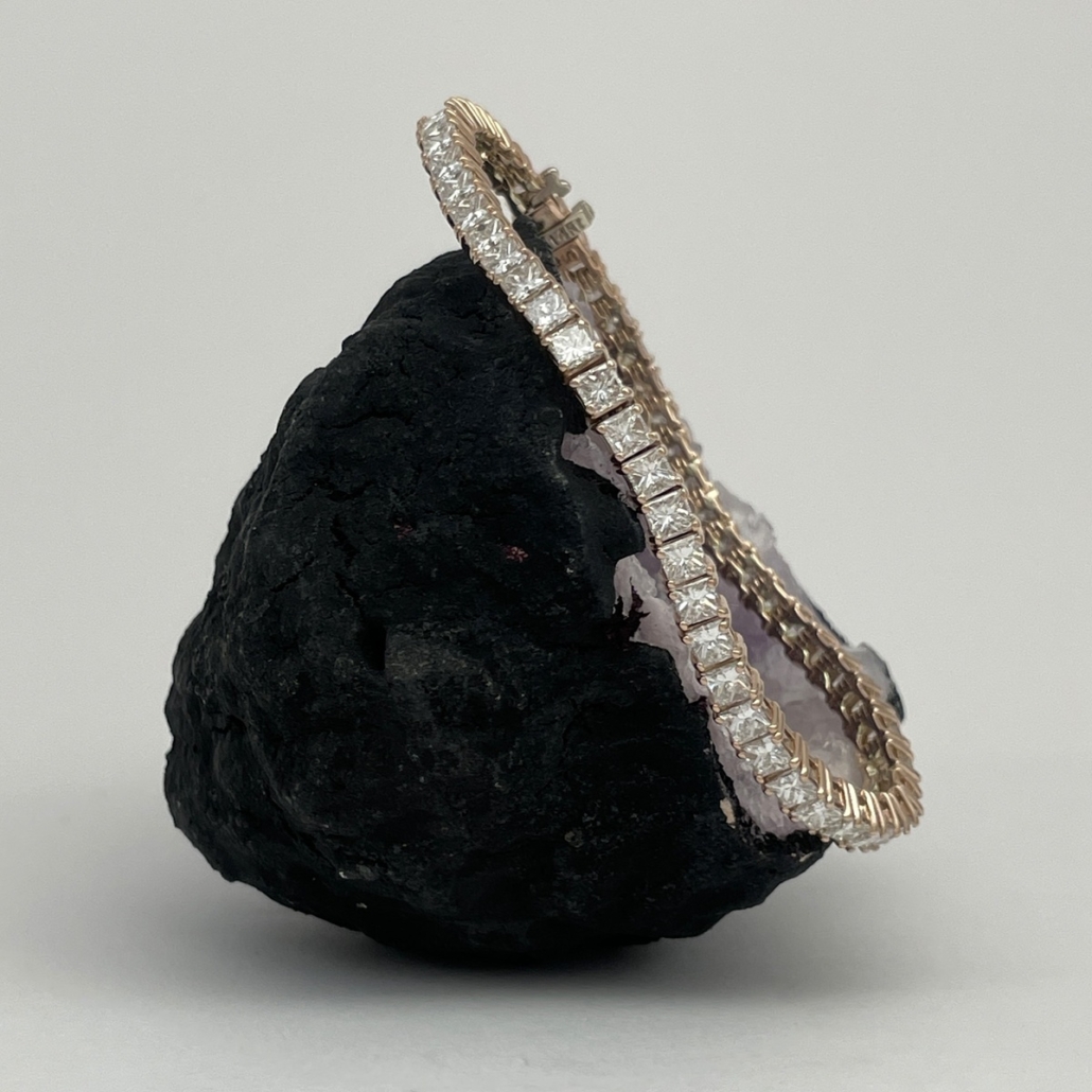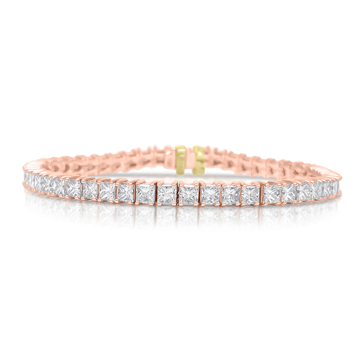 This 14k rose gold tennis bracelet is set with natural princess cut diamonds in four prongs setting.