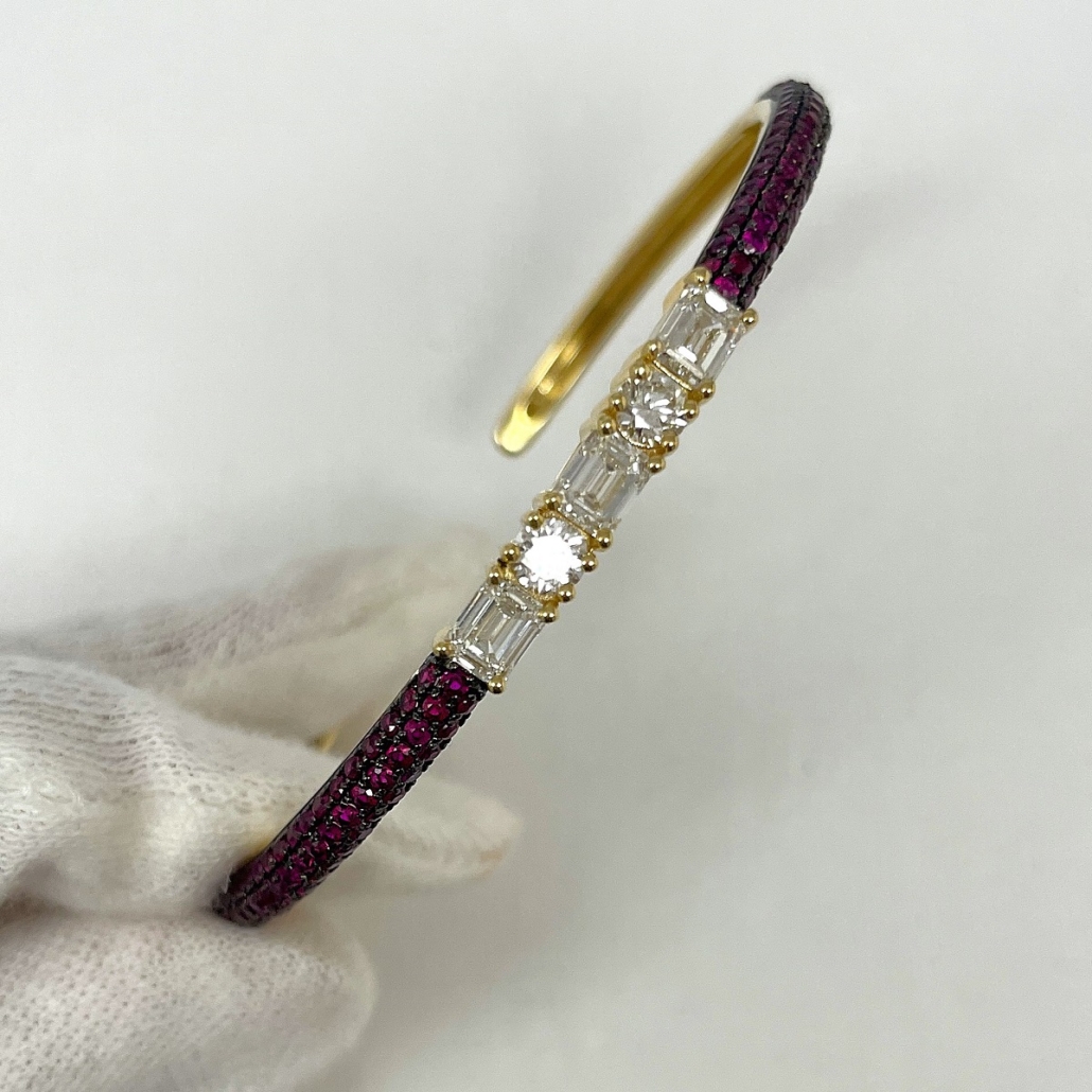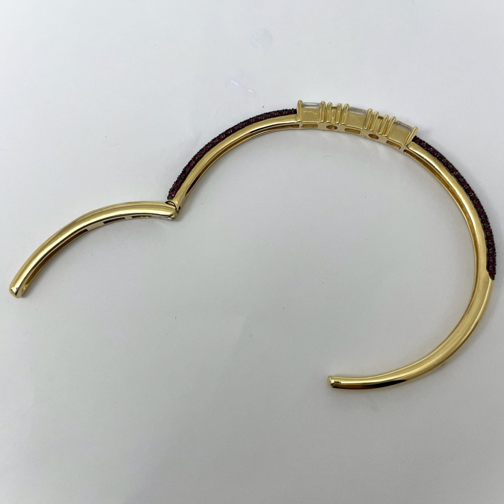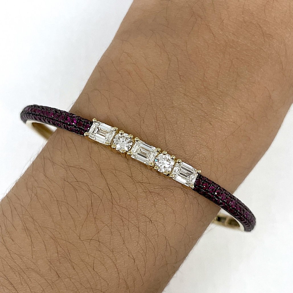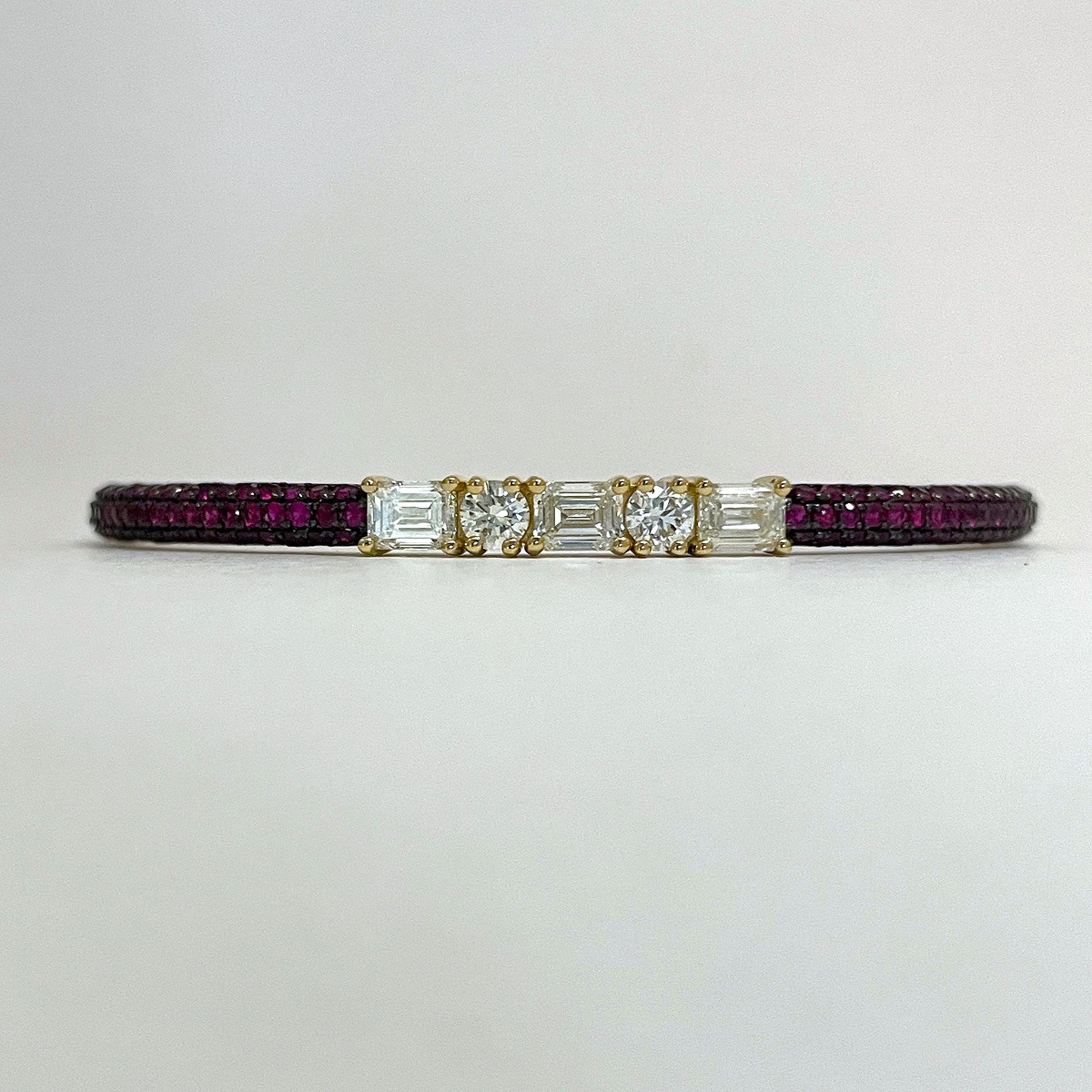The band is adorned with deep red pavé-set rubies, adding warmth and drama to the design, while the polished yellow gold provides an elegant frame for the gemstones. Whether worn alone or stacked with your favorites, this bracelet is a captivating piece that speaks of bold sophistication and timeless beauty.
