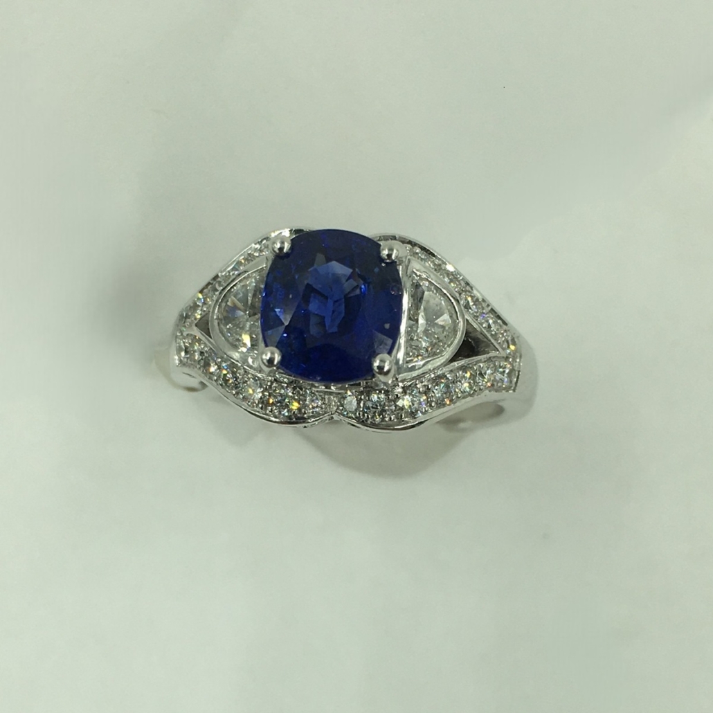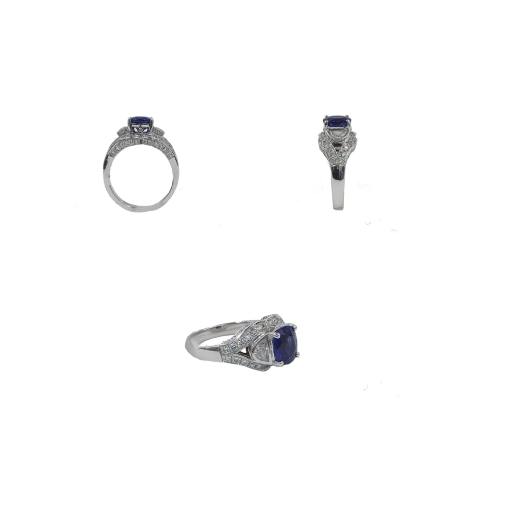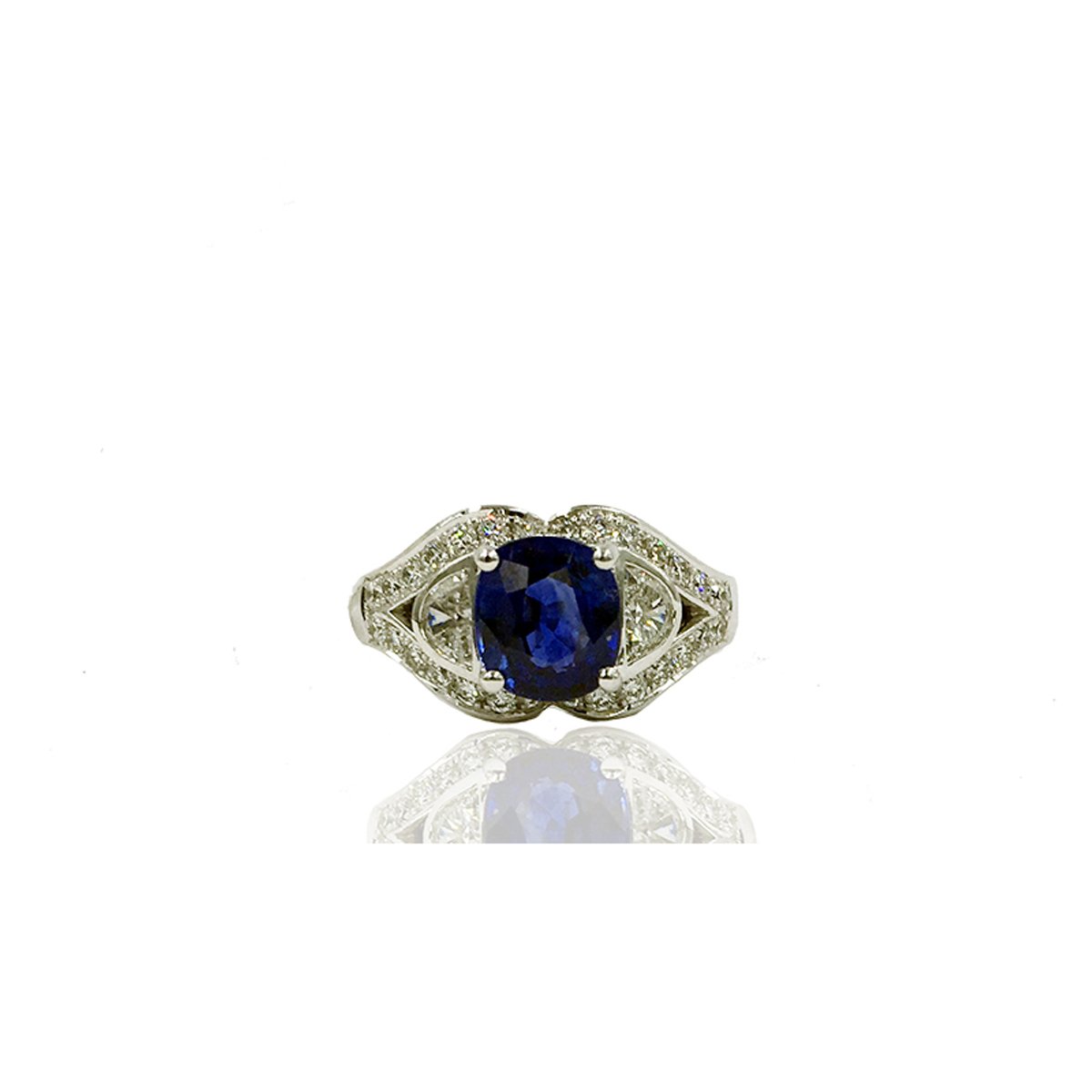 This ring is custom made with 18k white gold, natural cushion cut sapphire at center. Crescent cut natural diamond shoulders. And surrounded by split shank of diamonds.