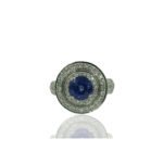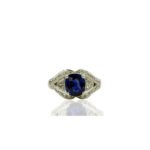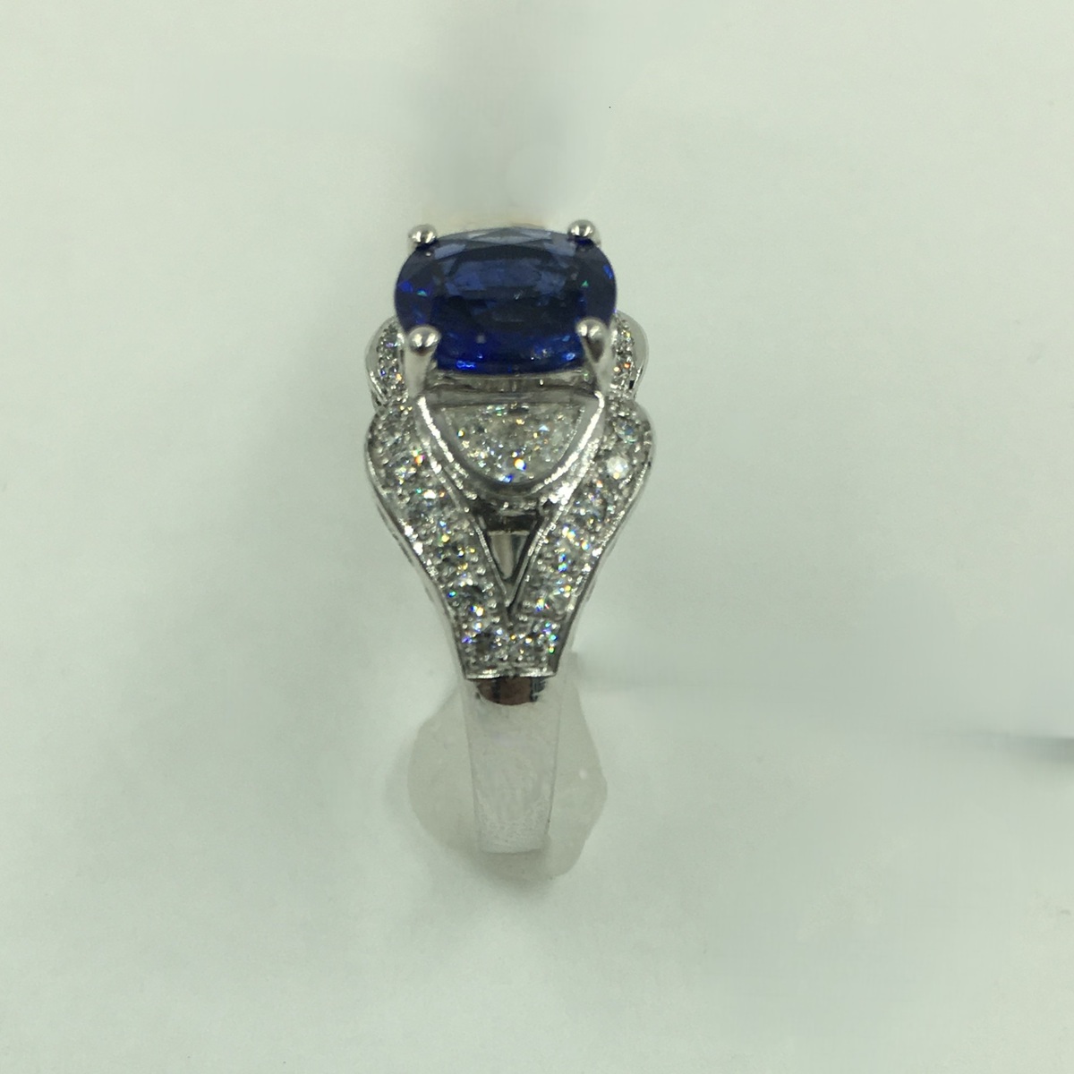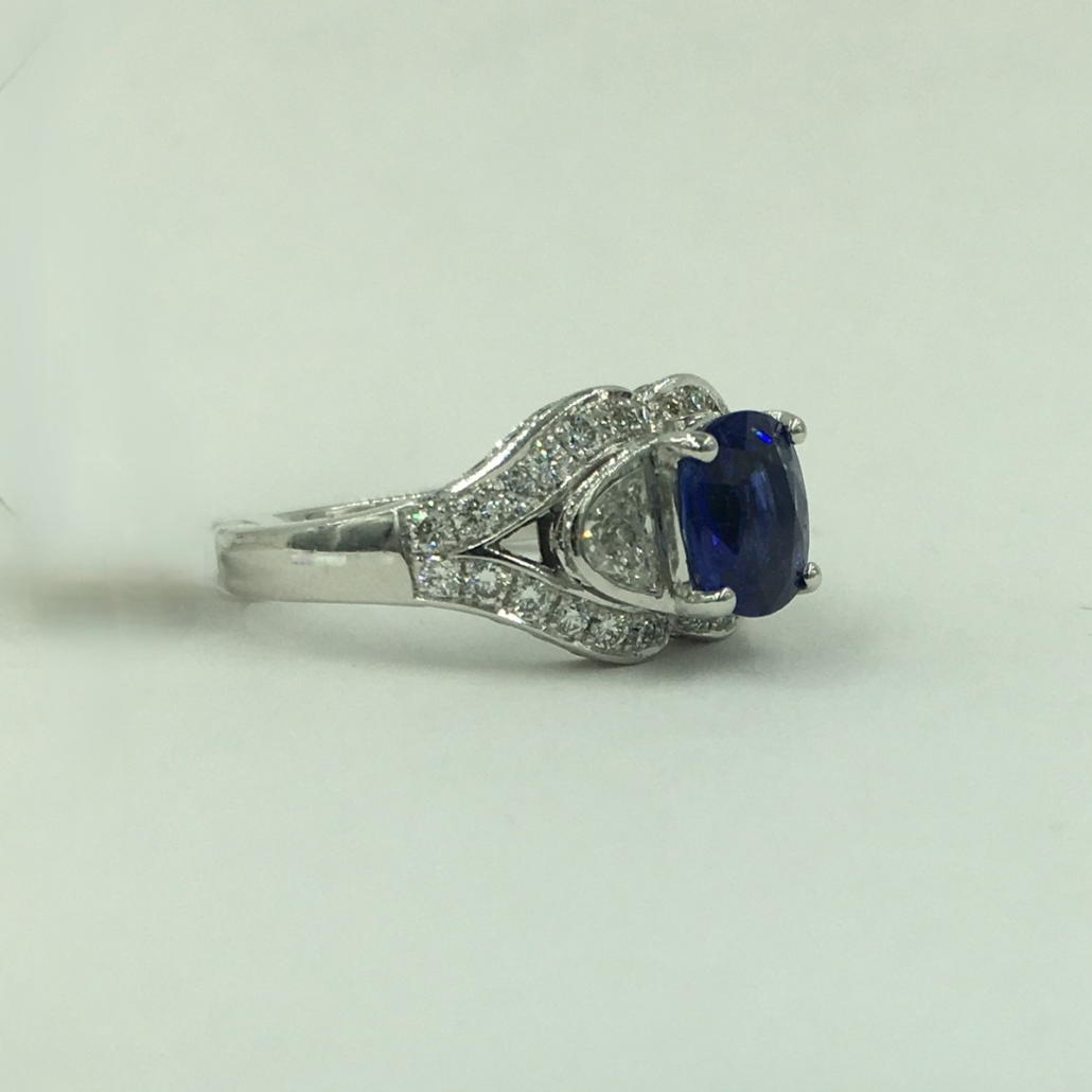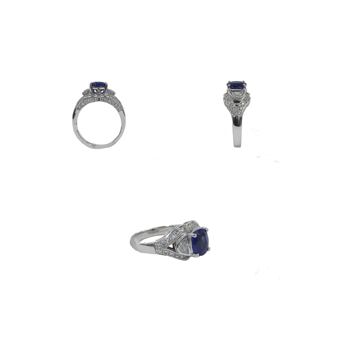 This ring is custom made with 18k white gold, natural cushion cut sapphire at center. Crescent cut natural diamond shoulders. And surrounded by split shank of diamonds.