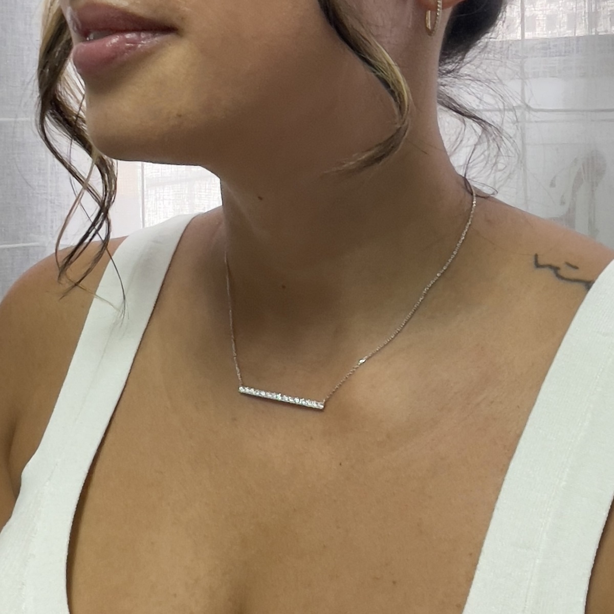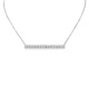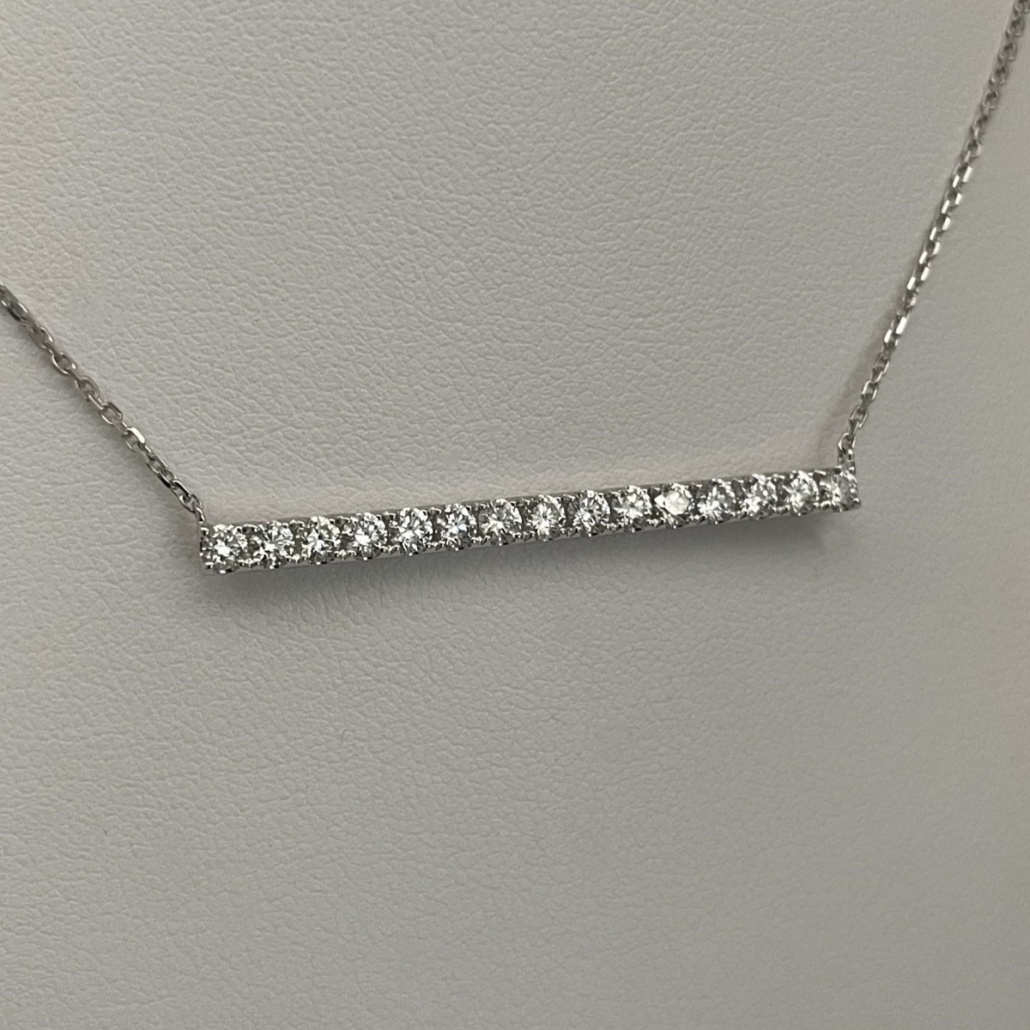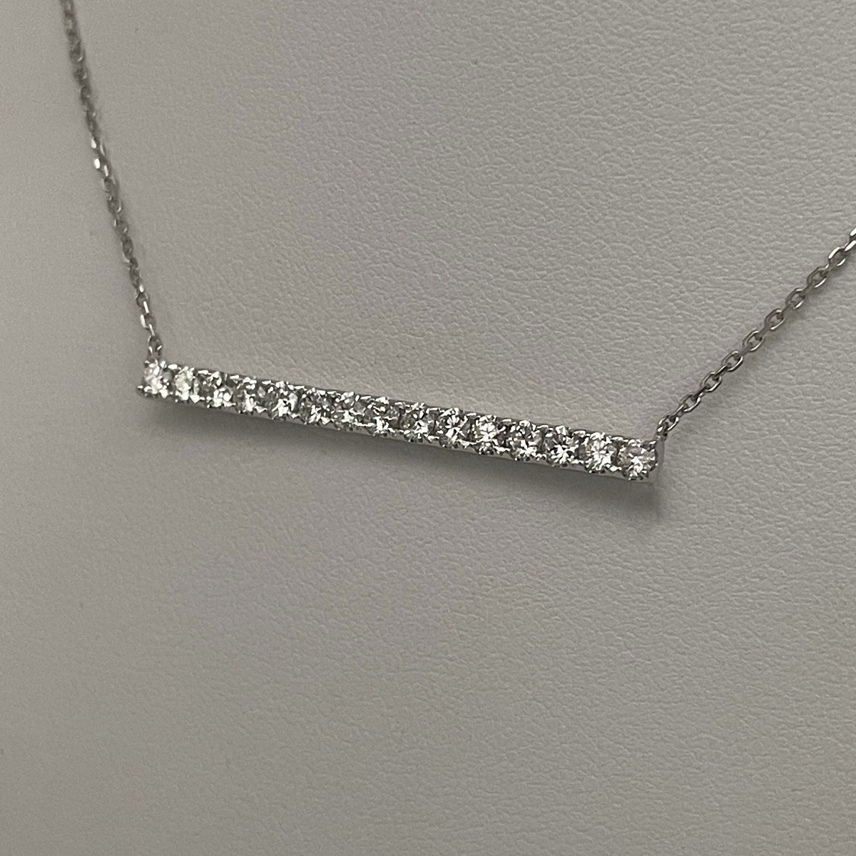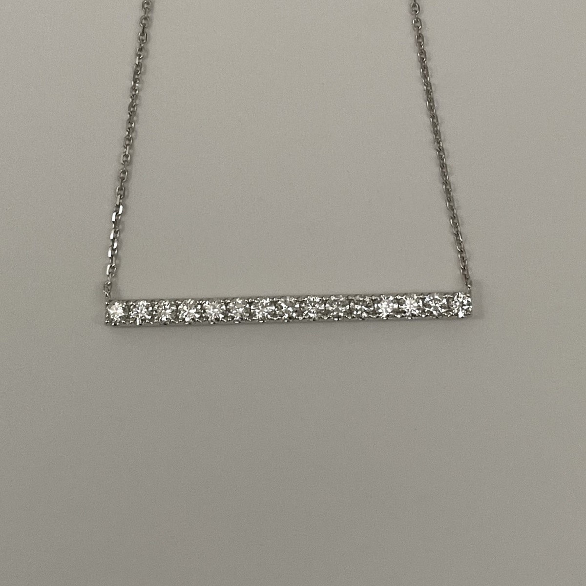 This 14K white gold necklace features a striking bar set with a a line of prong set round brilliant diamonds.