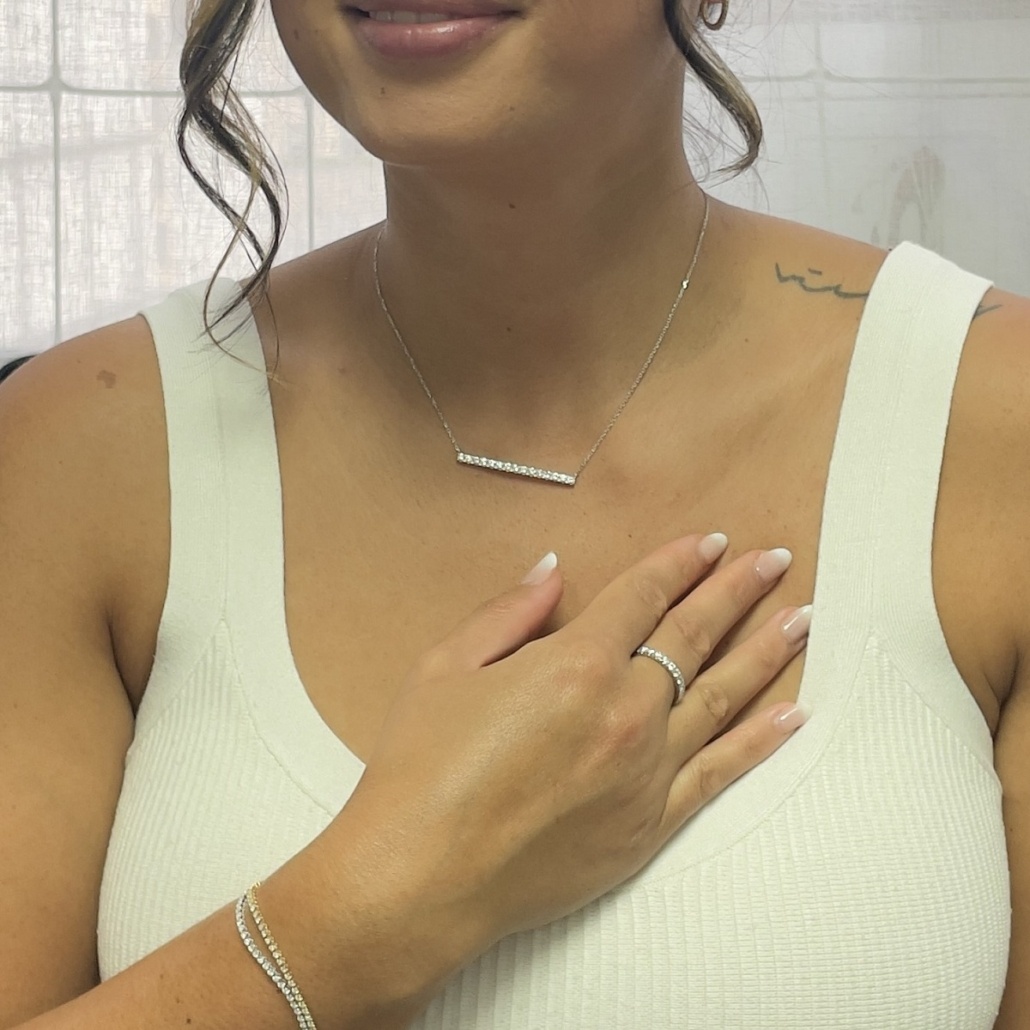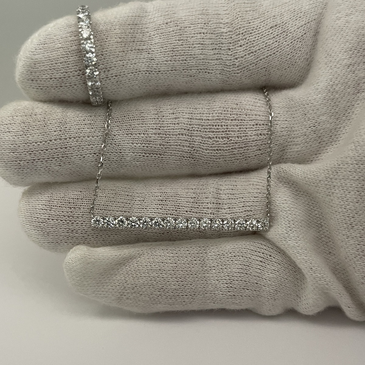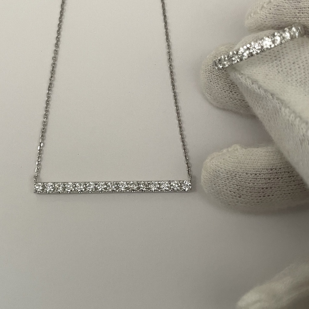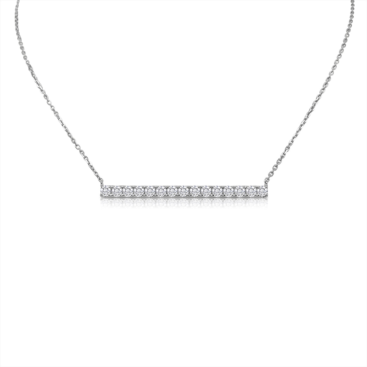 This 14K white gold necklace features a striking bar set with a a line of prong set round brilliant diamonds.