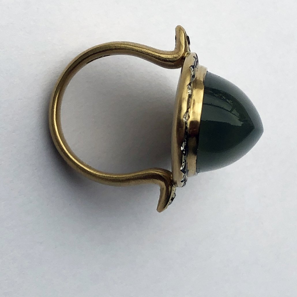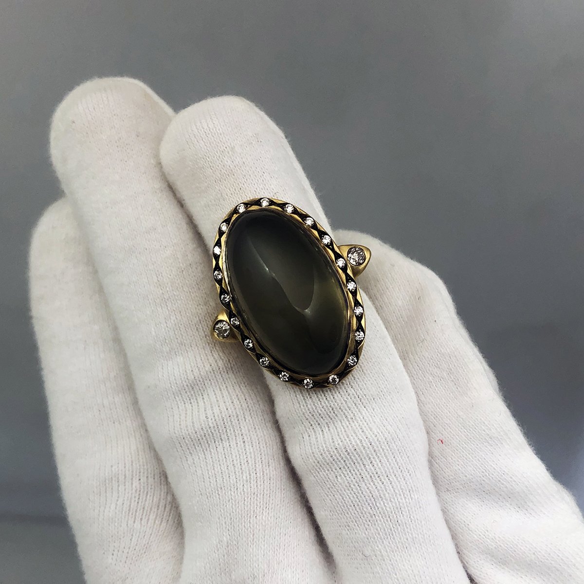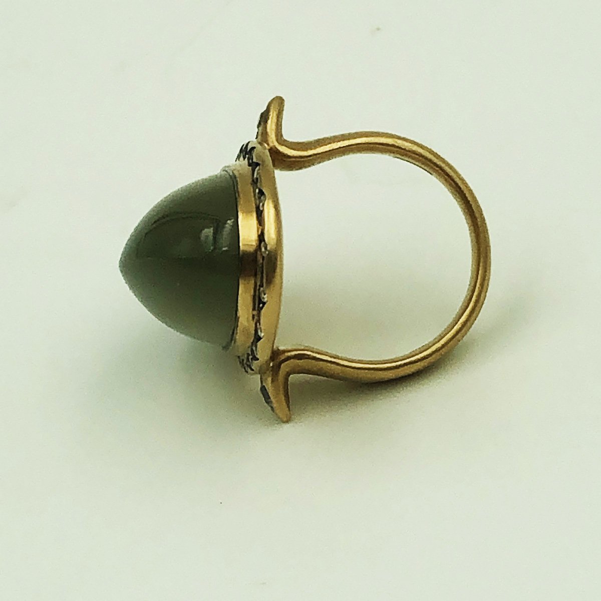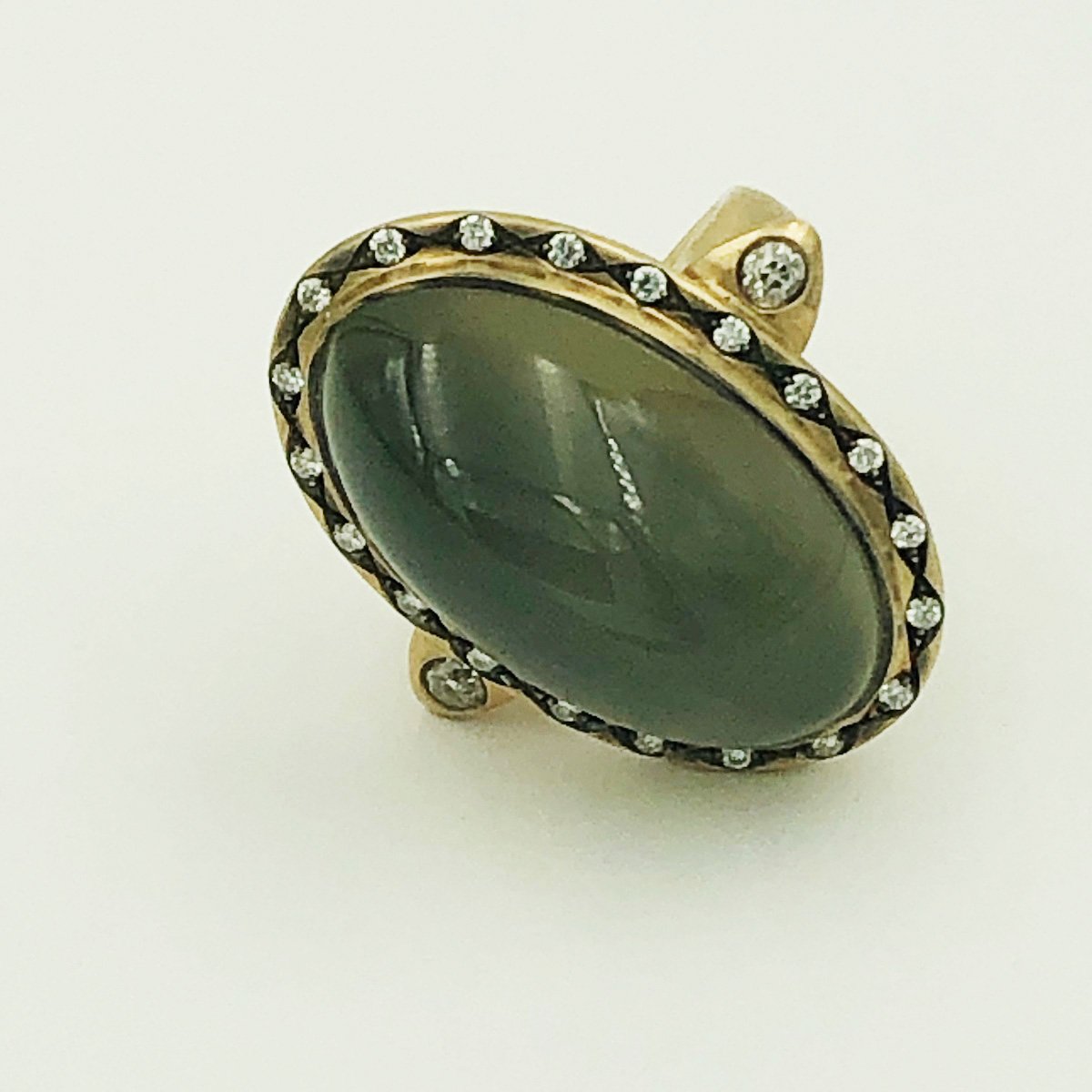 A halo of diamonds lend a glittering edge to this stately green oval moonstone ring with diamond accents.