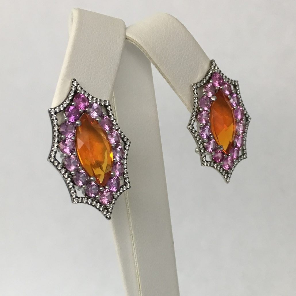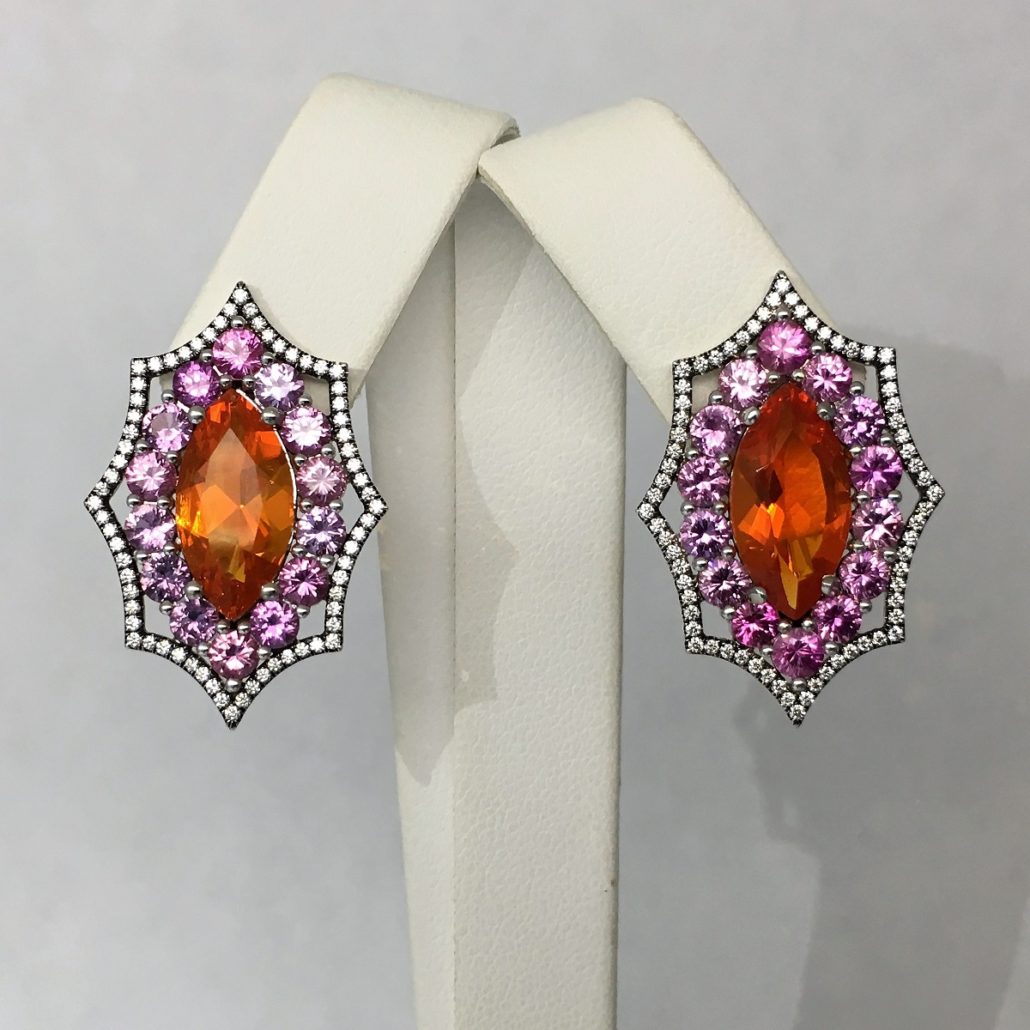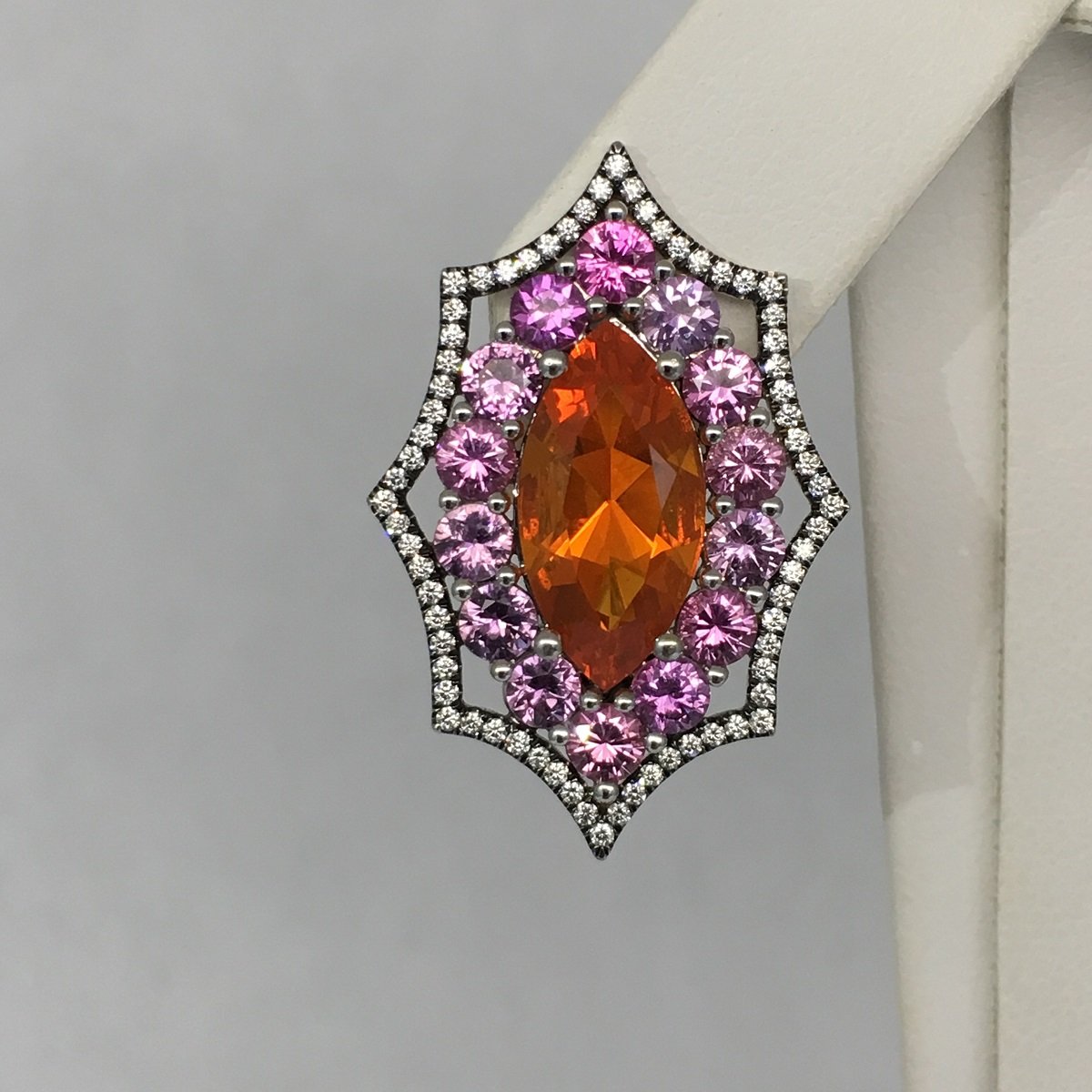 Tags 18k White, Black Rhodium, feather, Marquise, Mexican Fire Opal, Opals, Orange, Pink, Red, Sapphire, Shared Prongs, Spider, Stylish, Web