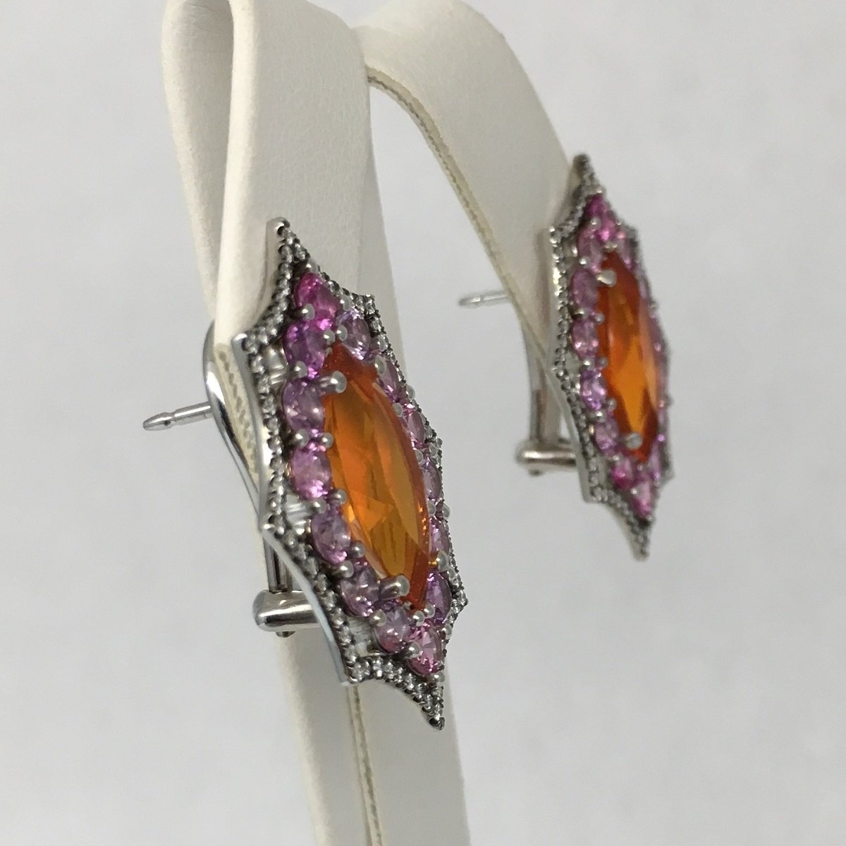 These beautiful earrings are made with 18k white gold with black rhodium. Set with two natural marquise cut Mexican opals surrounded by natural pink sapphires and natural round brilliant diamonds in shared prongs, creating a web resembling design.