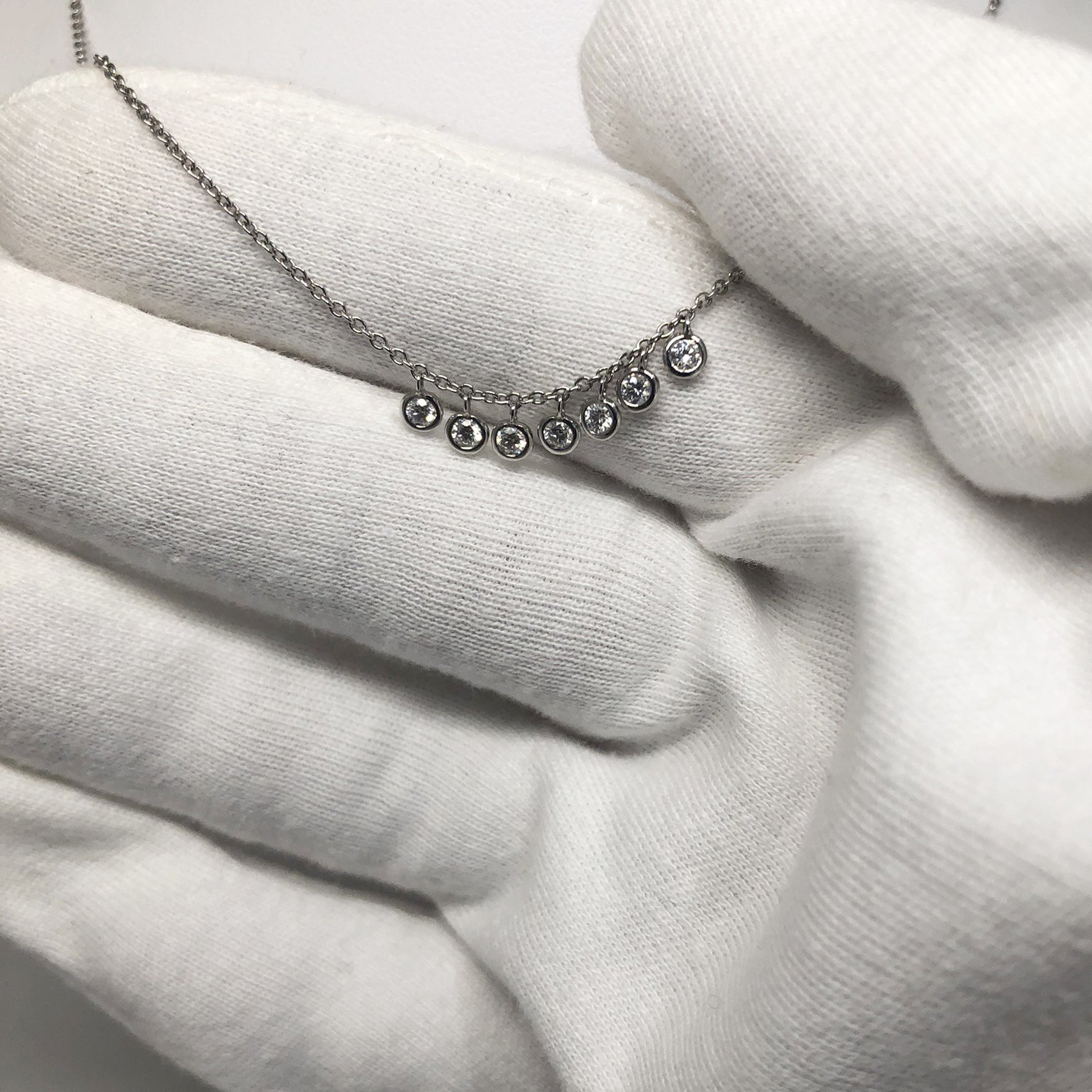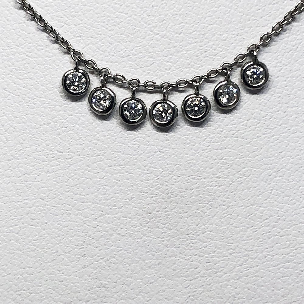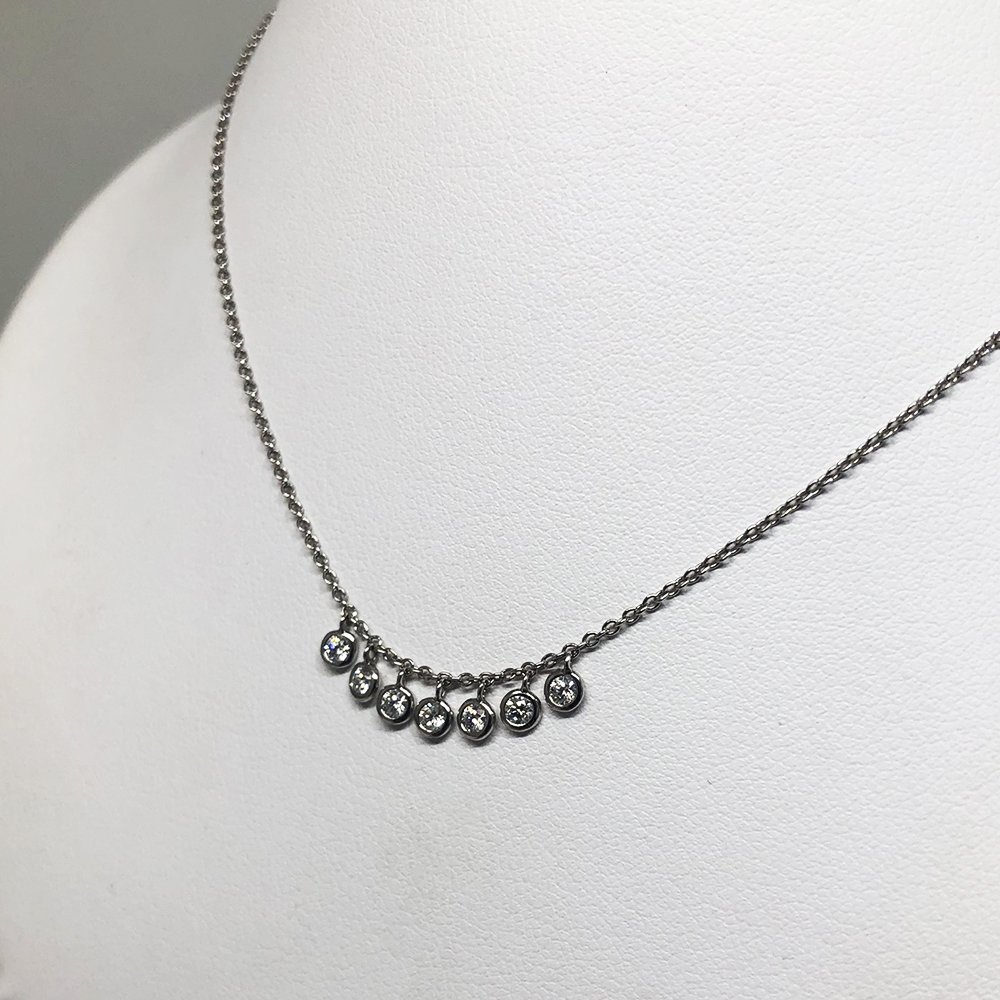 Fabulous on its own or layered with other favorite necklaces (sold separately), this chic choker necklace for her features 7 round diamonds that sparkle in dangling bezel settings.