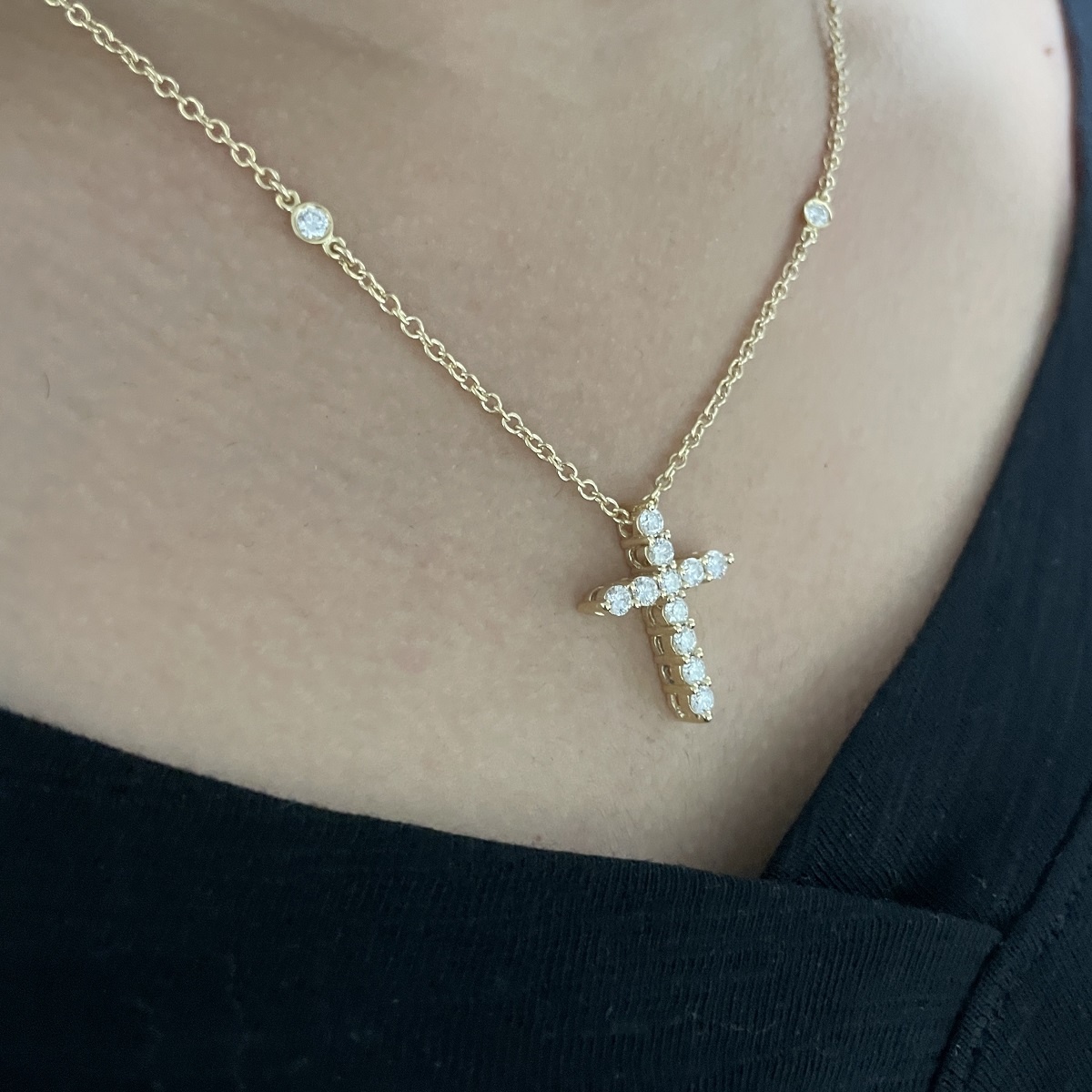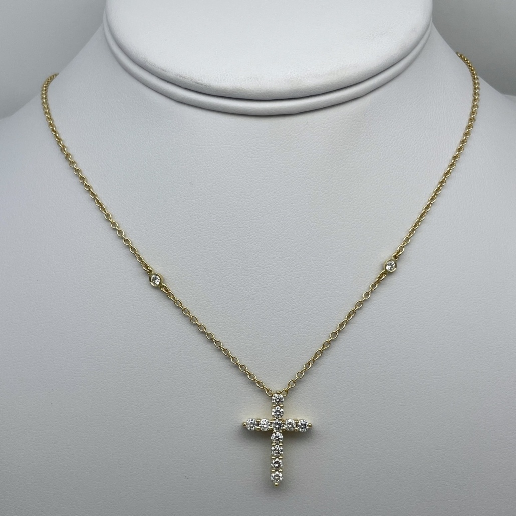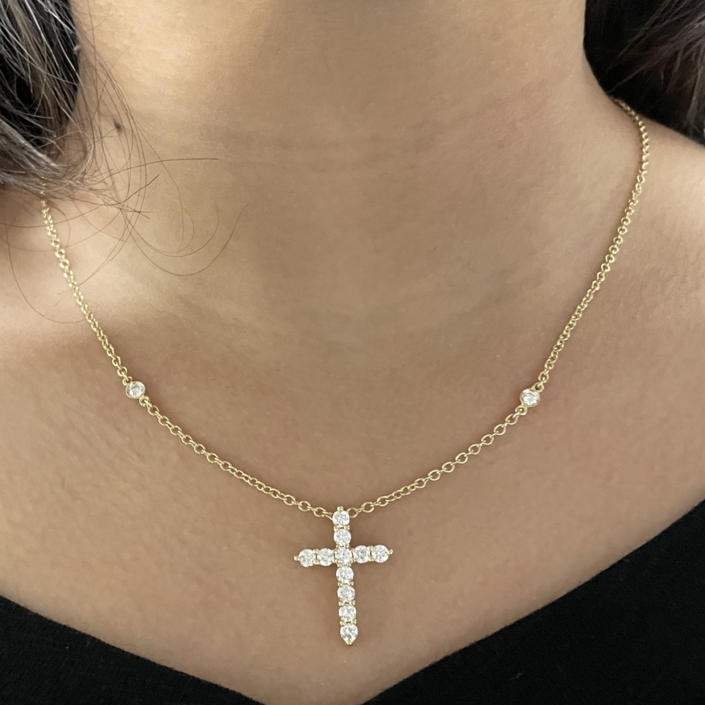 Tags 18k Yellow, Cable Chain, Cluster, Cross, Cross Jewelry, Diamond, Elegant, Pendant, Prong Set, Shared Prongs, Stones on Chain, symbolic