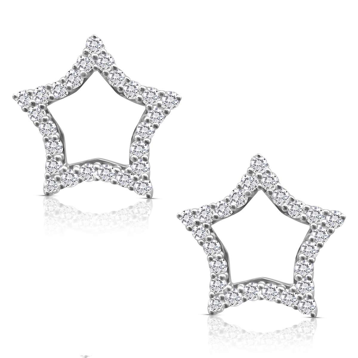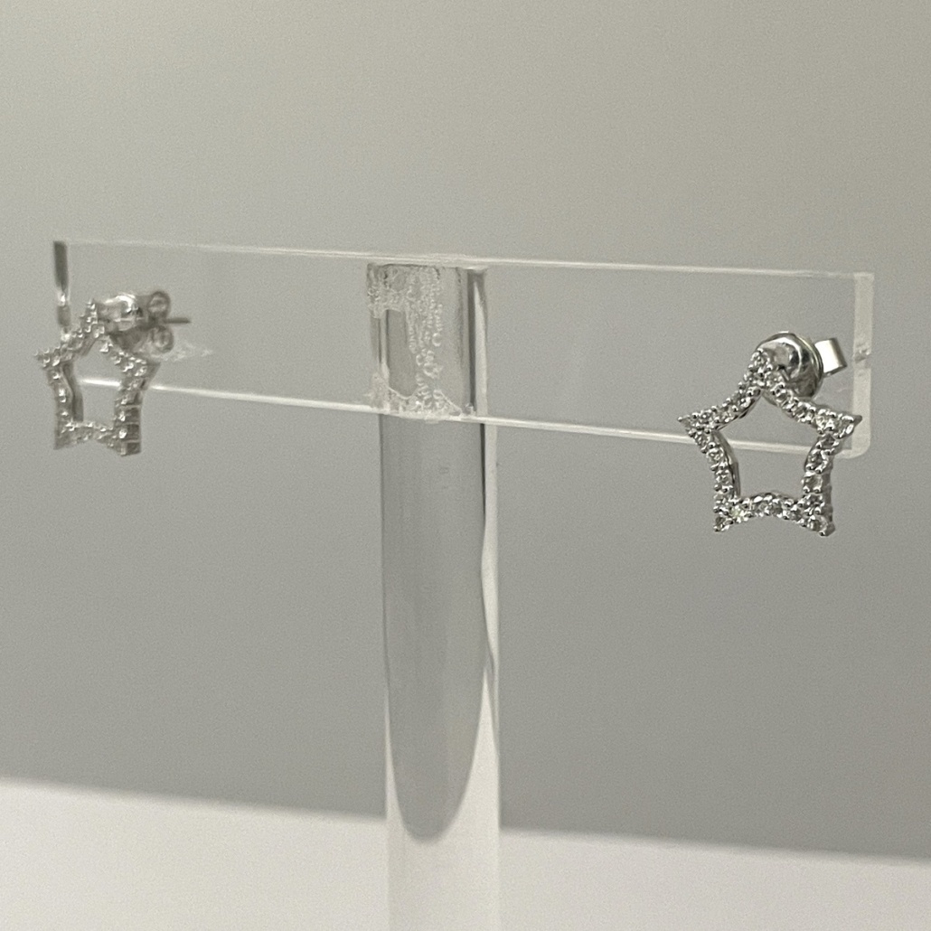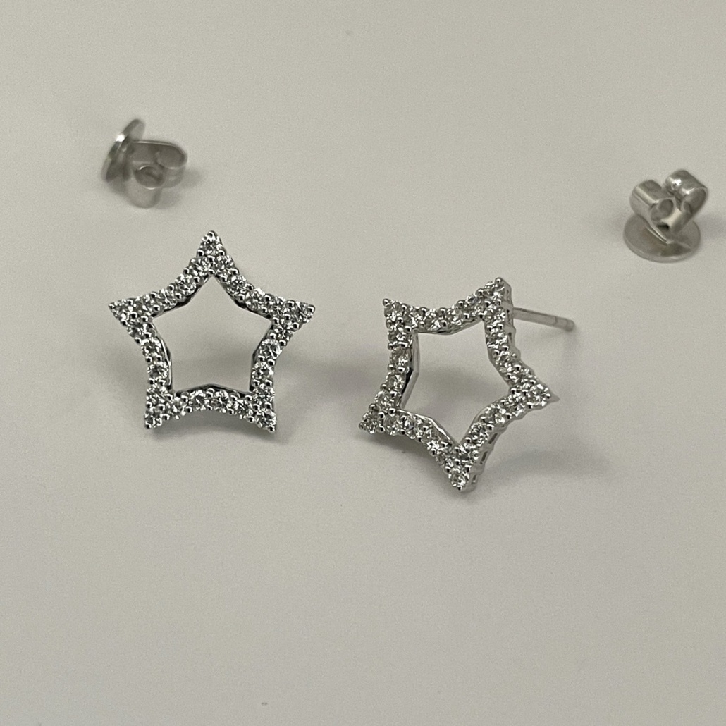 These 14k white gold star earrings are set with round brilliant diamonds.