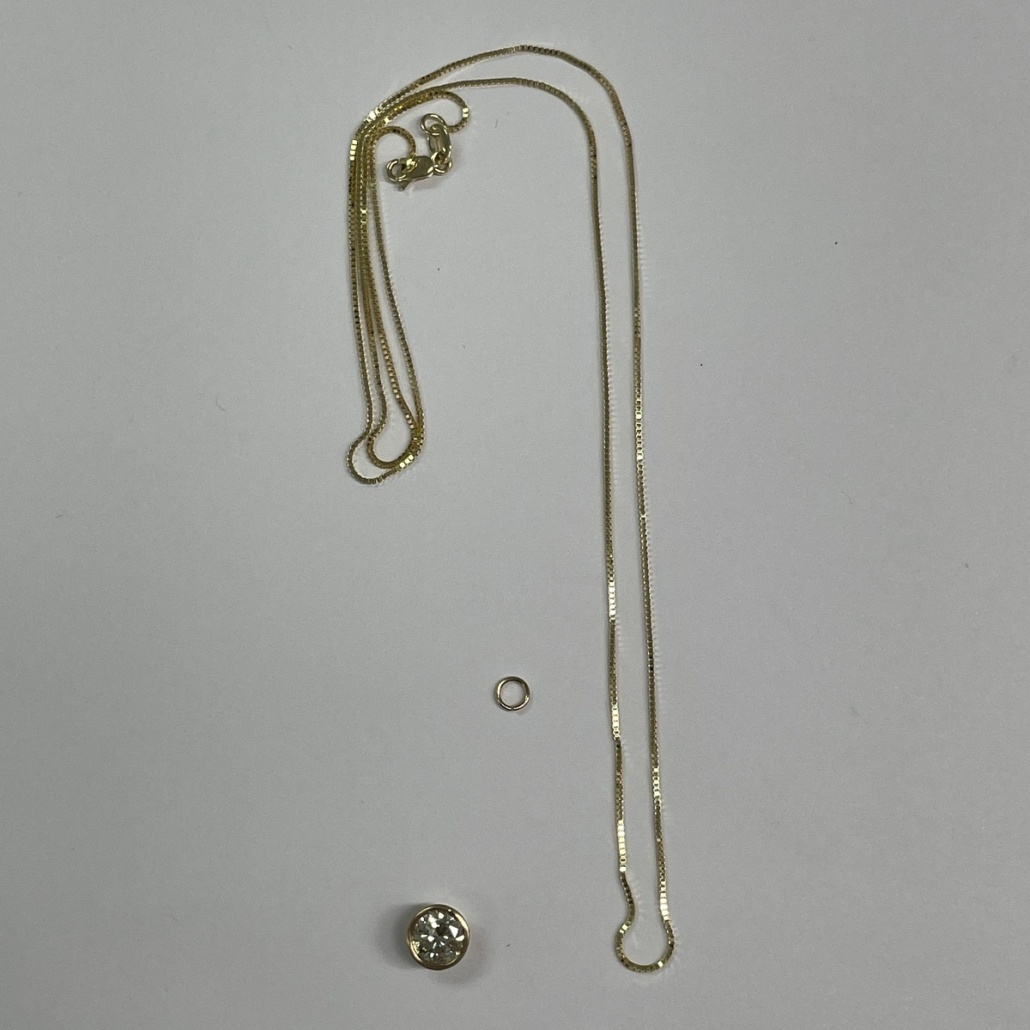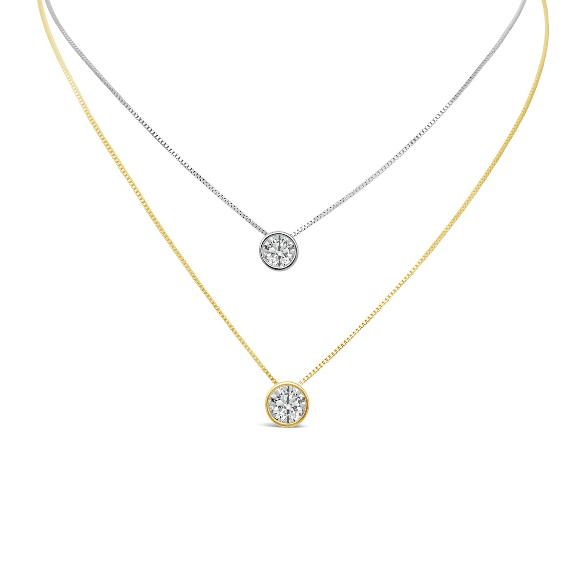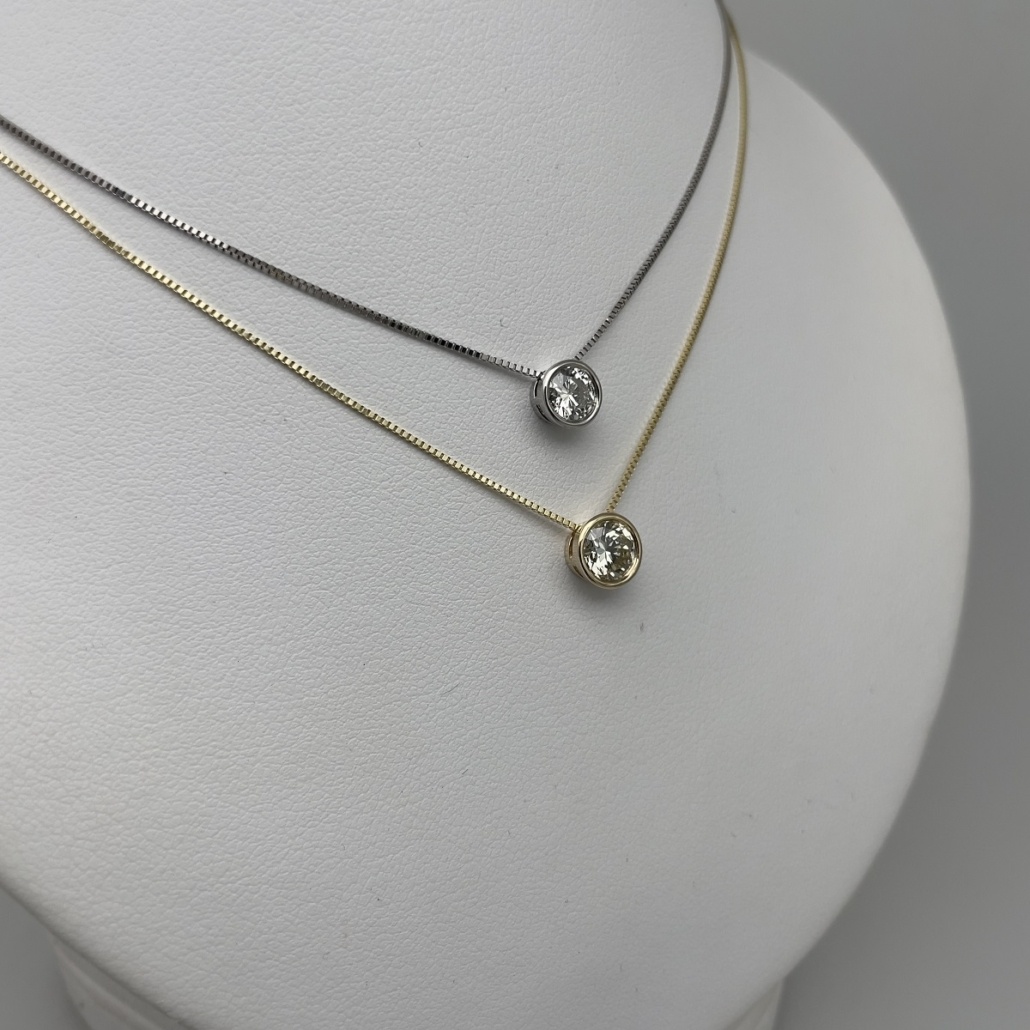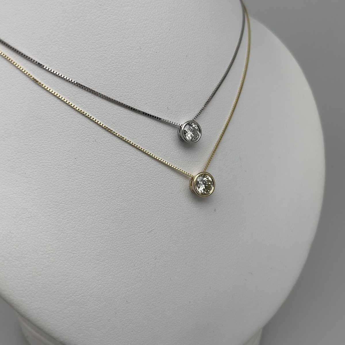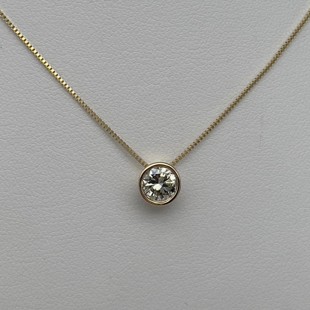 Sliding Round Brilliant Diamond Bezel Set In 14k Yellow Gold. Threaded With Box Chain.