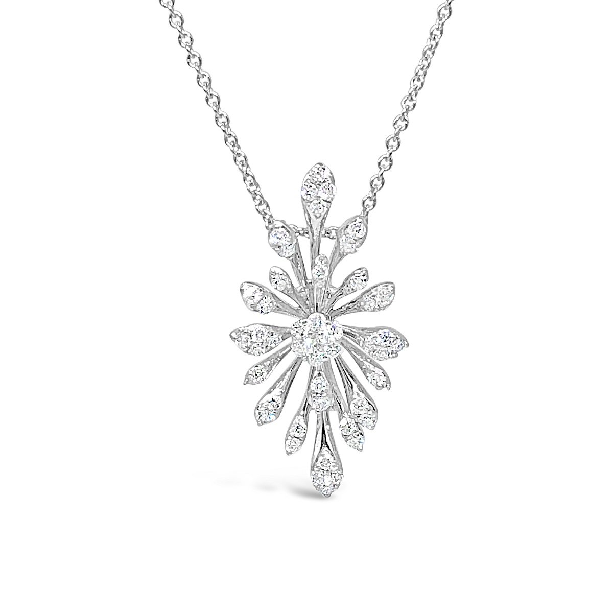 This pendant is made with 14k white gold and set with natural round brilliant diamonds.