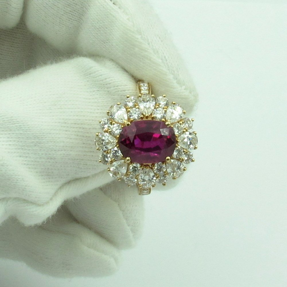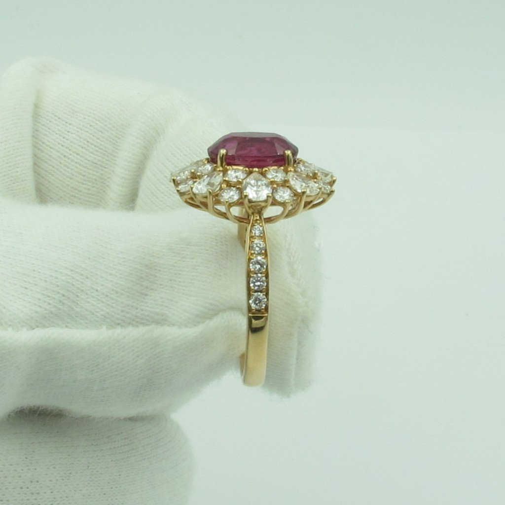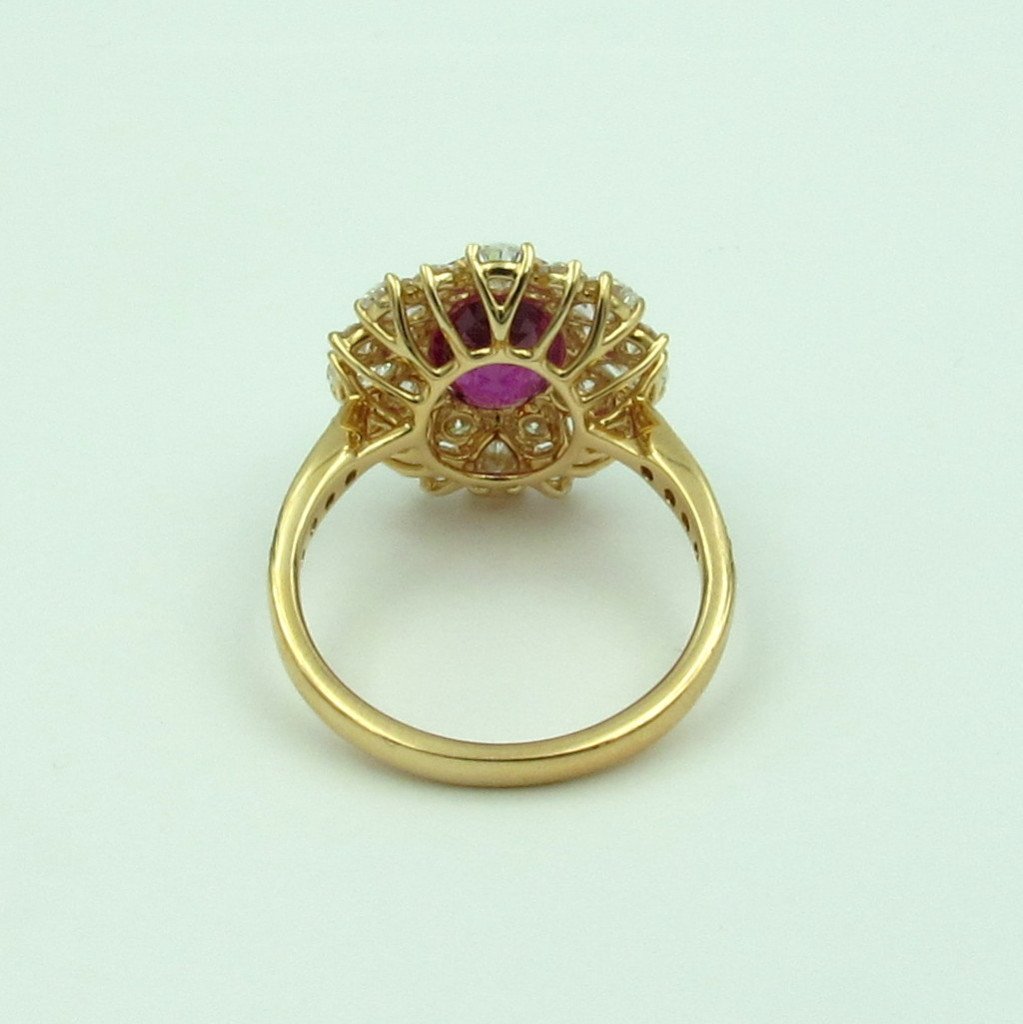This ring is 18k rose gold and set with natural oval pink sapphire, surrounded by diamonds.Â