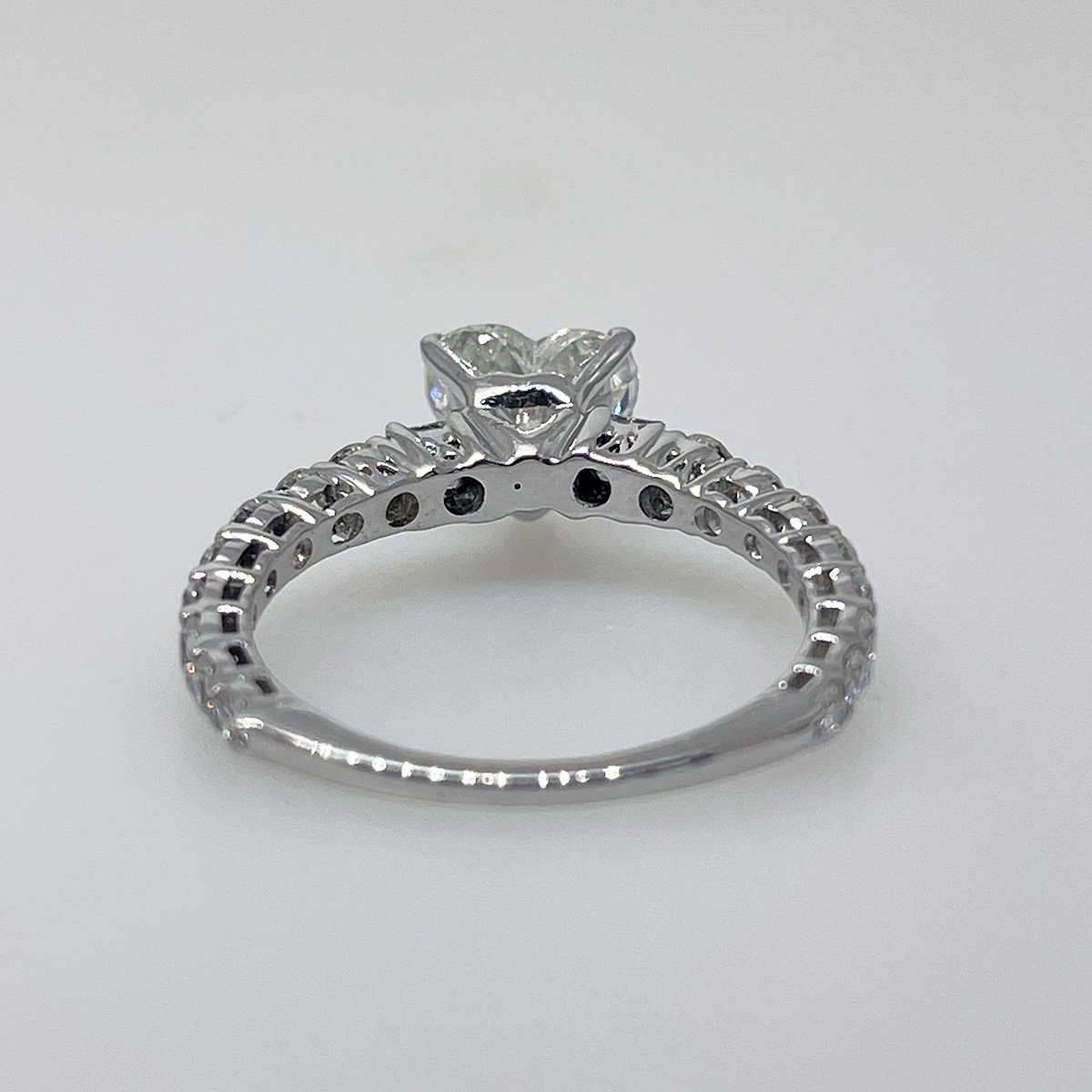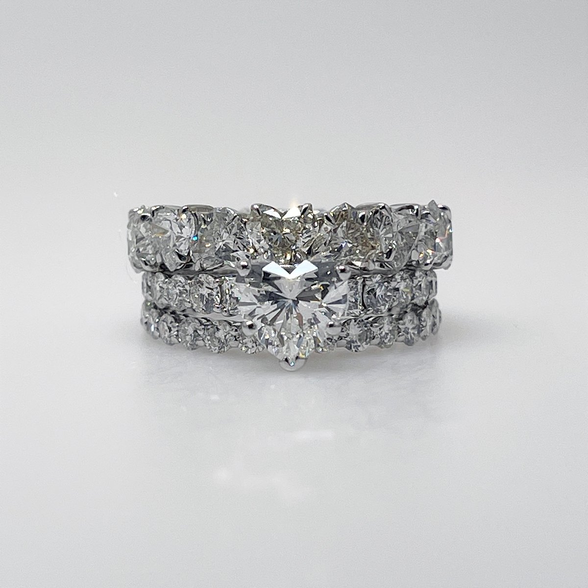 A heart shaped diamond is the star of this show – A custom engagement ring featuring 12 supporting diamonds around the band.
