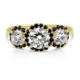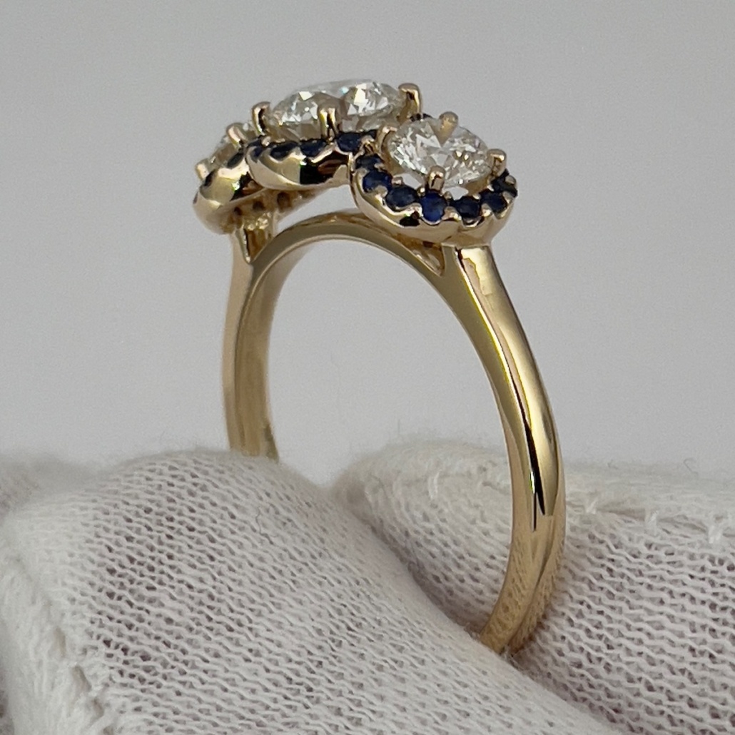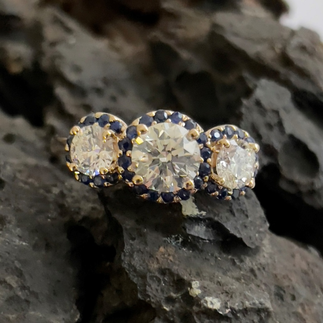 14k Yellow Gold Ring With Three Diamonds Surrounded By Small Blue Sapphires.