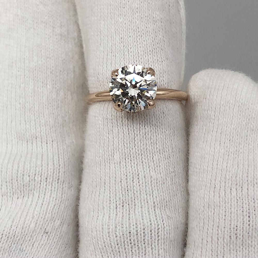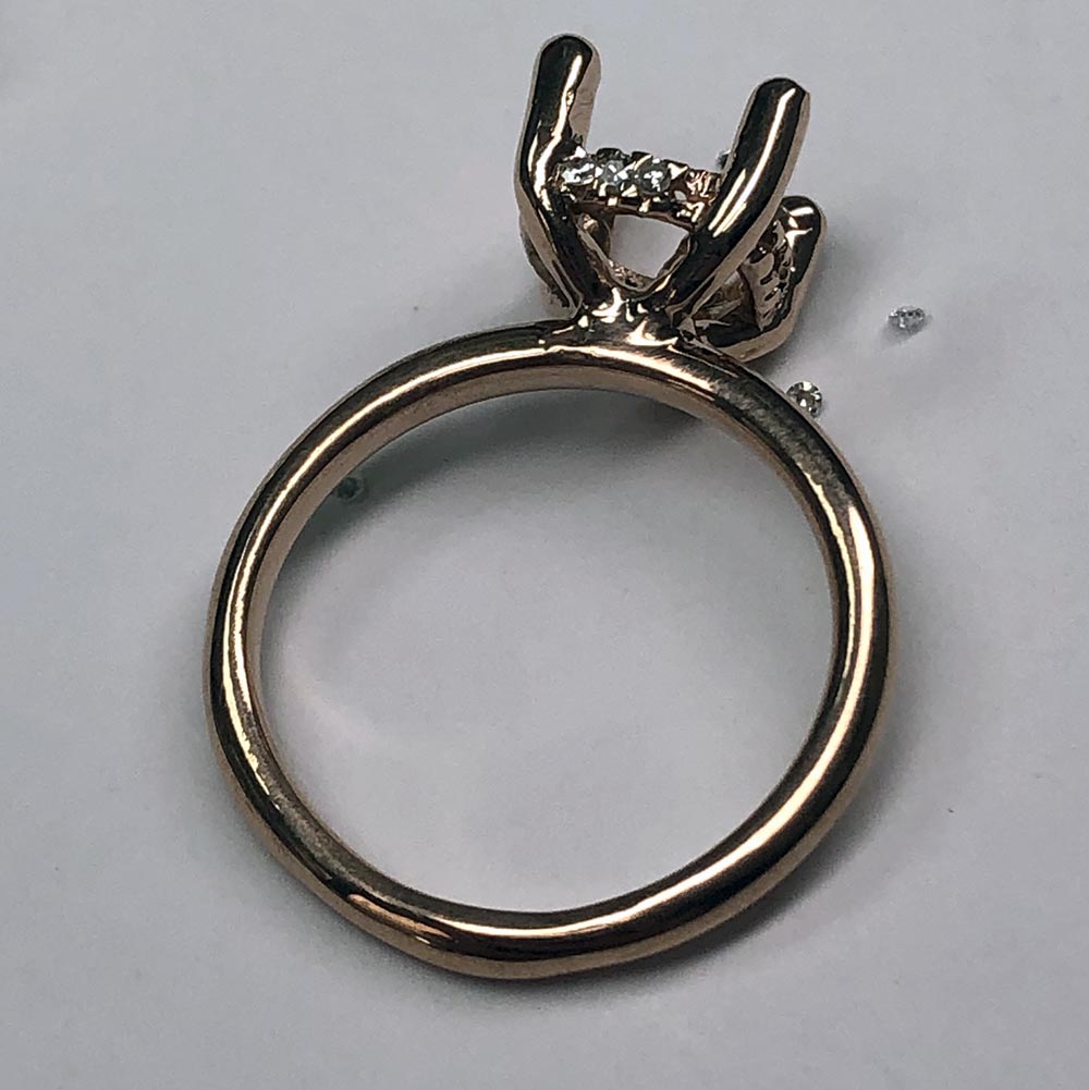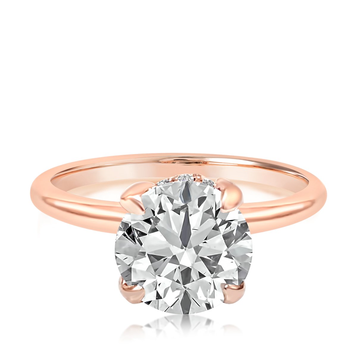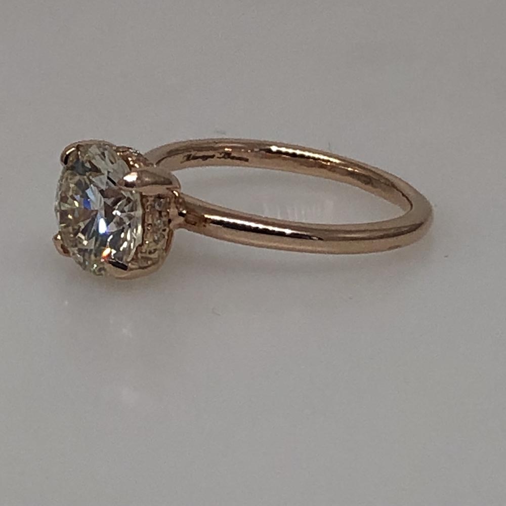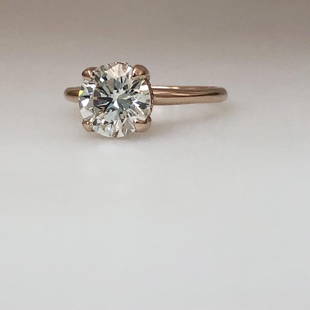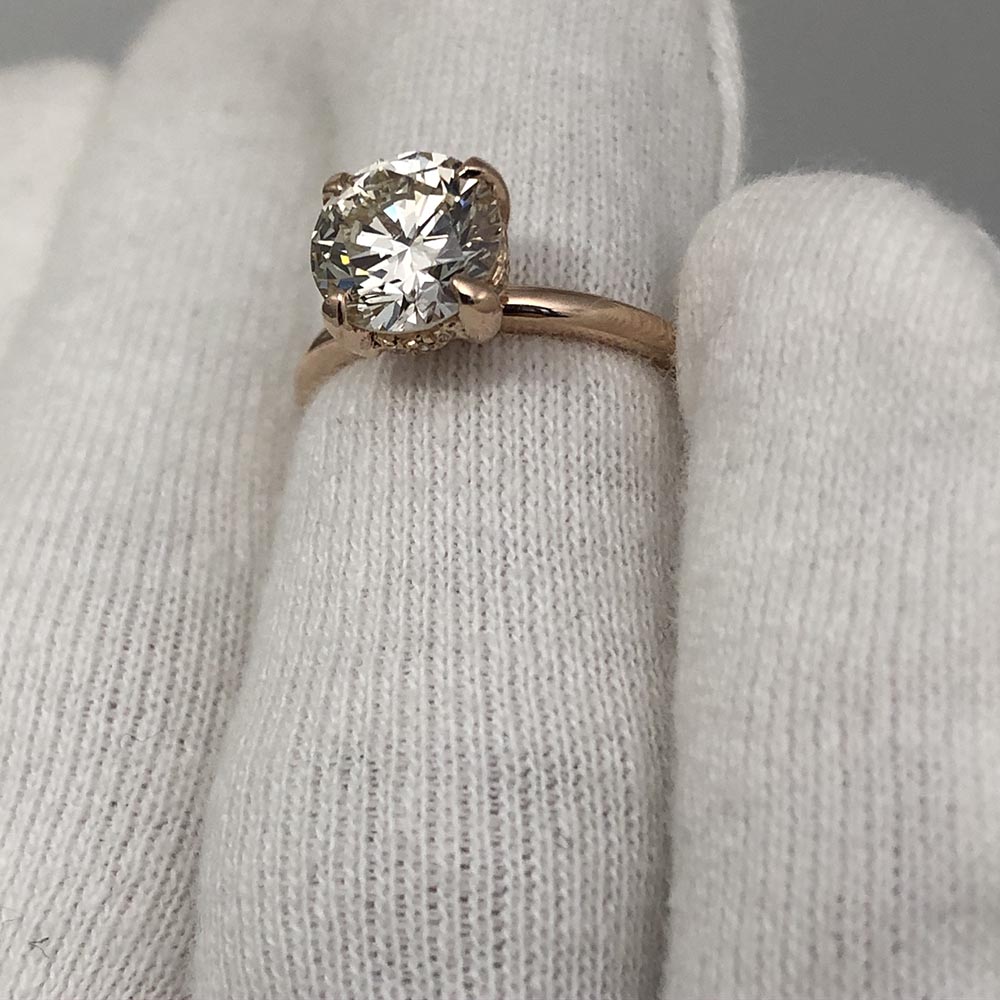 14K Pink Gold Hidden Halo Engagement Ring is surrounded underneath with a ring of diamonds.
