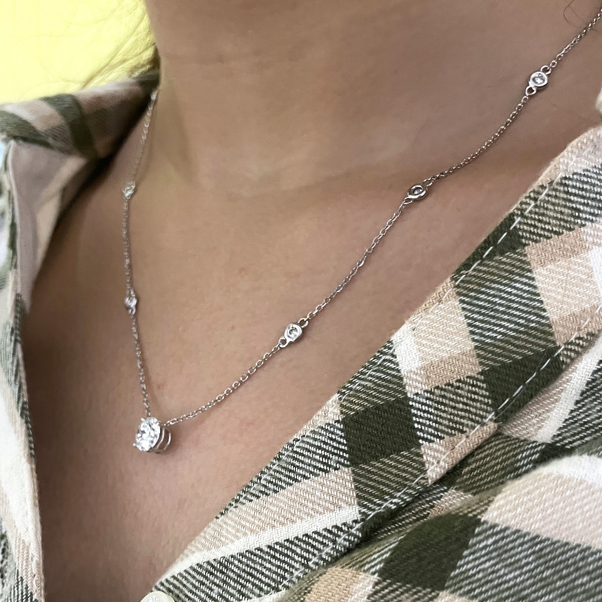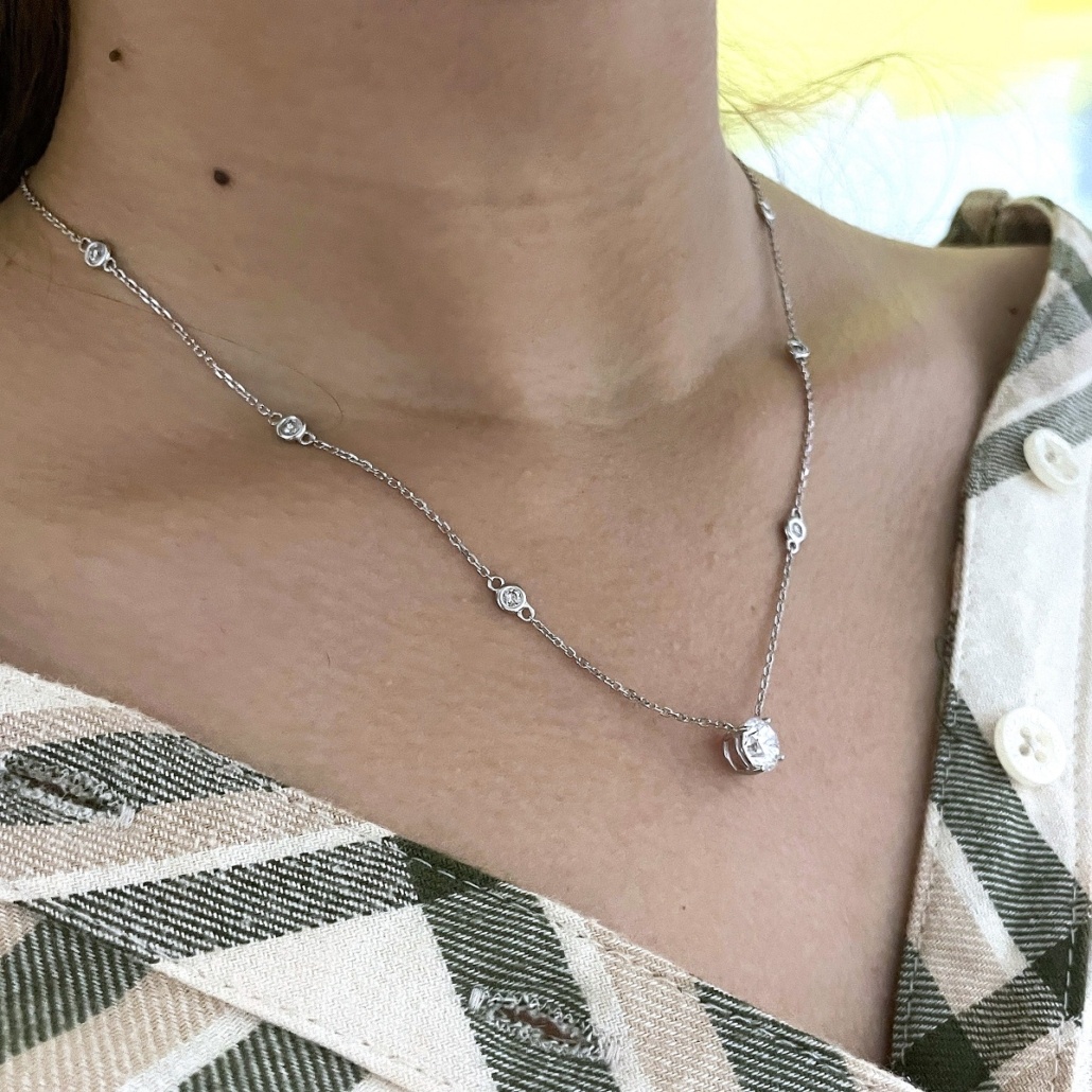 Tags 14k White, bezel, Chain, Desire, Diamond, Diamond Cut Cable, Elegant, Four Prong, Necklace, Pendant, Stones on Chain