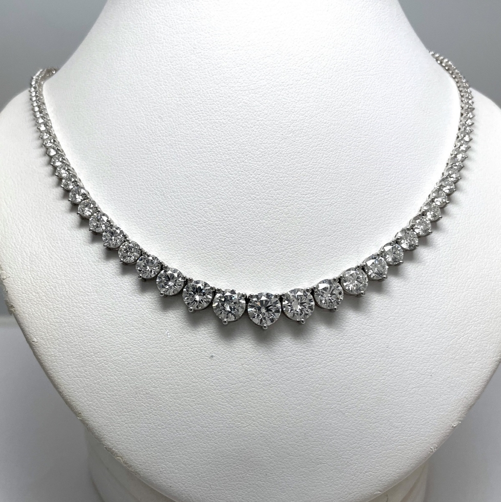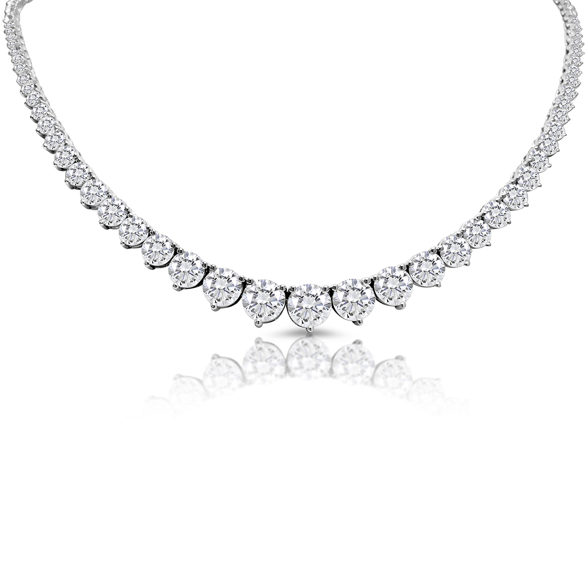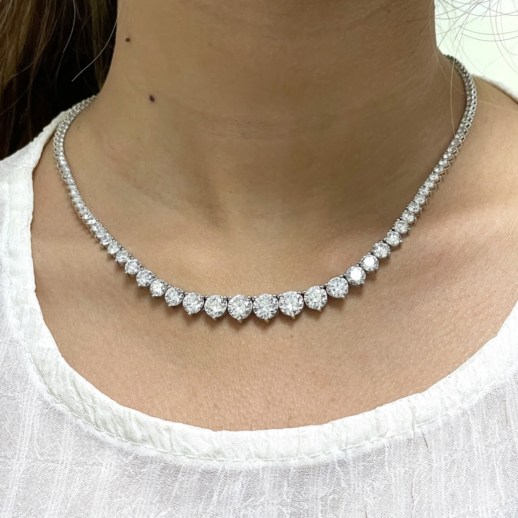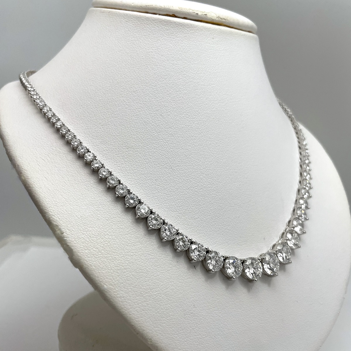 This exquisite piece features a graduated sequence of brilliant-cut diamonds that gracefully encircle the neckline, intensifying in size toward the center for a dramatic yet refined finish.
