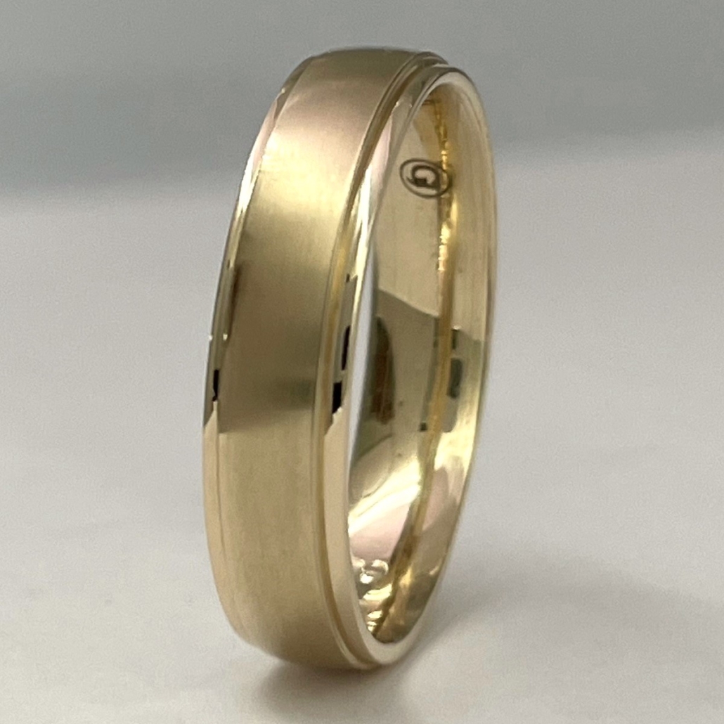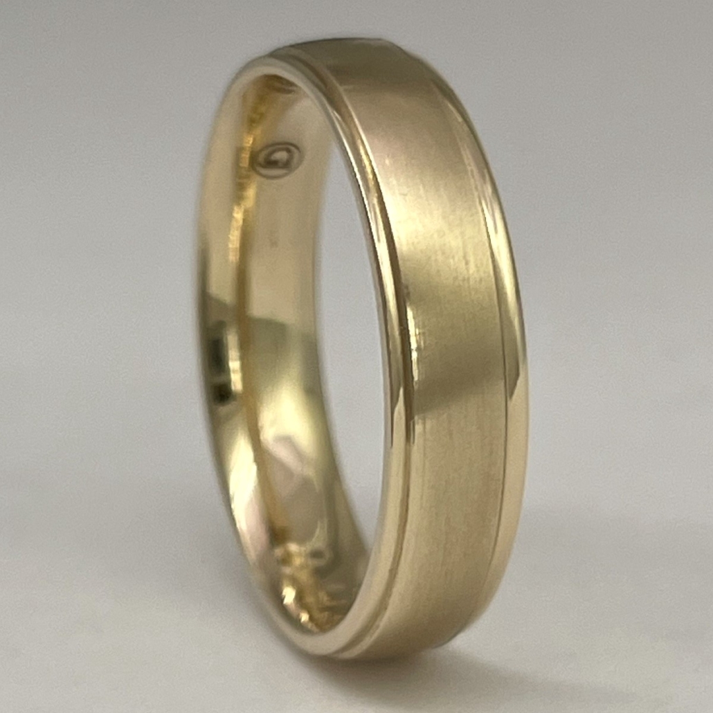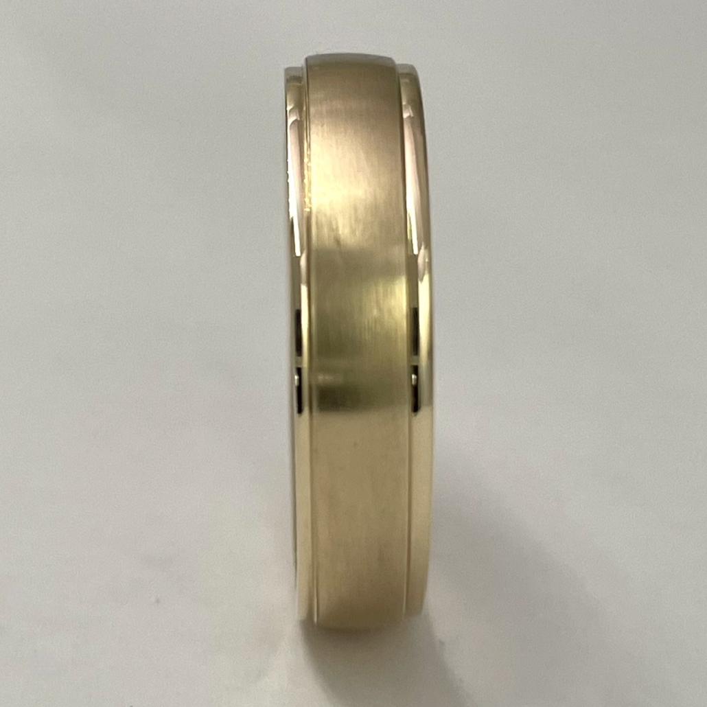 This ring is made with 14k yellow gold and two ridge lines at top and bottom.