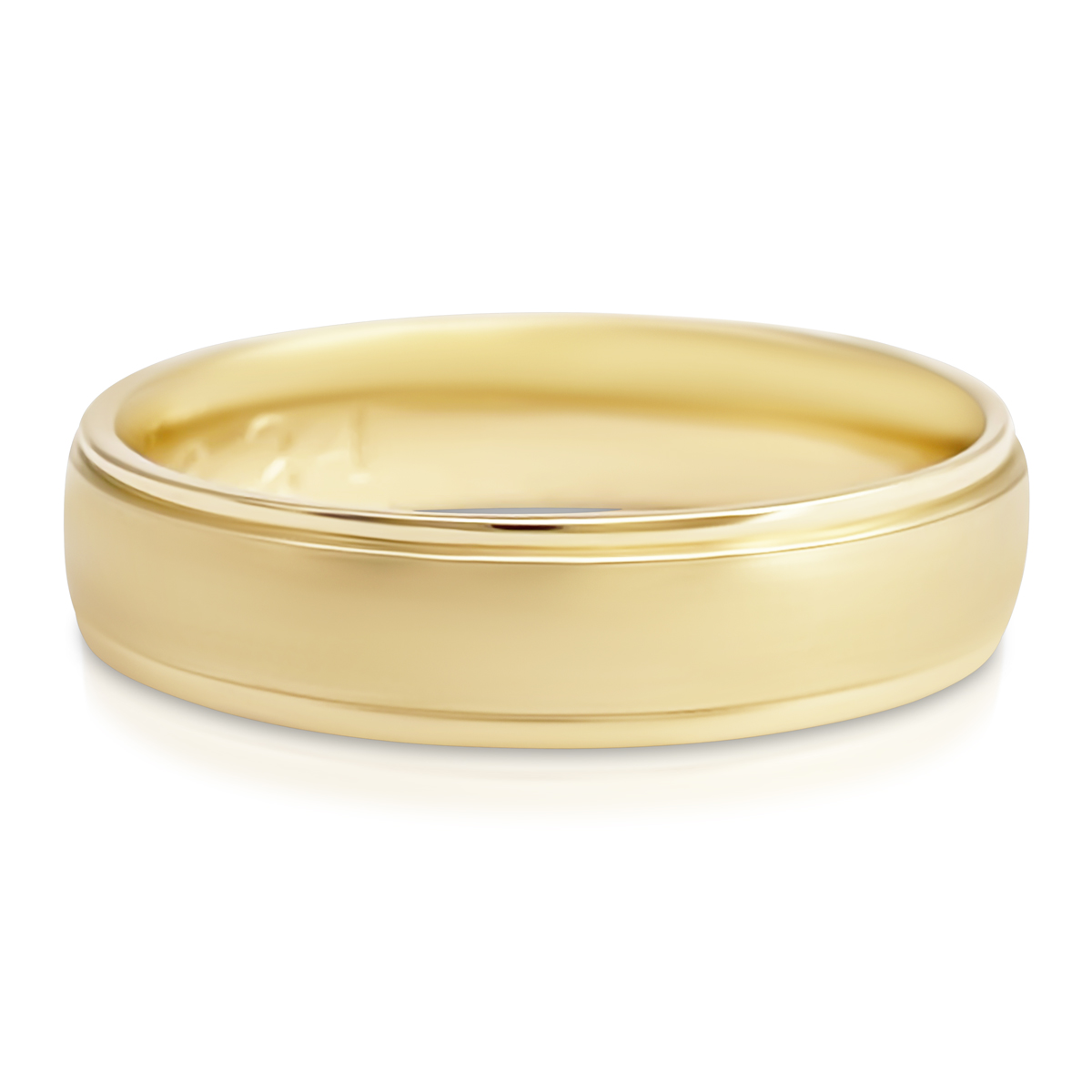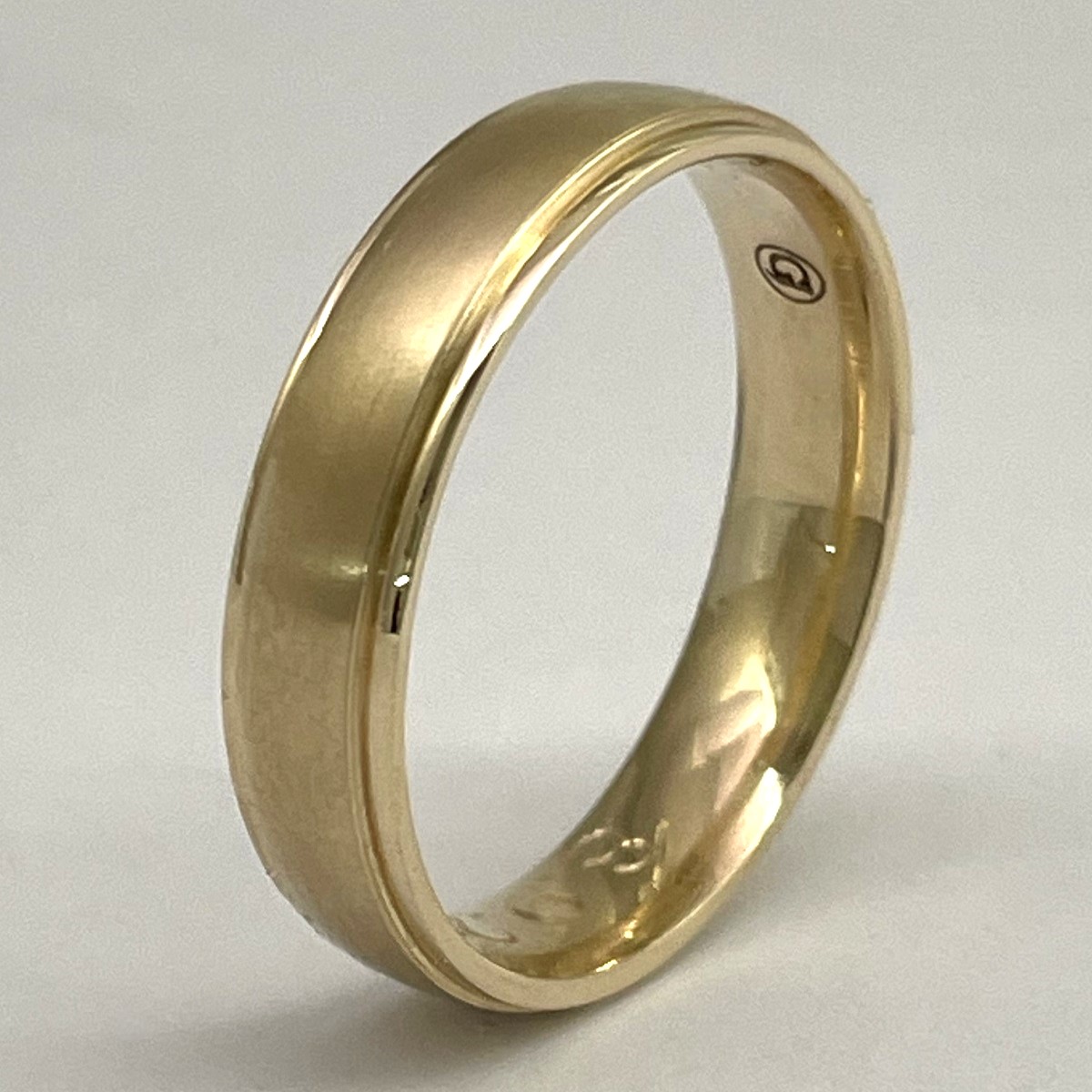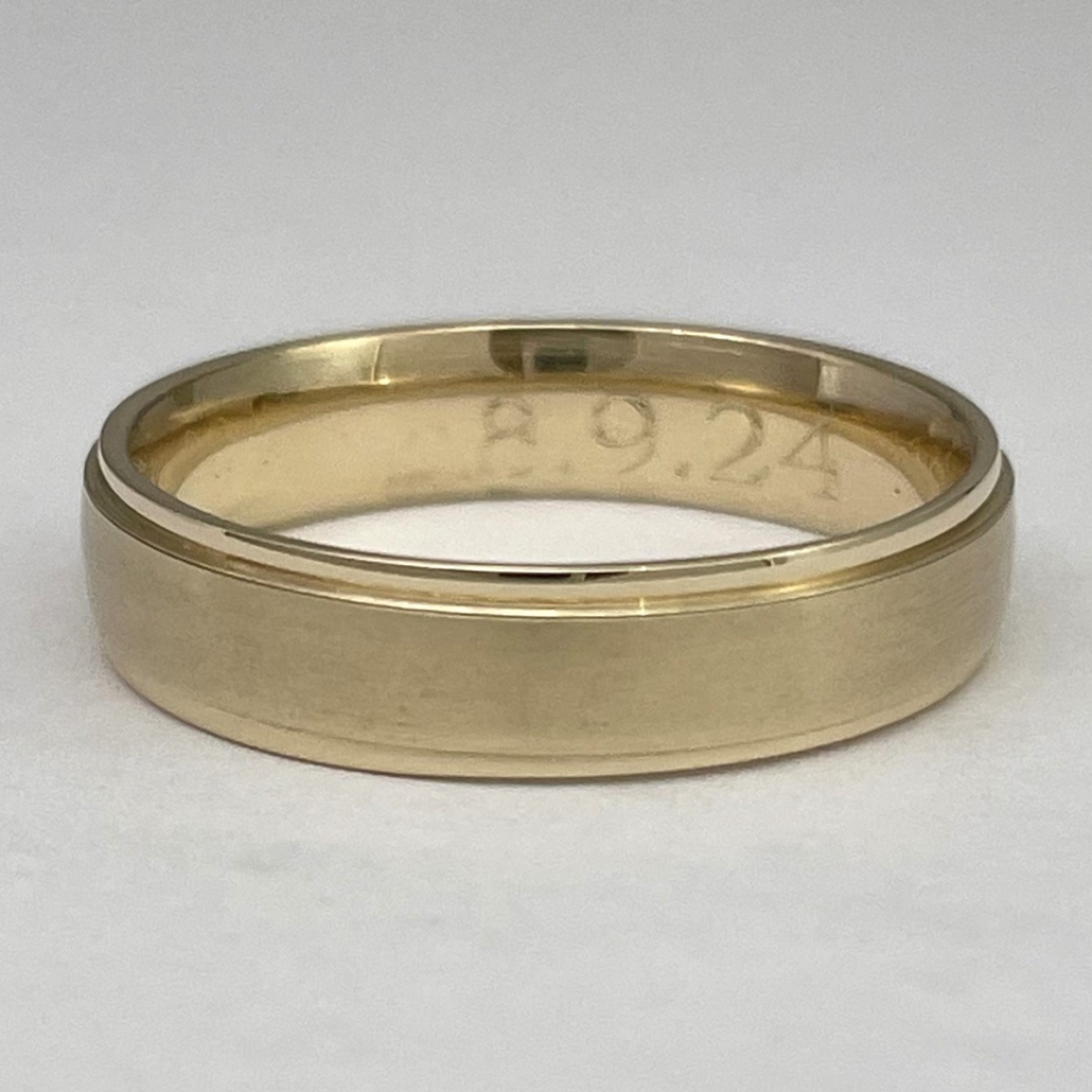 This ring is made with 14k yellow gold and two ridge lines at top and bottom.