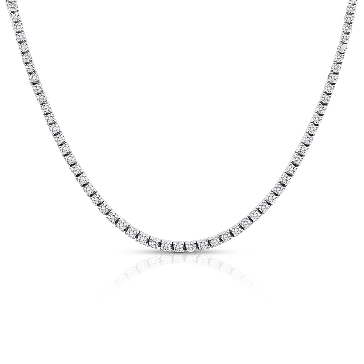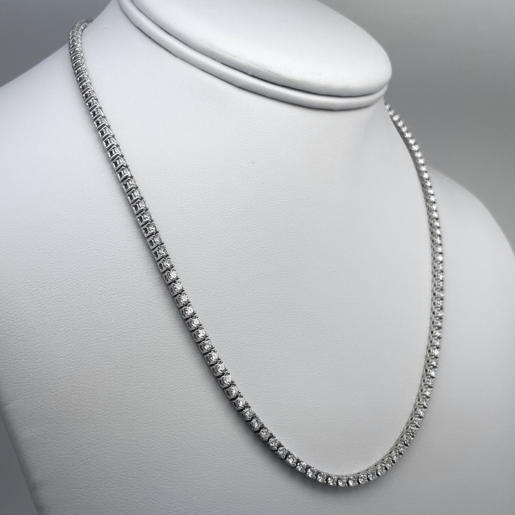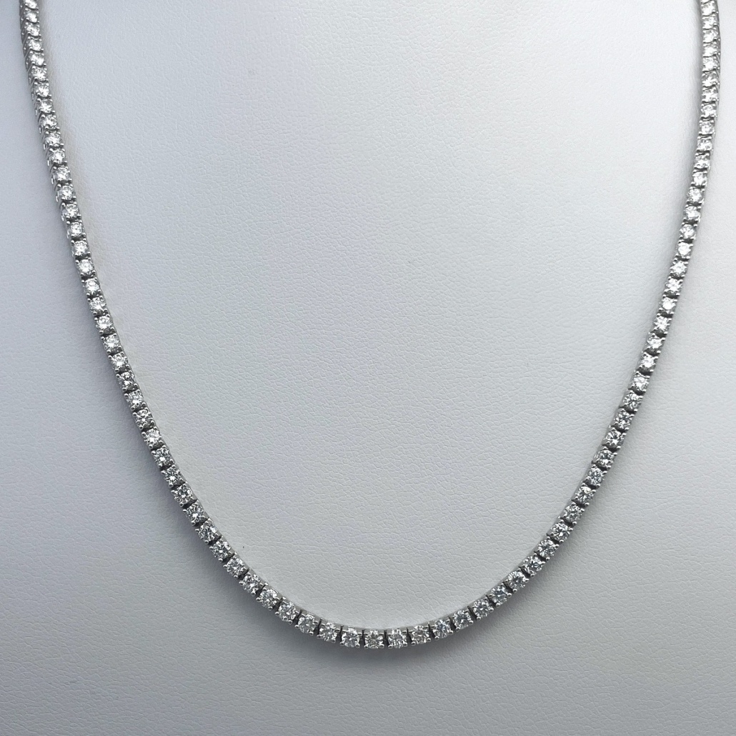 A seamless row of hand-set diamonds, crafted in perfect proportion to lay gracefully along the neckline. This classic tennis necklace is effortless elegance—refined, radiant, and ready for every occasion.