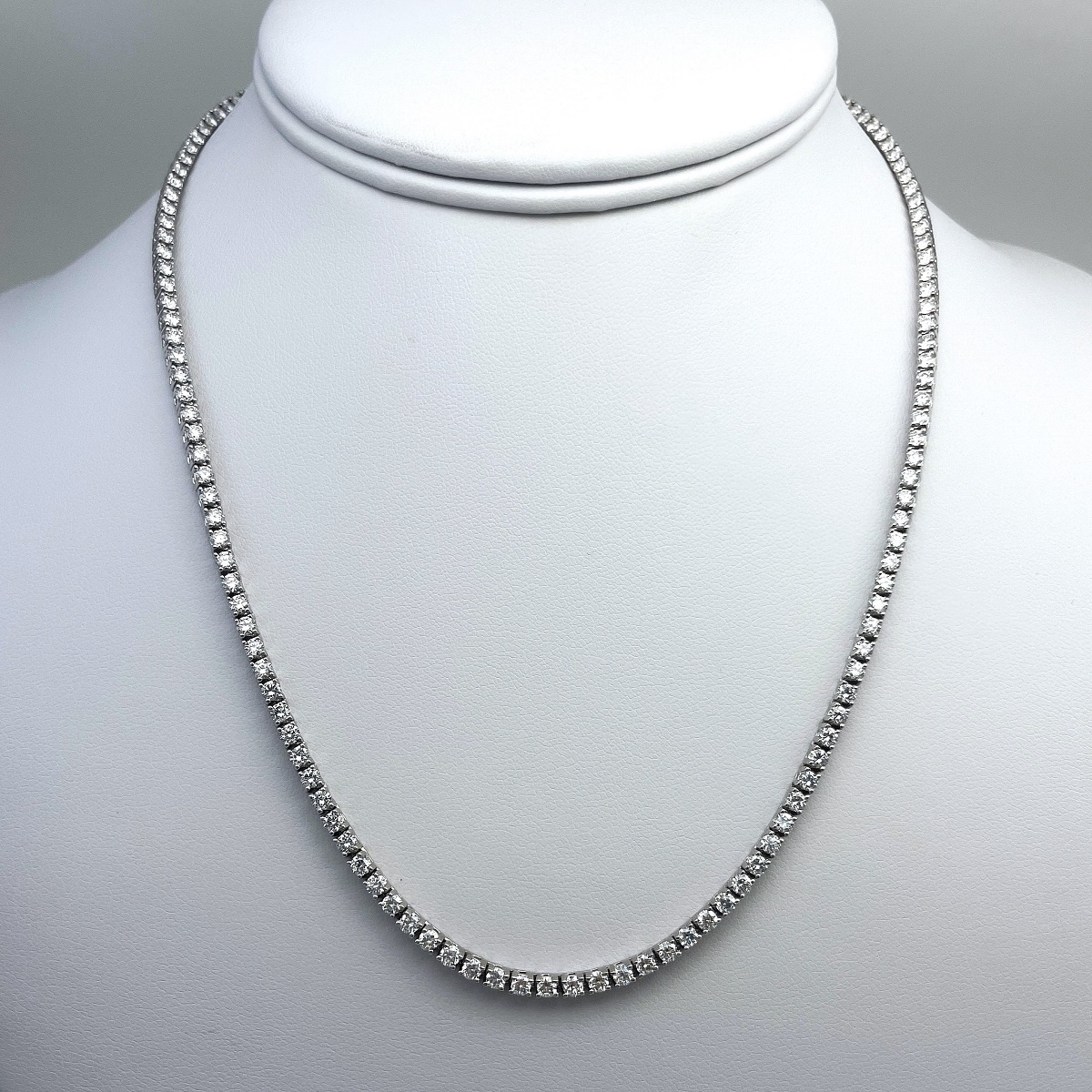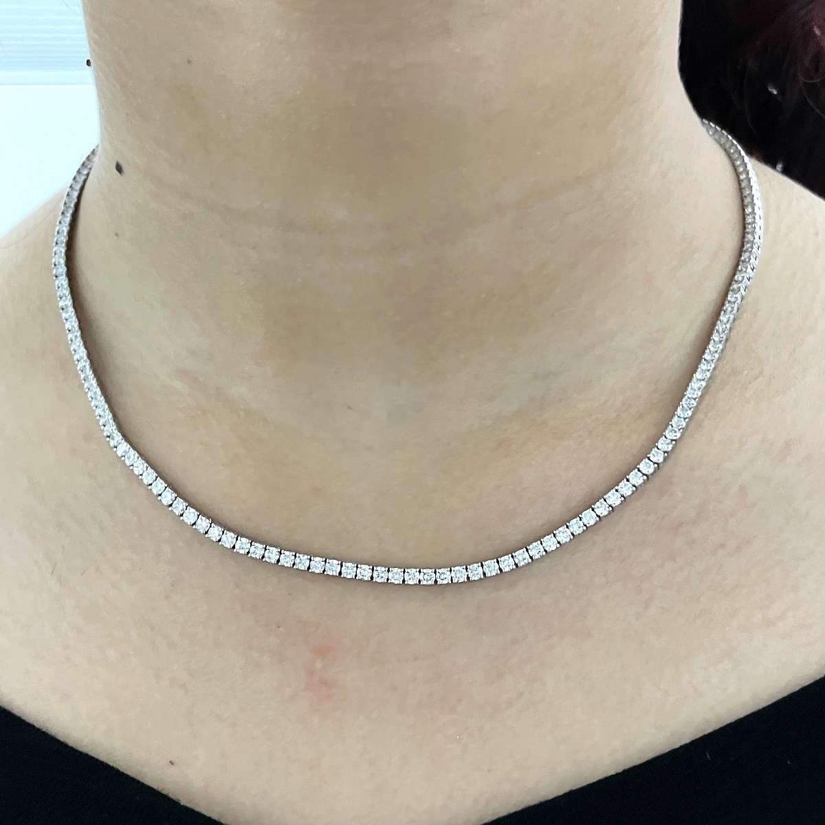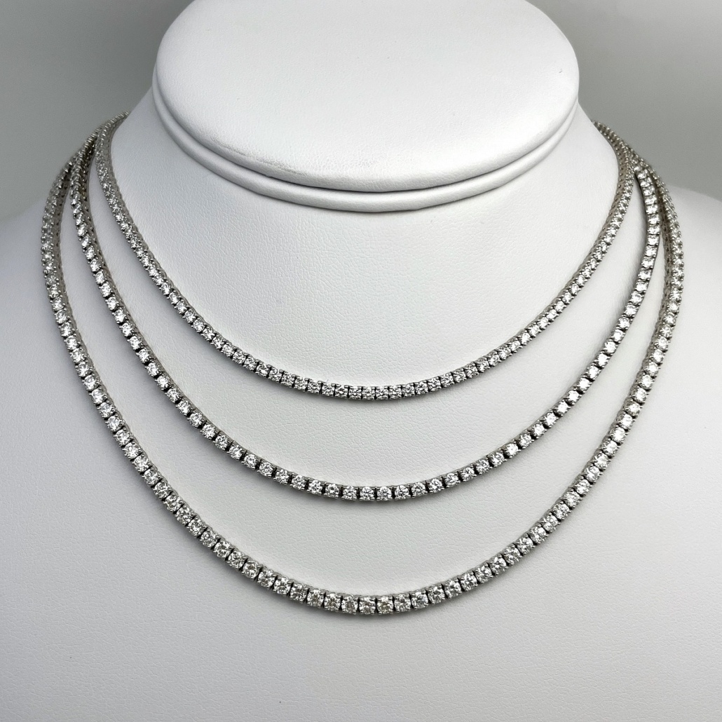 A seamless row of hand-set diamonds, crafted in perfect proportion to lay gracefully along the neckline. This classic tennis necklace is effortless elegance—refined, radiant, and ready for every occasion.