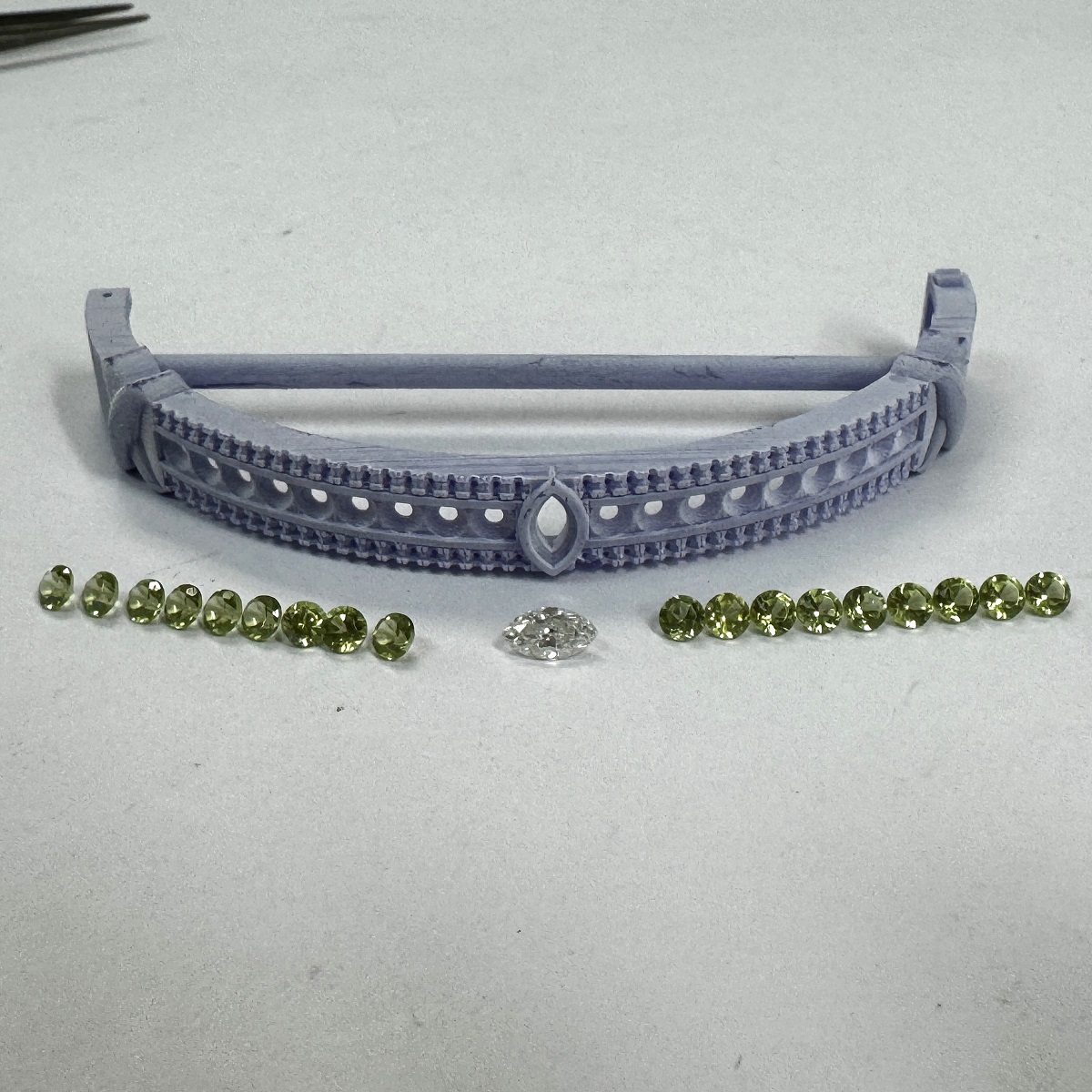 A brilliant row of vivid green peridots—the gem of renewal and positivity—is framed in pavé-set diamonds, with a marquise-cut diamond at the center like a guiding star.