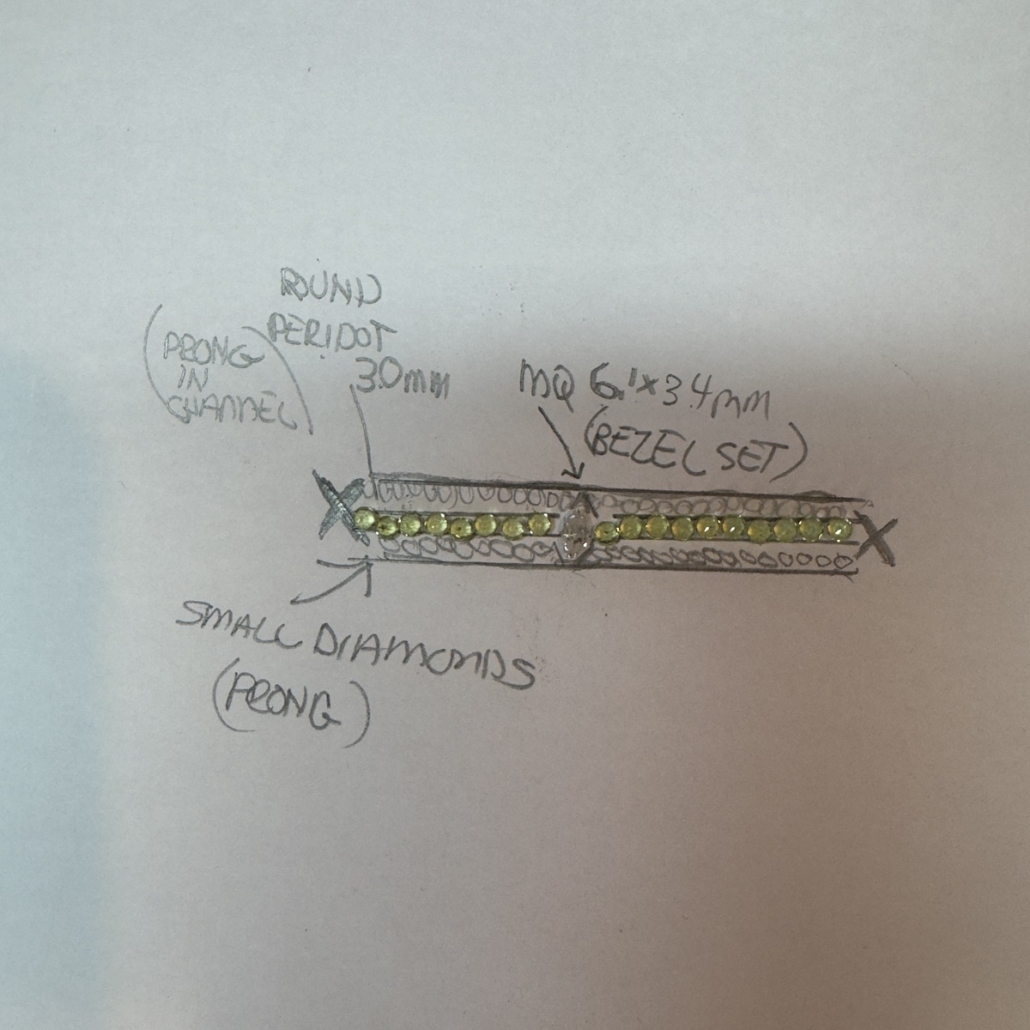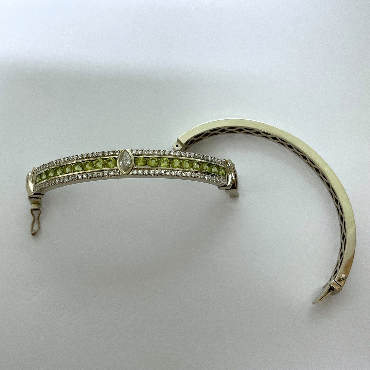 Tags 14k White Gold, Bangle, Bracelet, Channel Set, cuff, Diamond, Handcrafted, Marquise, Peridot