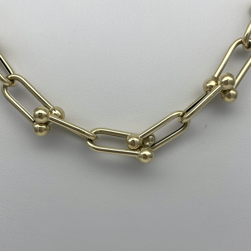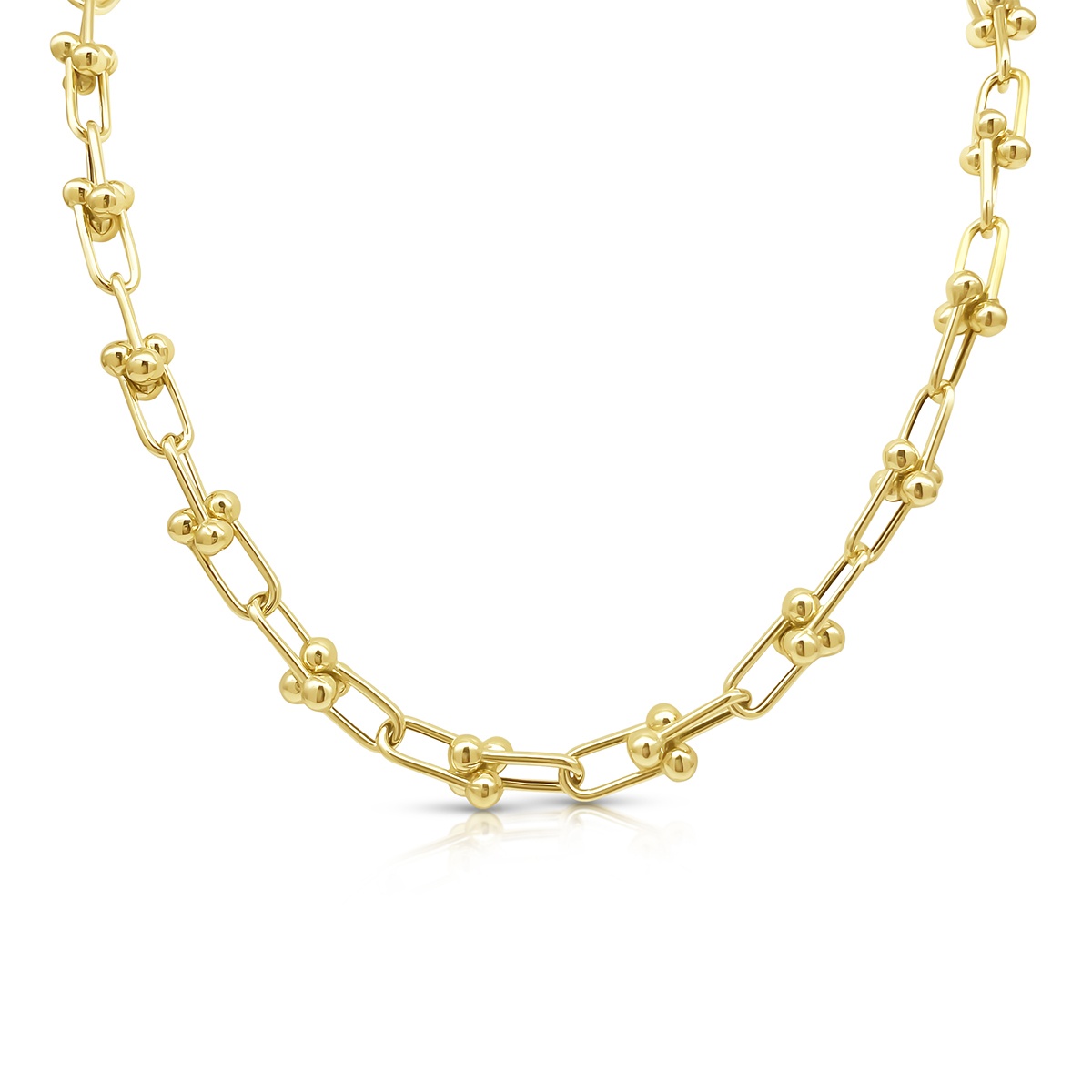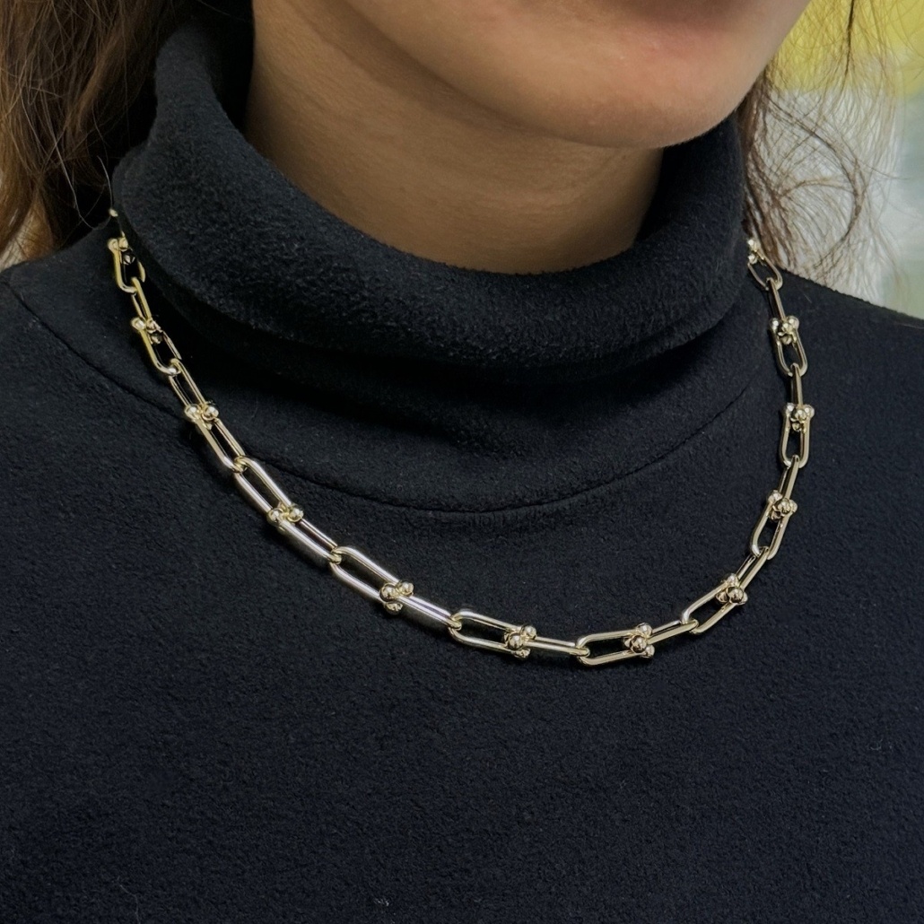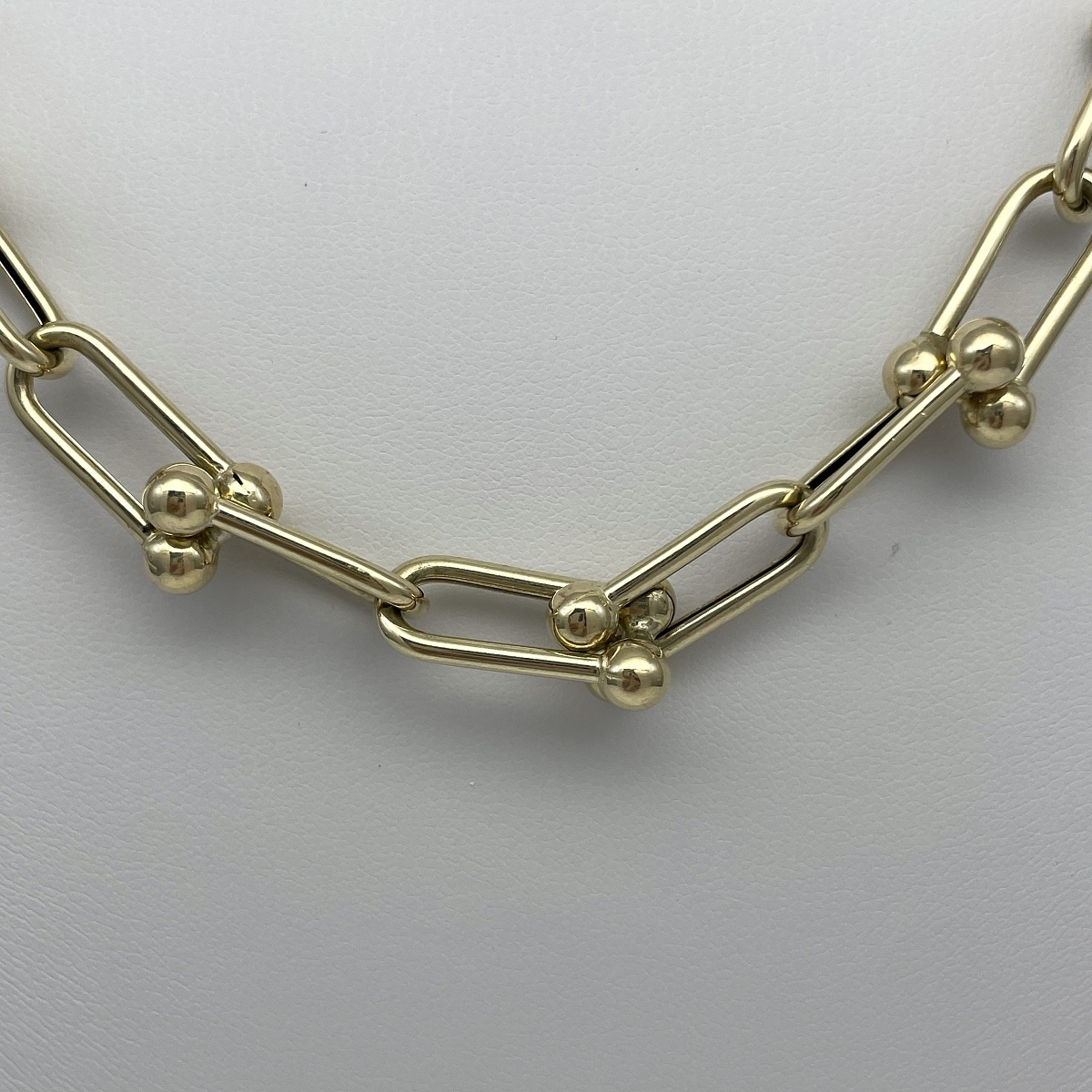 This necklace is made with 14k yellow gold the links are oblong shape. Each link is set apart by bead clusters that give structure and rhythm to the design.