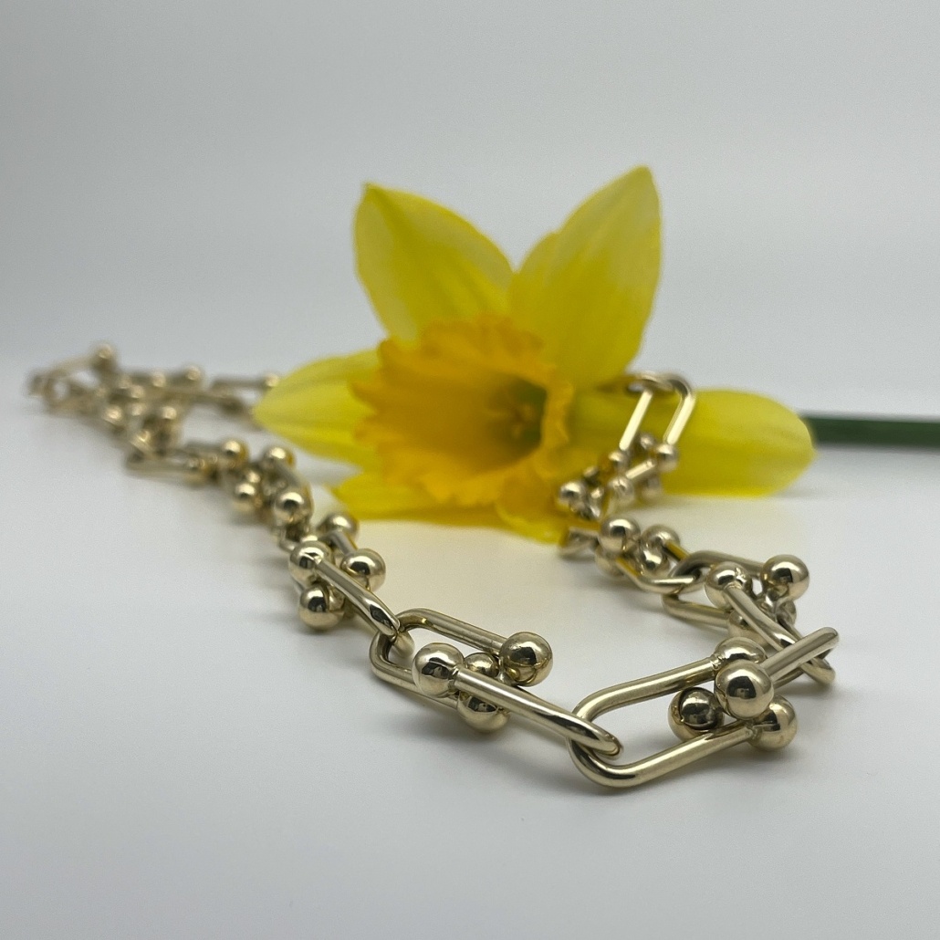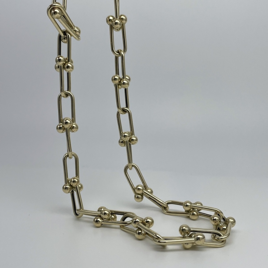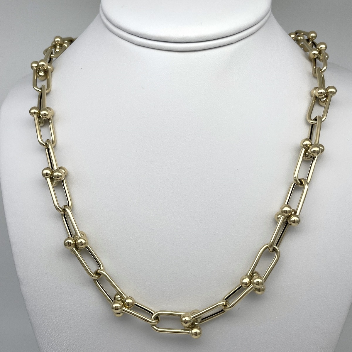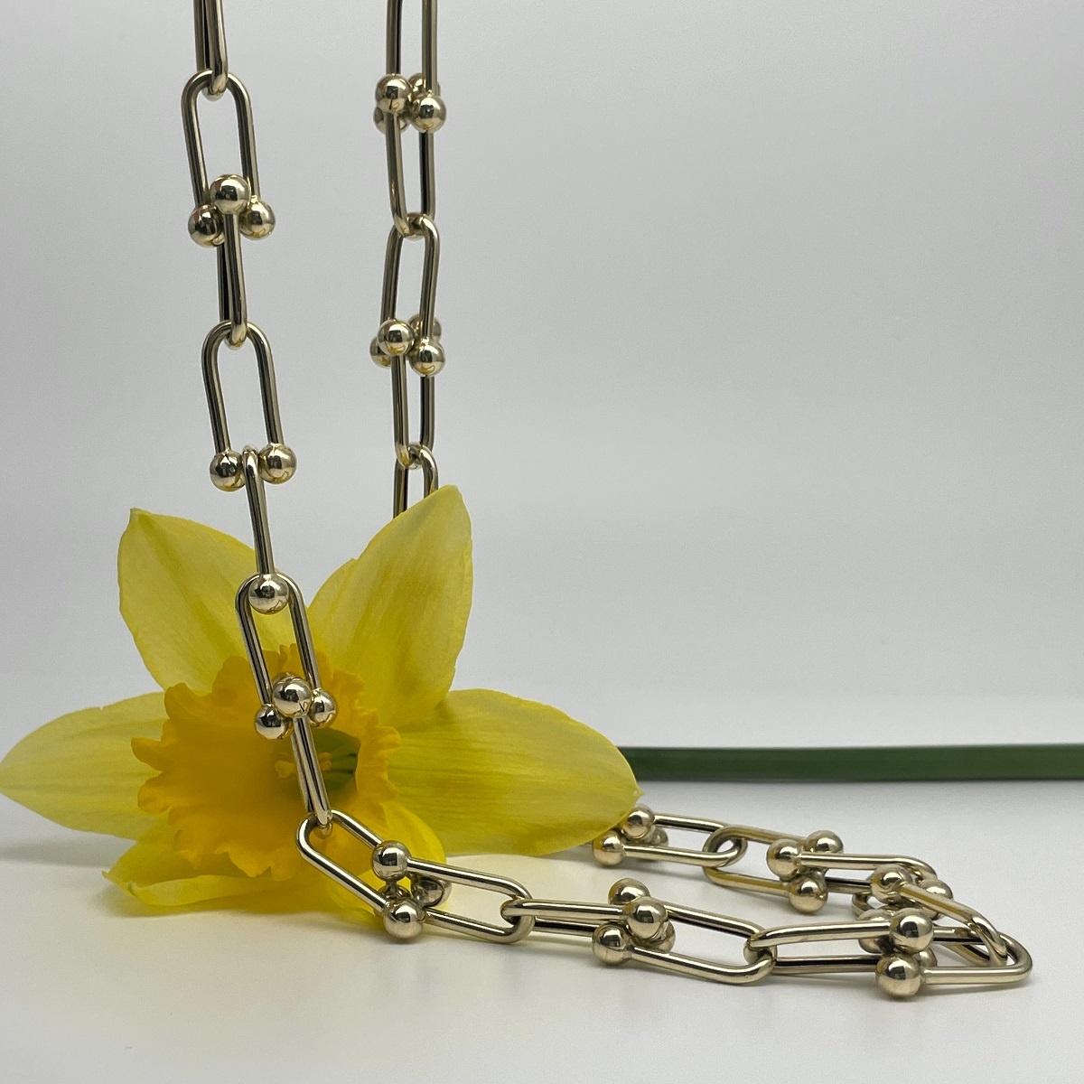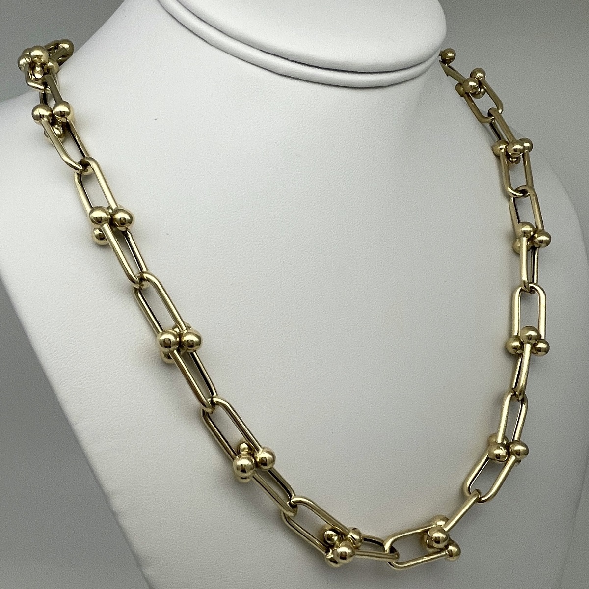 This necklace is made with 14k yellow gold the links are oblong shape. Each link is set apart by bead clusters that give structure and rhythm to the design.