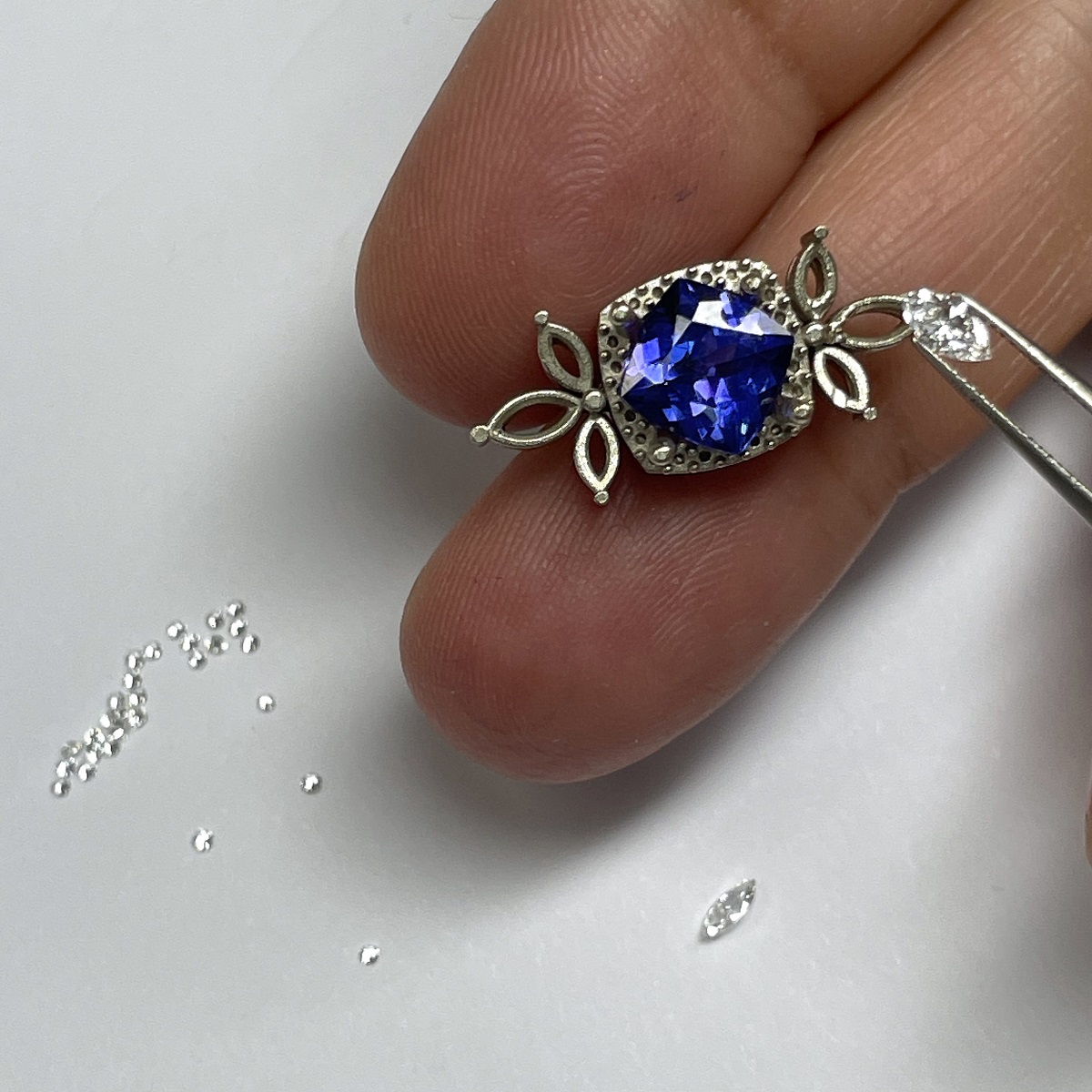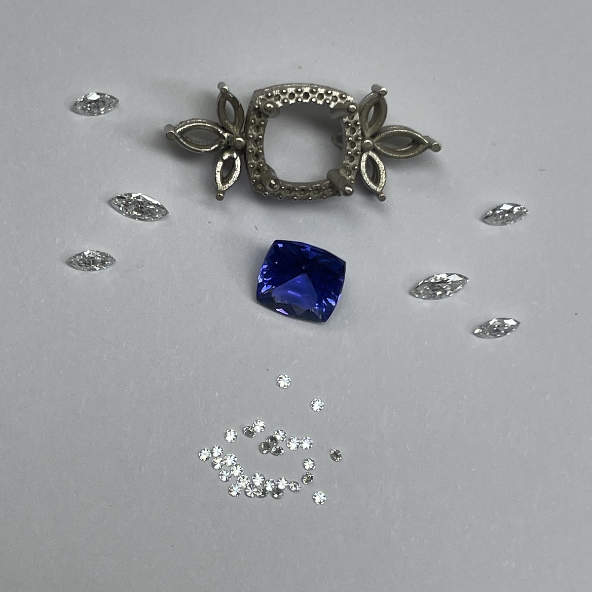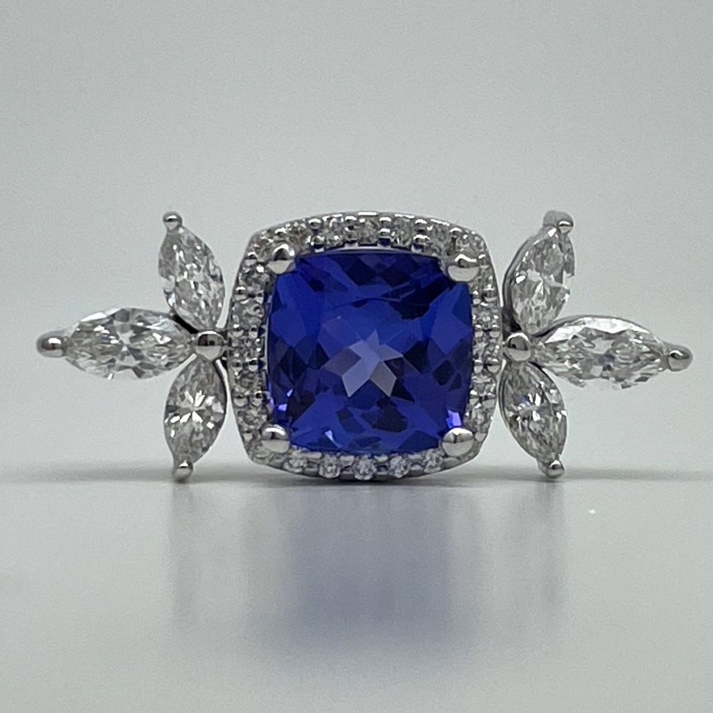 Tags 14k White, Blue, Checkerboard, Diamond, Four Prongs, gemstone, Halo, Marquise, Shared Prongs, tanzanite