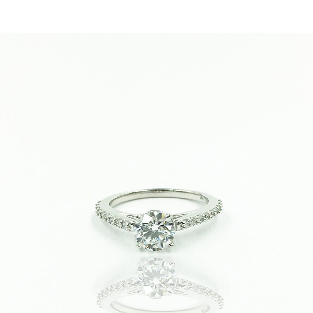 This cathedral style engagement ring is 18k plumb white gold and features a natural round brilliant diamond as the center stone.