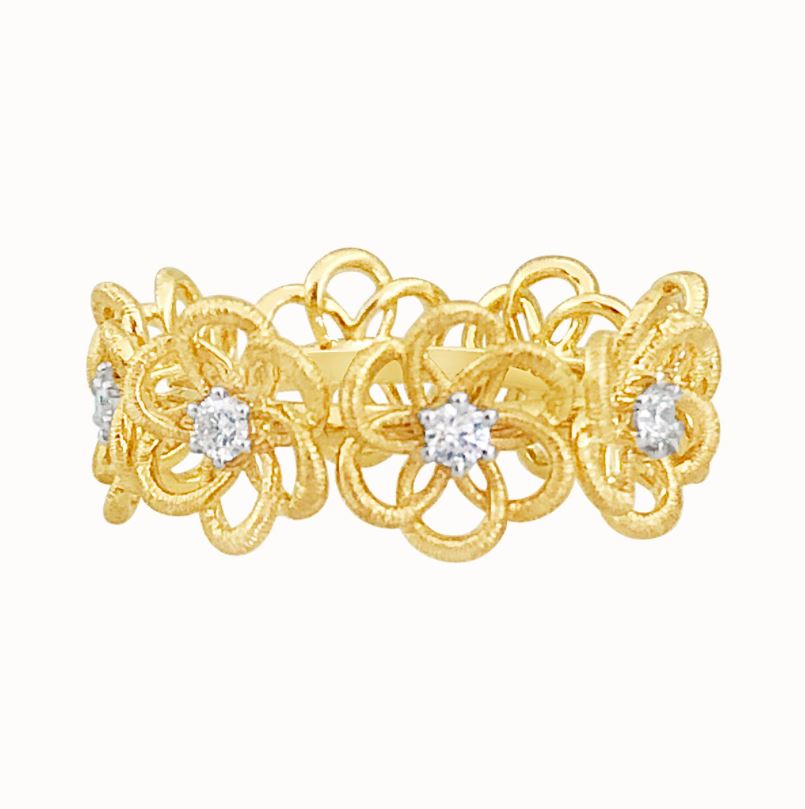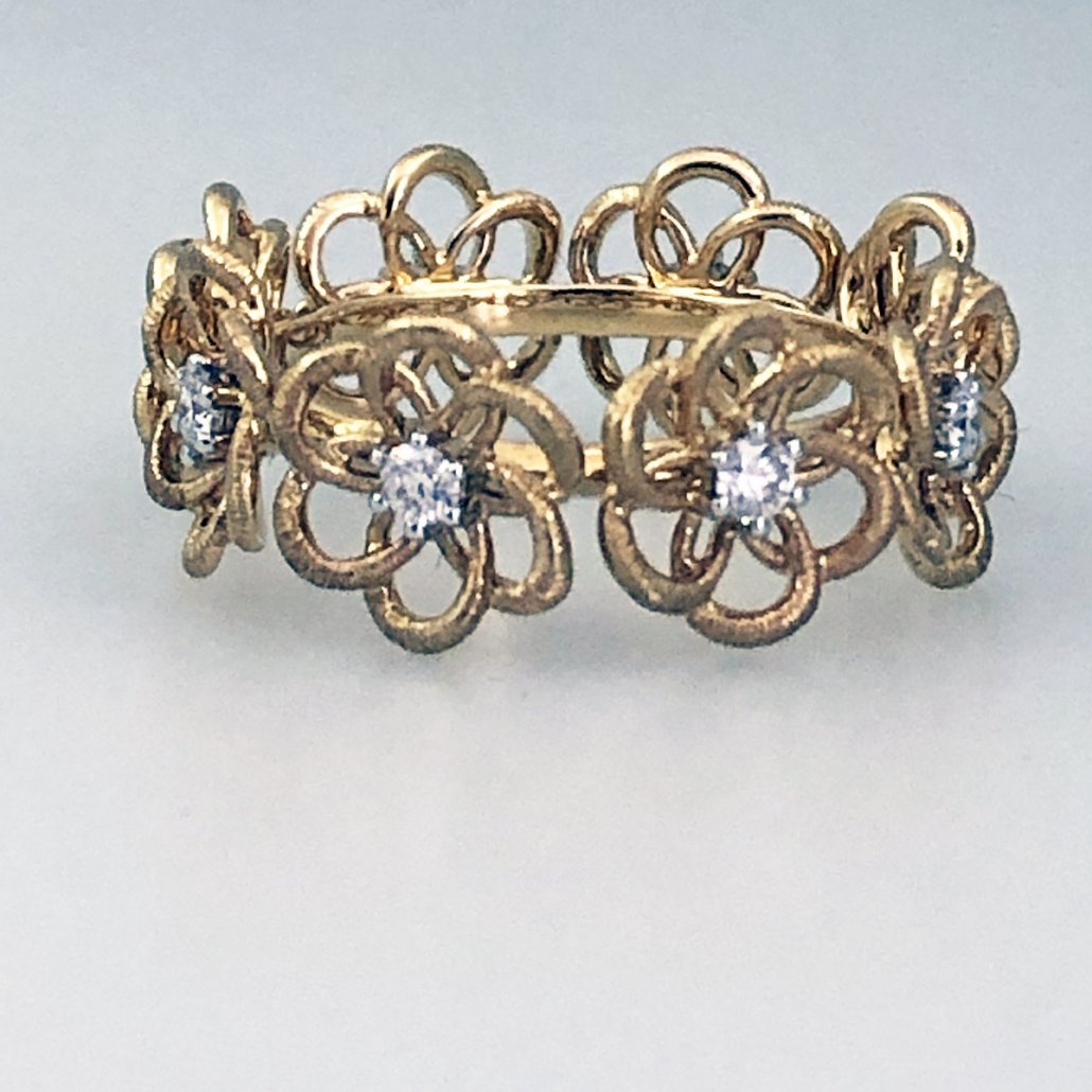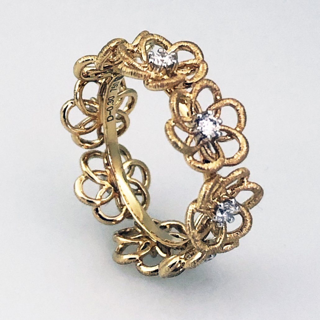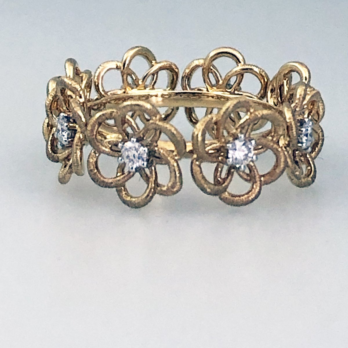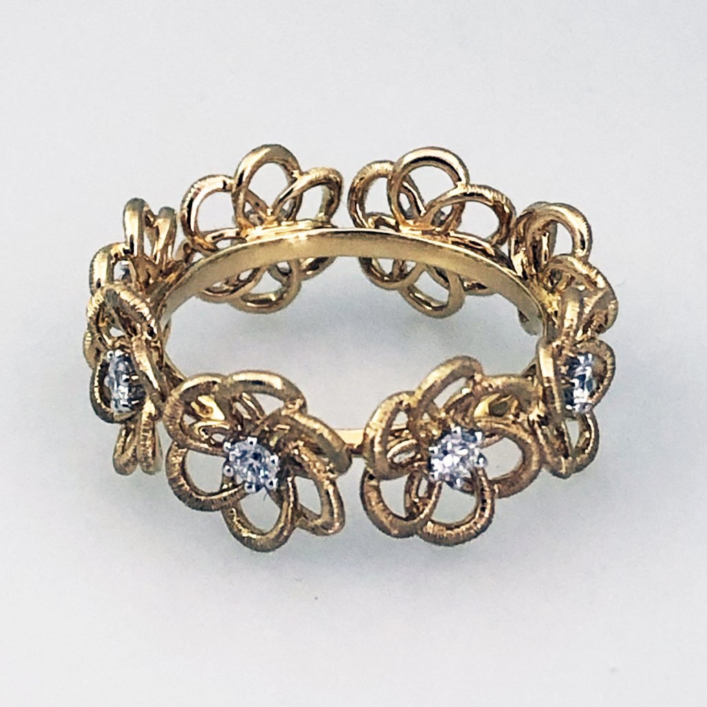 Eight flowers with diamond centers are made from gold loops. Vintage look and feel with warm yellow gold!