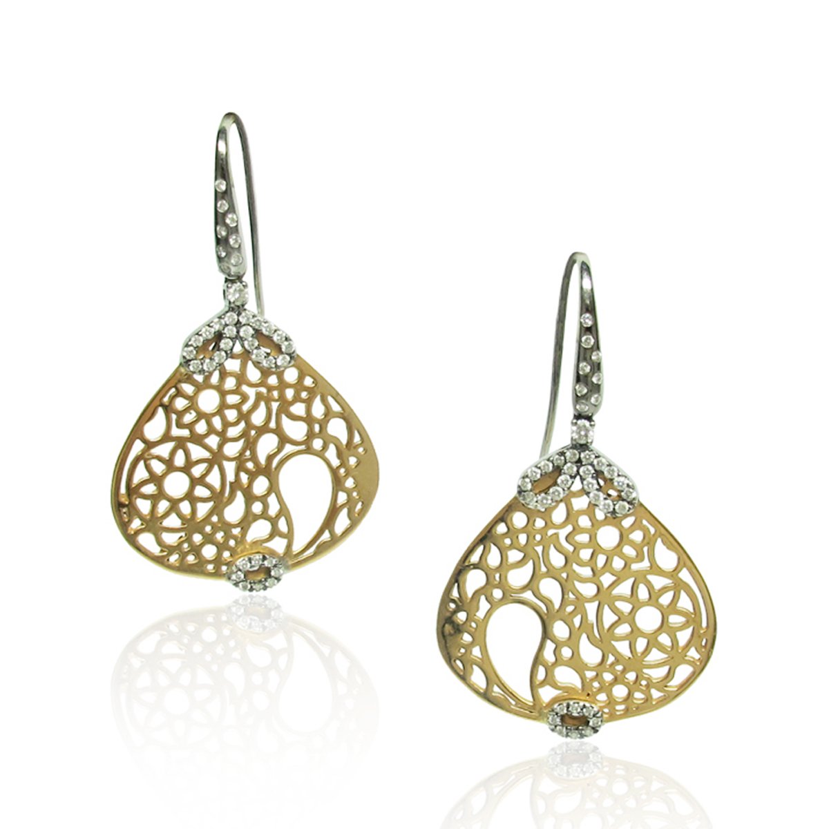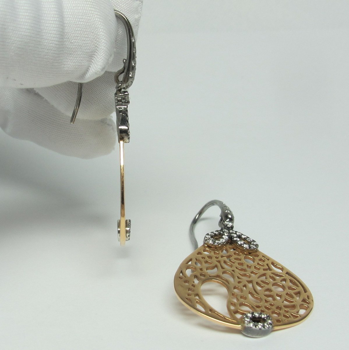 Pink Gold & Diamond Drop Earrings with delicate gold and floral filigree design.